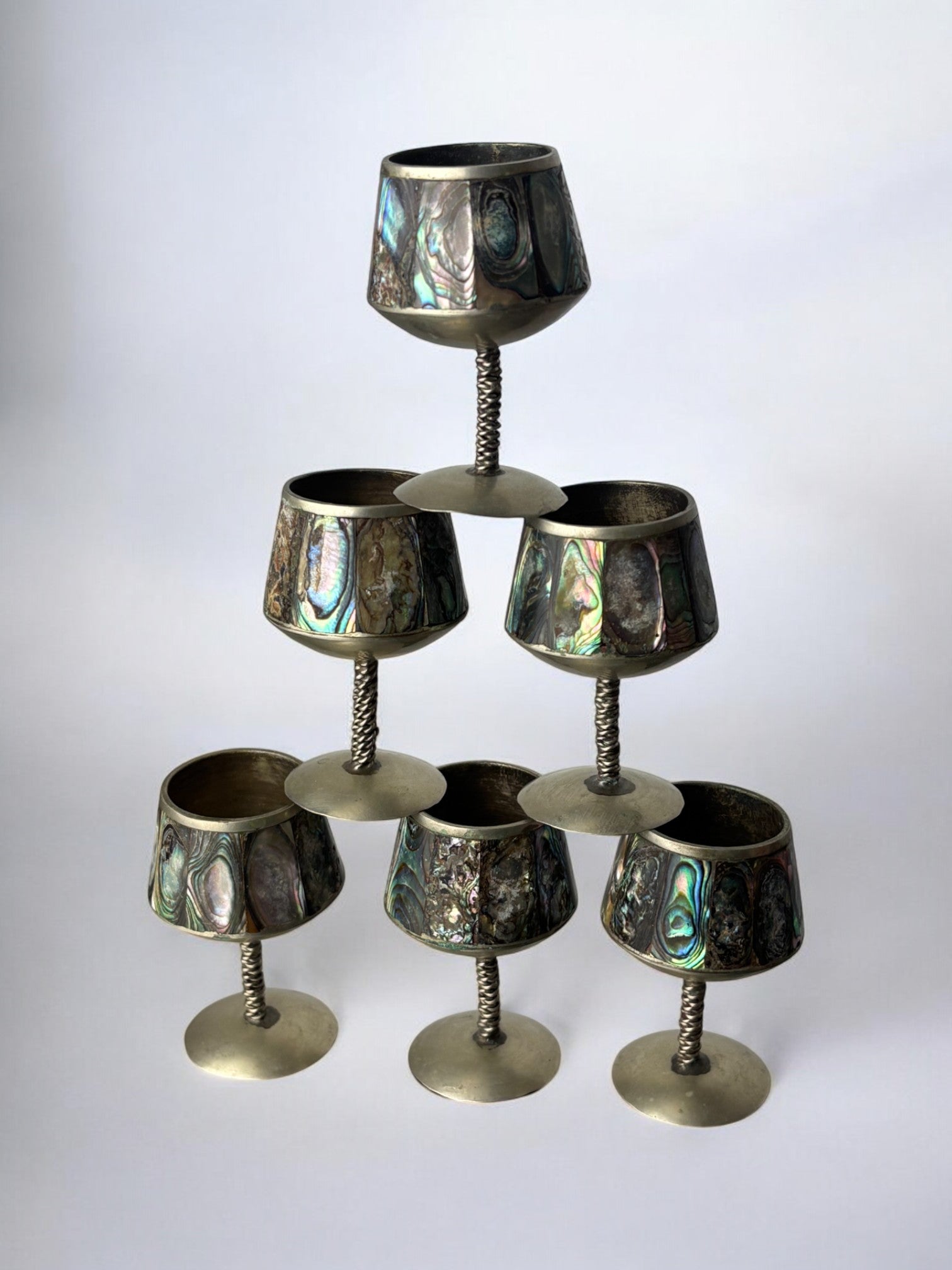 Superb set of 6 shot glasses designed and produced in Mexico during the 1970's. This artisanal set with abalone mother-of-pearl and alpaca, is a true work of art. A beautiful set to display in your home, it remains in perfect condition with no missing pieces. Ref:2164. Dimensions: H6,5 x 4° cm