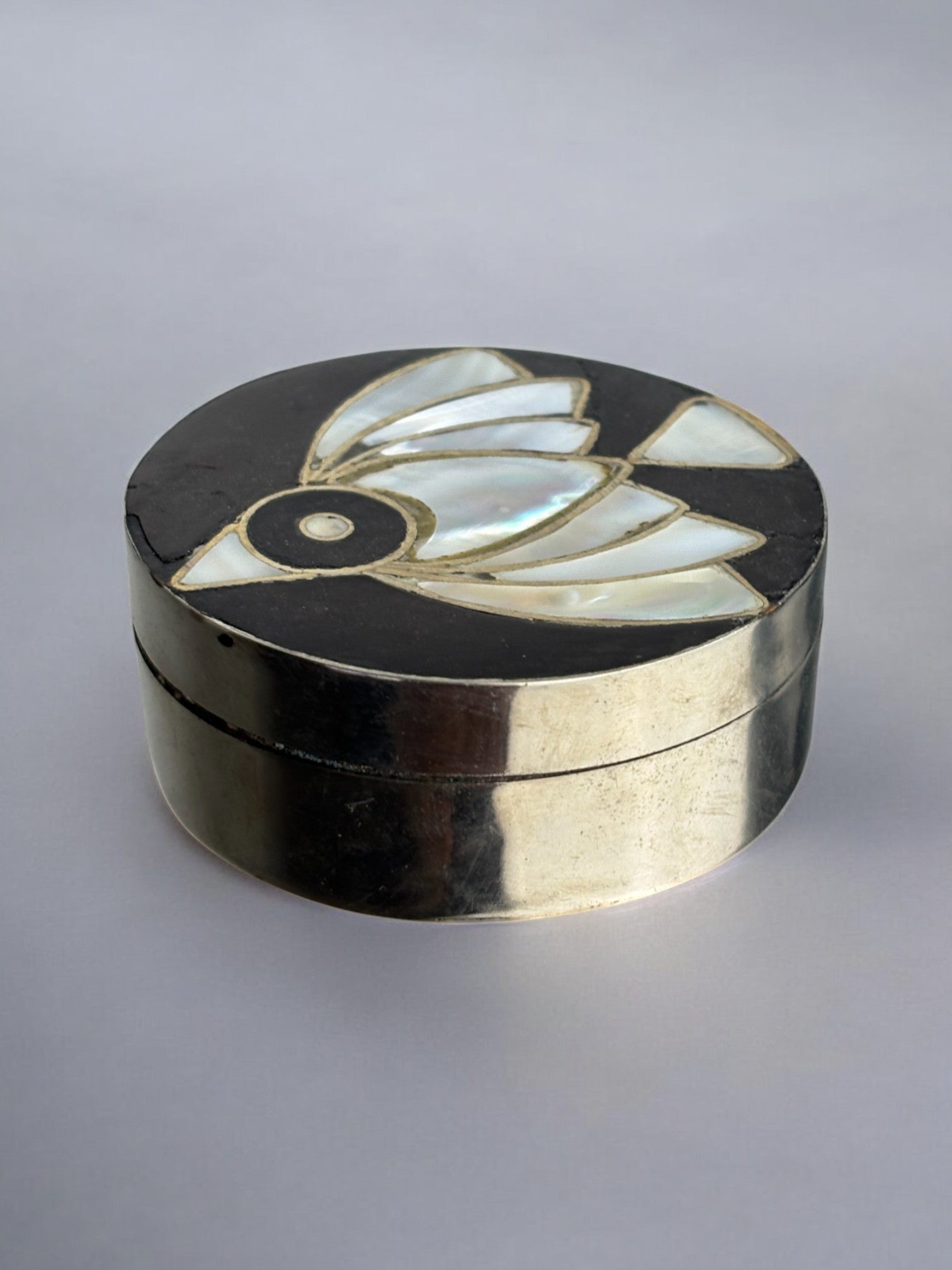 Beautiful circular pill box with a fish designed and produced in Mexico during the 1970's. This artisanal set with abalone mother-of-pearl and alpaca, is a true work of art. Ref:1953. Dimensions: H2,5 x 7°cm