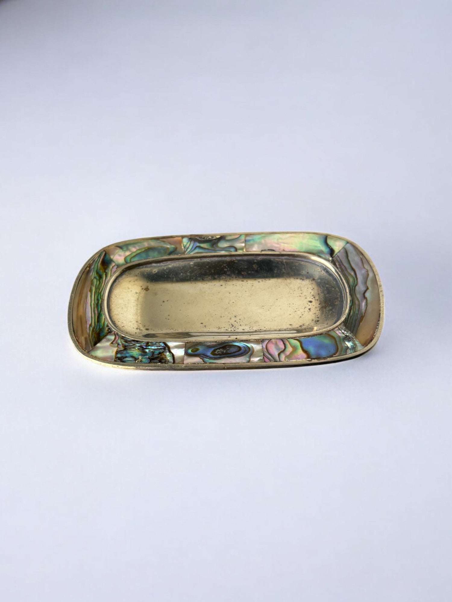 Beautiful tray designed and produced in Mexico during the 1970's. This artisanal object with abalone mother-of-pearl and alpaca, is a true work of art. A beautiful item to display in your home, it remains in perfect condition with no missing pieces. Ref:1938. Dimensions: H0,2 x L9,5 x D5,5 cm