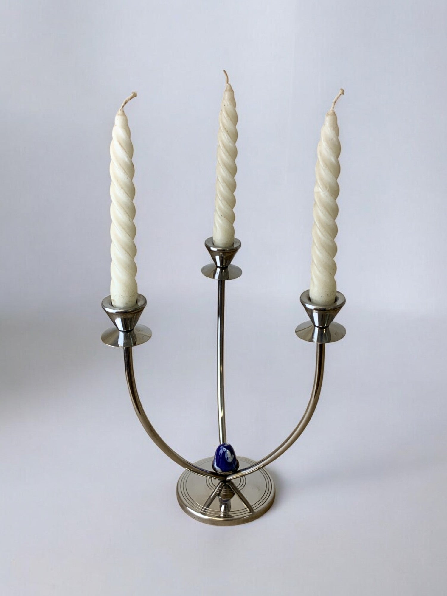 Art deco candlestick in stainless steel 3 flames and blue stones, Spain, Circa 1970's