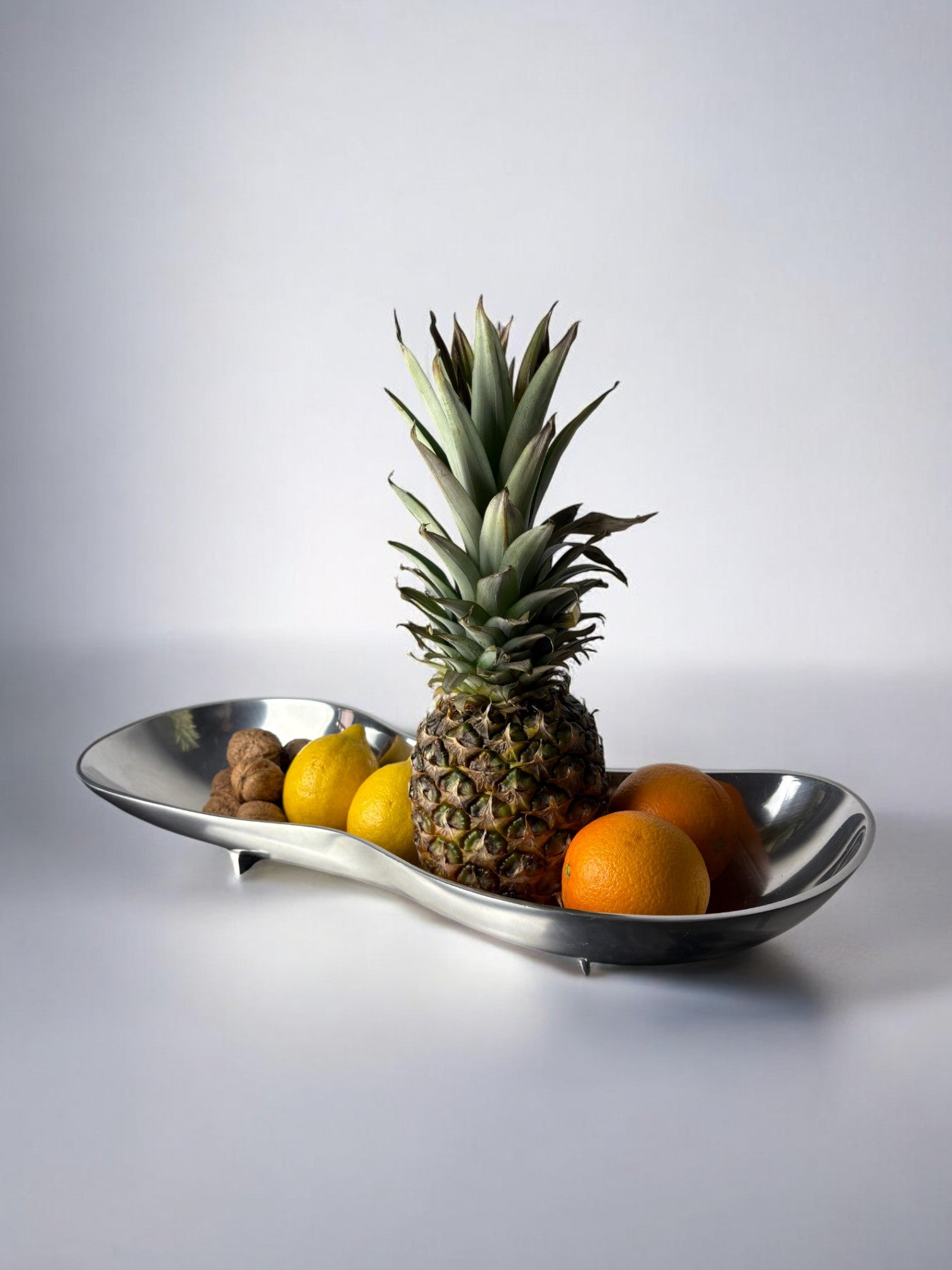 Beautiful and large Biomorphic centerpiece designed and produced in Spain, 1980's. Solid aluminum bowl with a curved organic shape. Superb craftsmanship. Rare design object that will elevate your interior. Ref: 2710. Dimensions: H9 x l53 x d19 cm