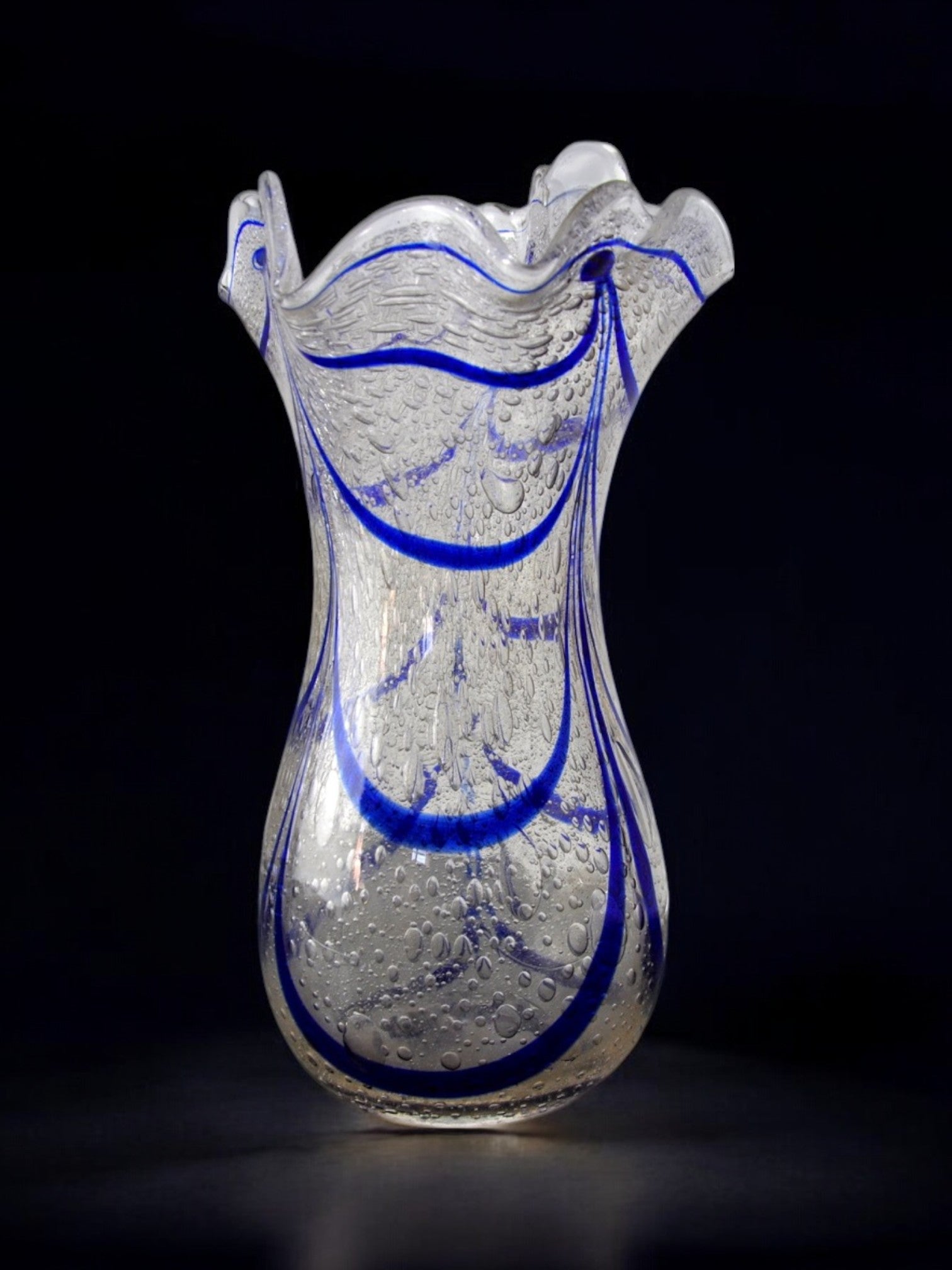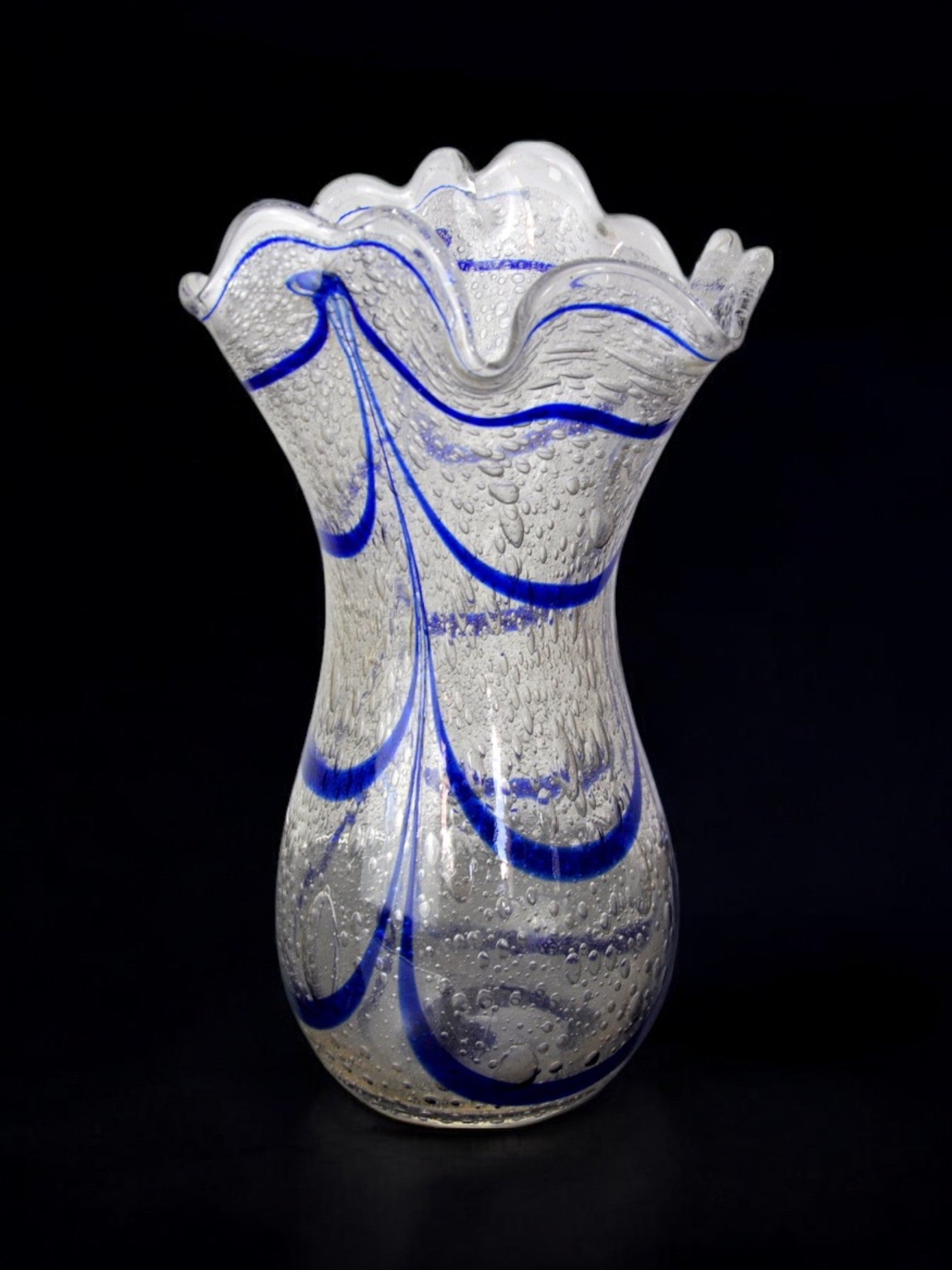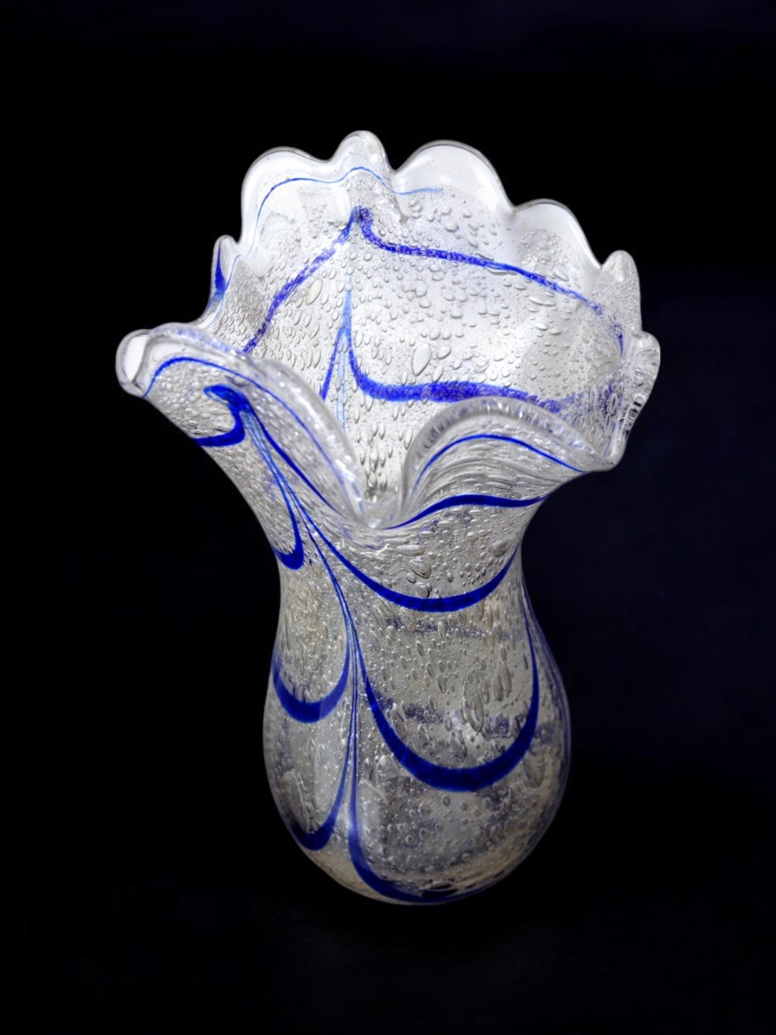 Hand blown sommerso blue and clear italian art glass vase. Attributed to seguso, murano italy, 1960s. This colorful vase has a beautiful design with drawn details and a ribbed edge using the sommerso technique. Use it as a decorative vase and display it with other murano glass pieces to create a colorful ensemble. Ref: 786.