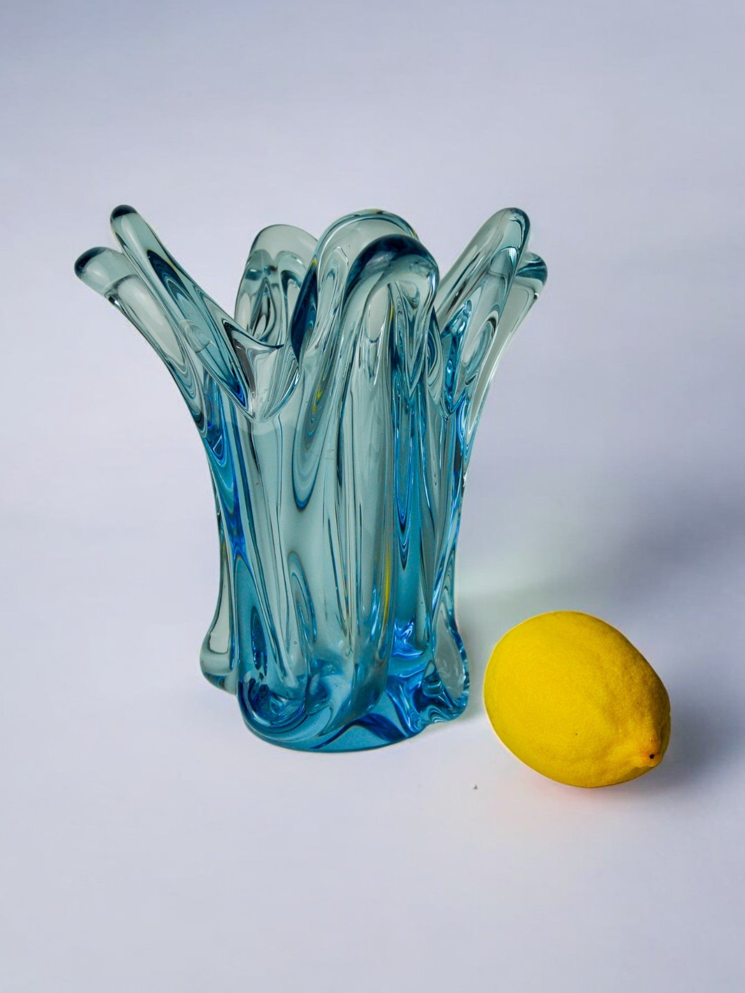 Hand blown sommerso blue Italian art glass vase. Attributed to Seguso, Murano Italy, 1970s. This colorful vase has a beautiful design with pulled details and a ribbed edge. Use it as a decorative vase or centerpiece. Display it with other murano glass pieces to create a colorful ensemble. Very good state of conservation. Ref: 1271. H22*21°.