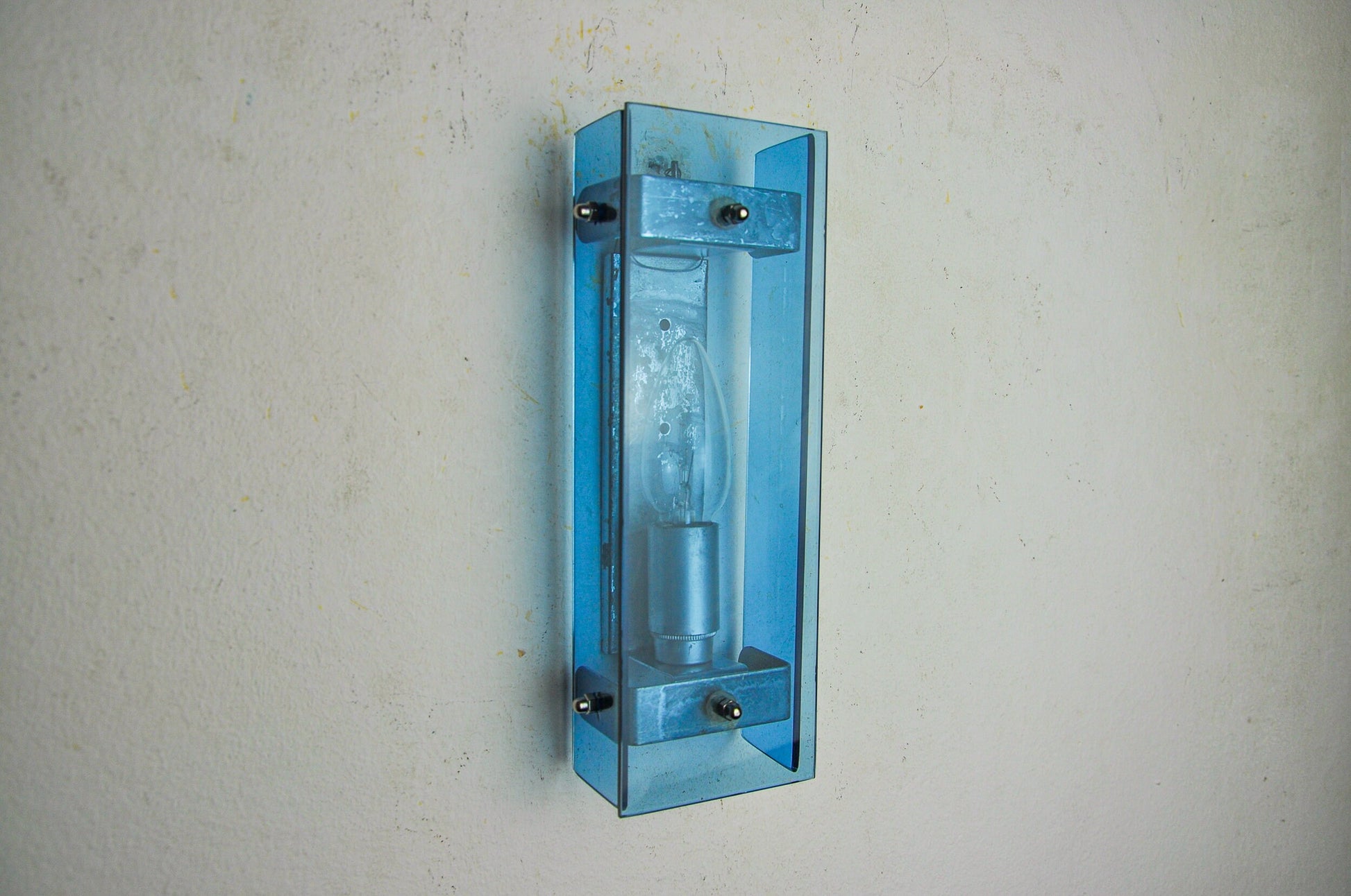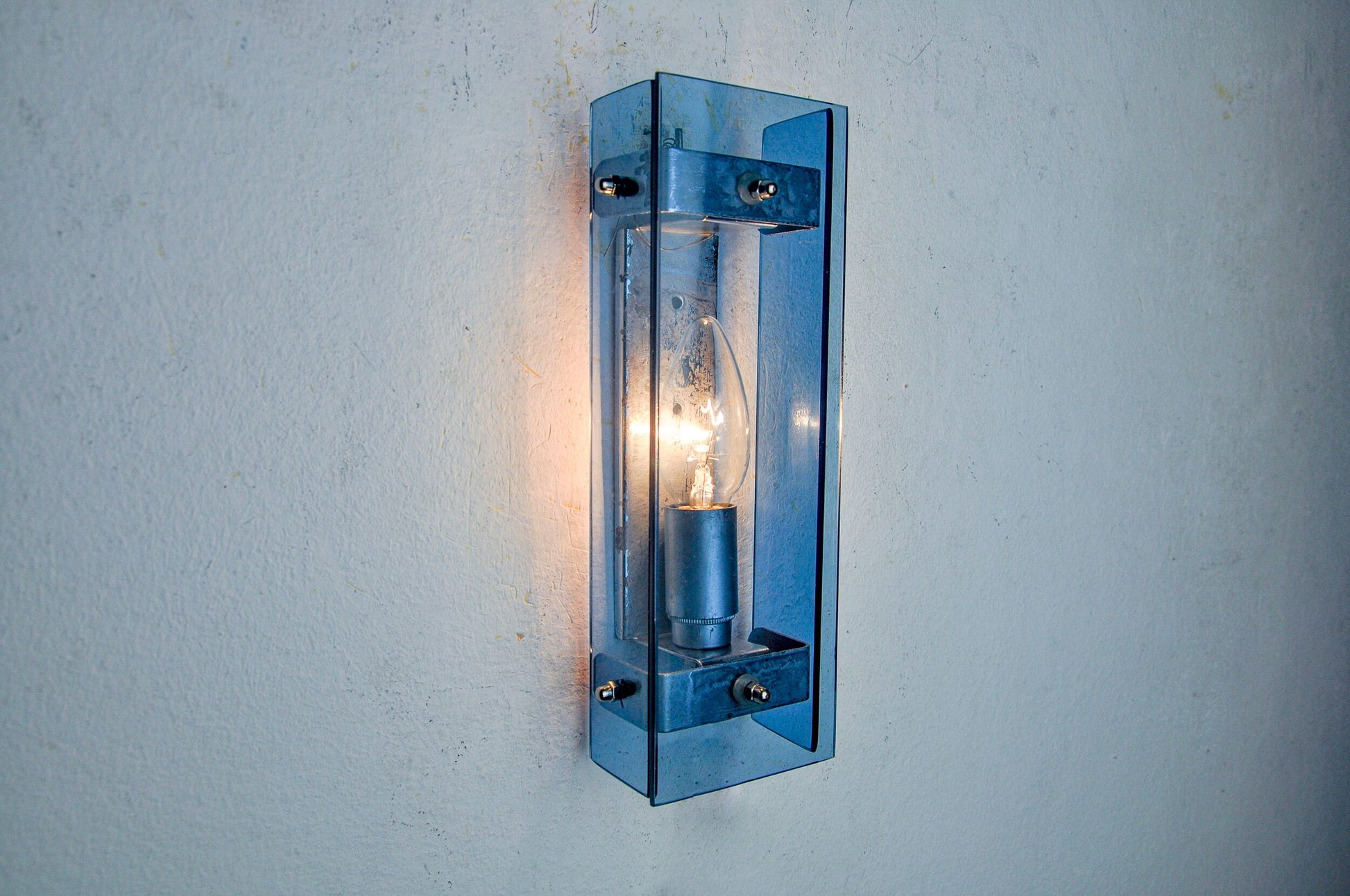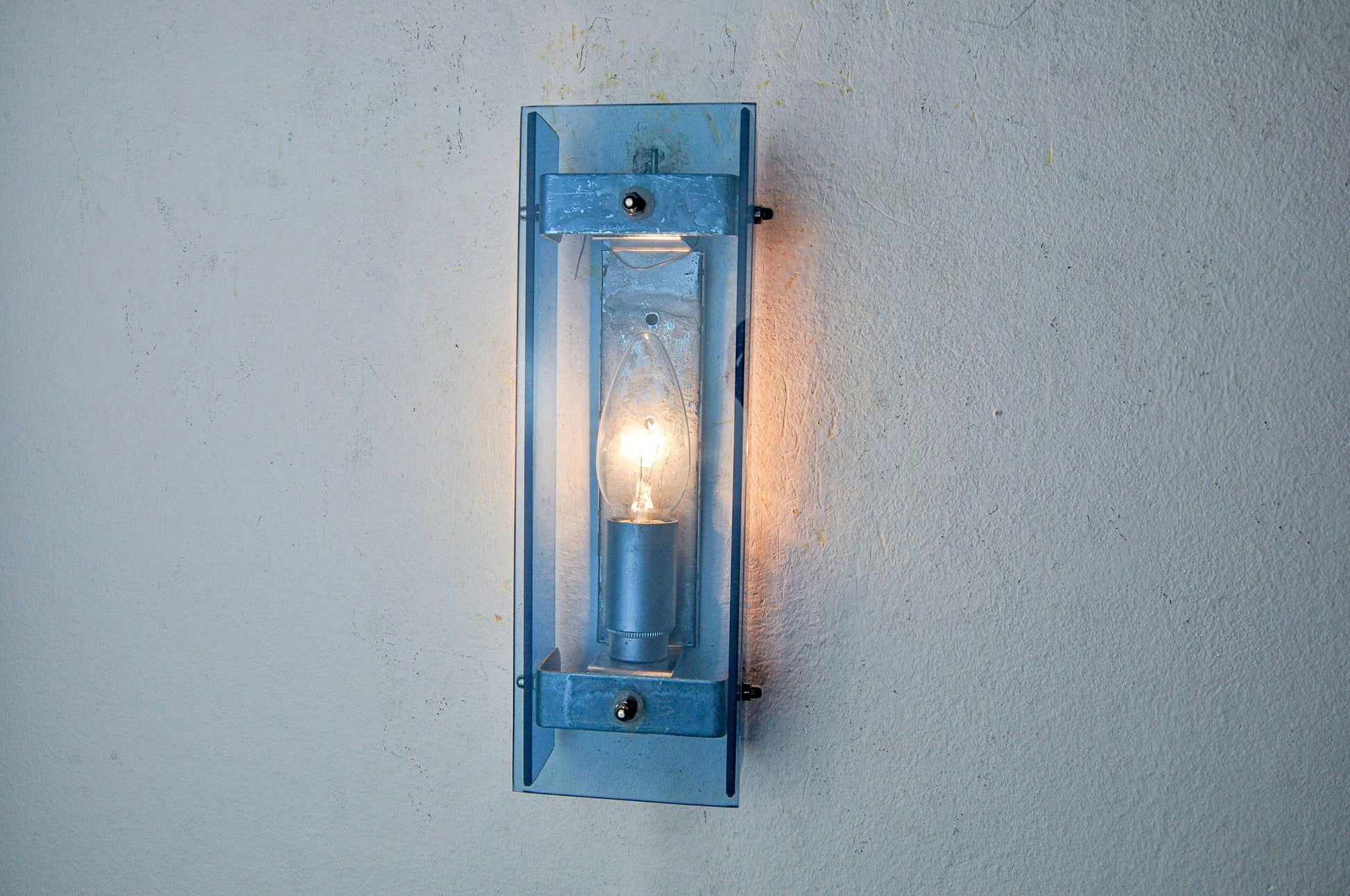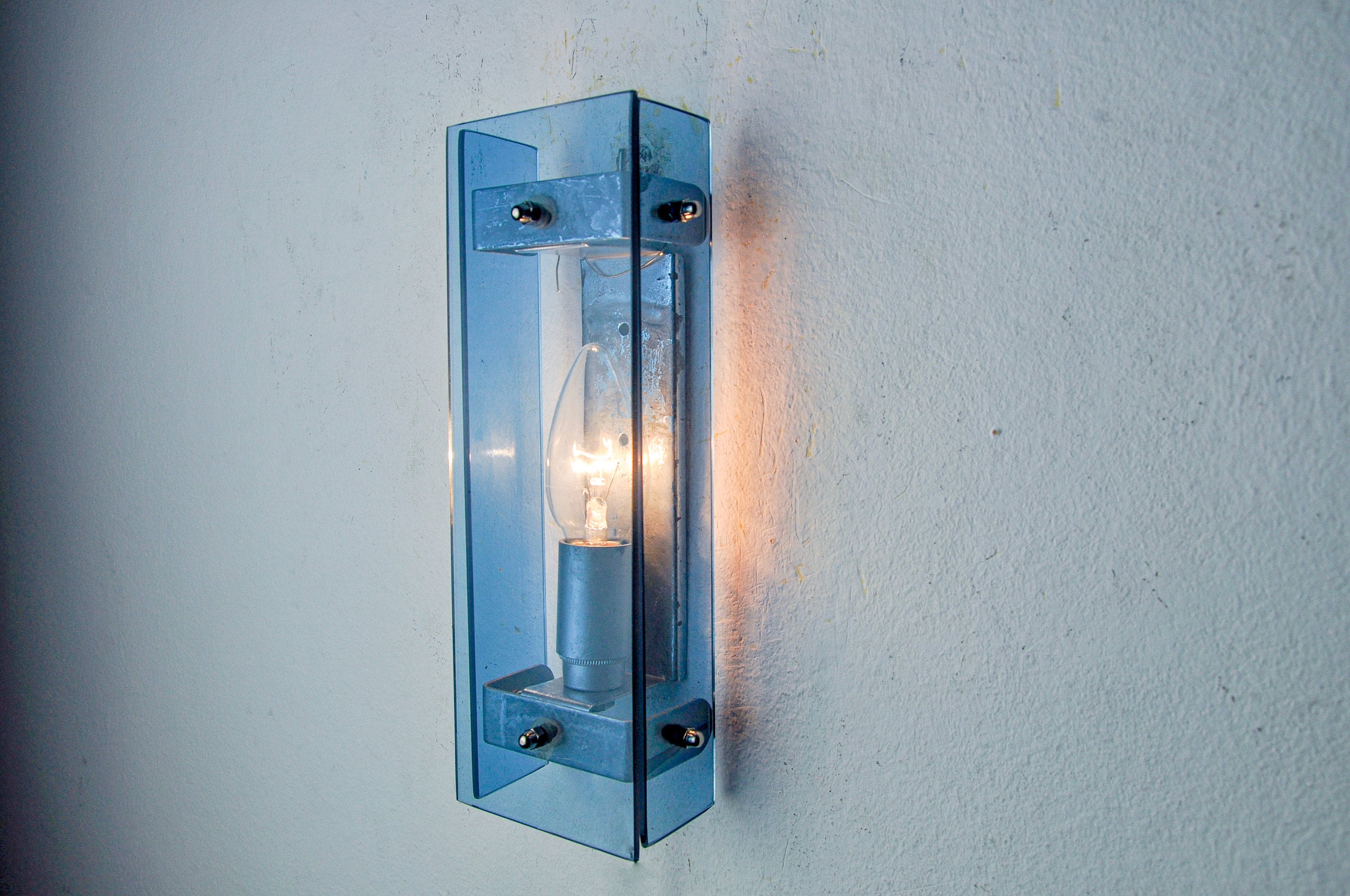 Very beautiful Veca wall light produced in Italy in the 70s. Wall light made up of beveled blue cut glass plates and a chrome structure. Unique object that will illuminate wonderfully and bring a real designer touch to your interior. Electricity checked, time stamp consistent with the age of the object. Easy installation, hidden cables. Ref: 1301. We adapt electricity for American market at no costs. Please make sure to request it when ordering. Lightning should always be checked and installed by a professional in all cases. Malamar declines any responsibility.