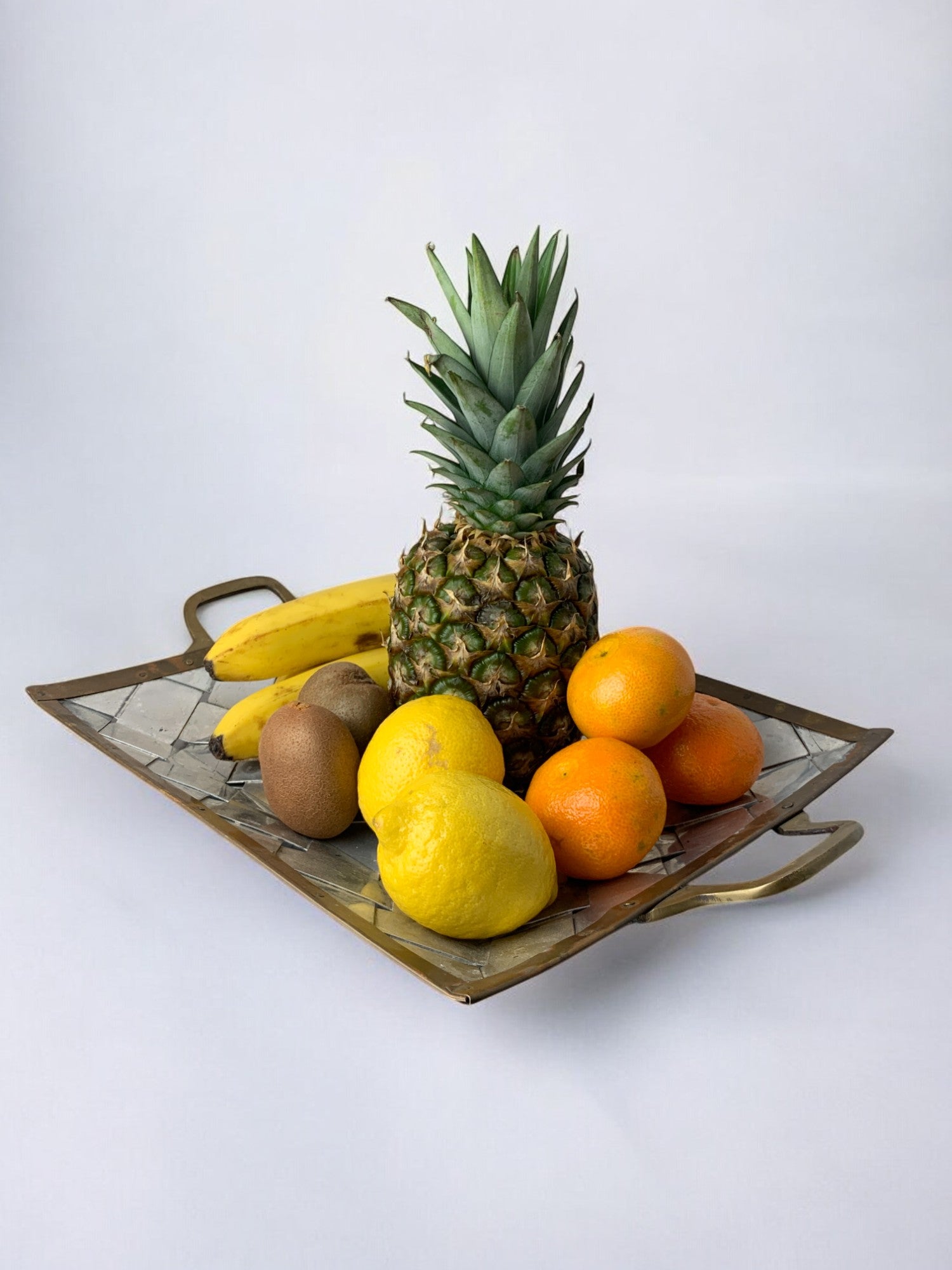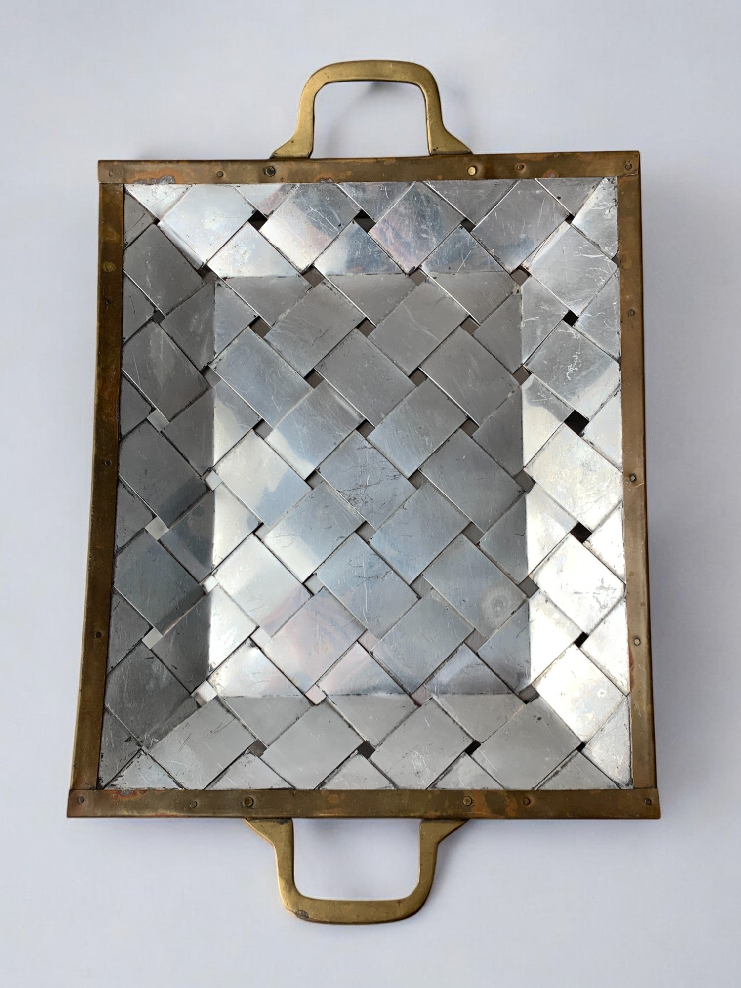 Superb and large brutalist tray designed and handcrafted in the 70s after Paul Evans style. Braided sculptural centerpiece in brass and aluminum. Rare design object that will elevate your interior. Ref:2293. Dimensions: H3 x l26 x D39,5 cm