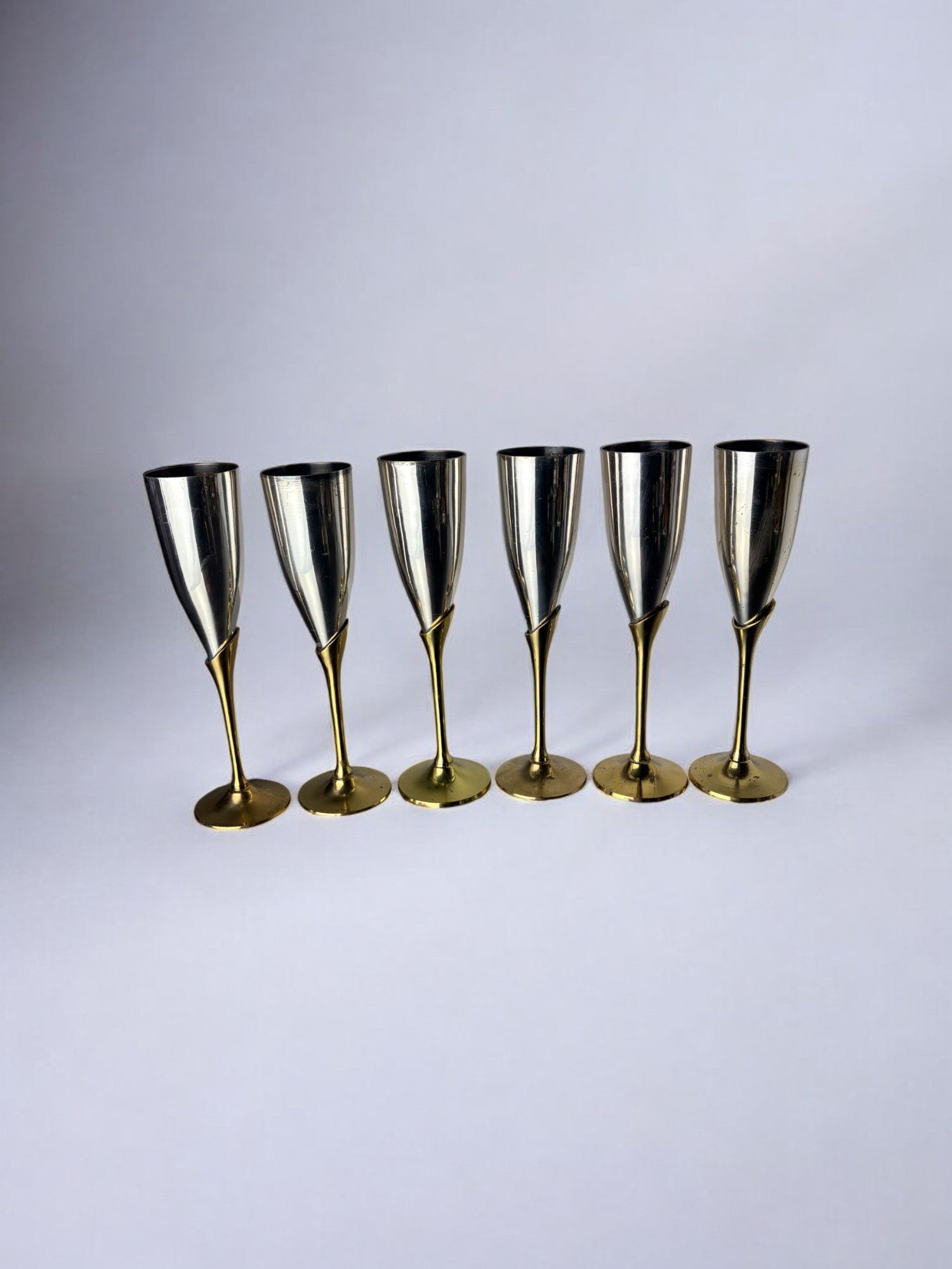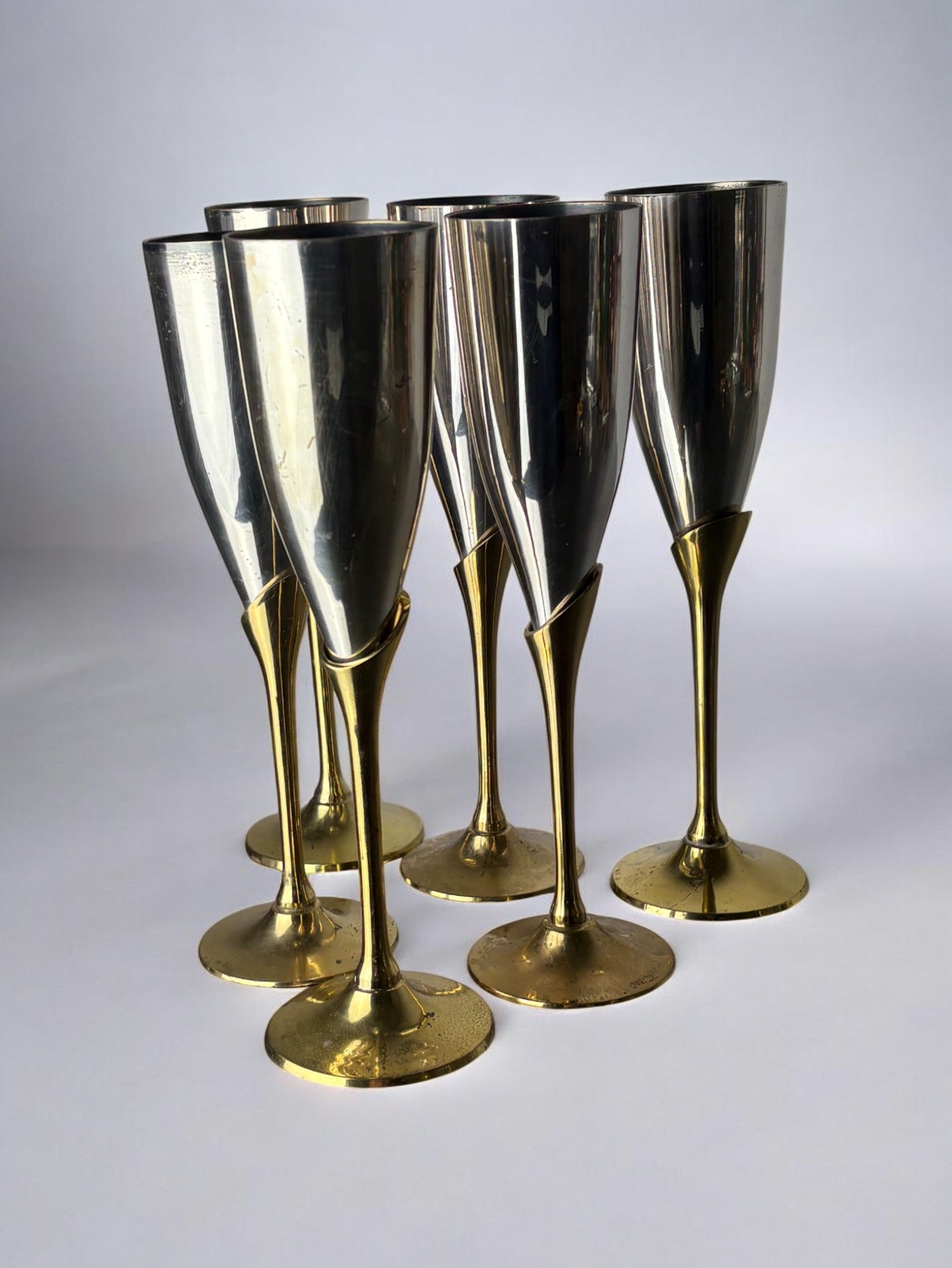 Superb set of 6 Champagne glasses designed and produced in Spain during the 1970's. This set of sculptural glasses made out of brass and silver plated is a true work of art. A beautiful set to display in your home. Ref:1994. Dimensions: H24 x 7° cm