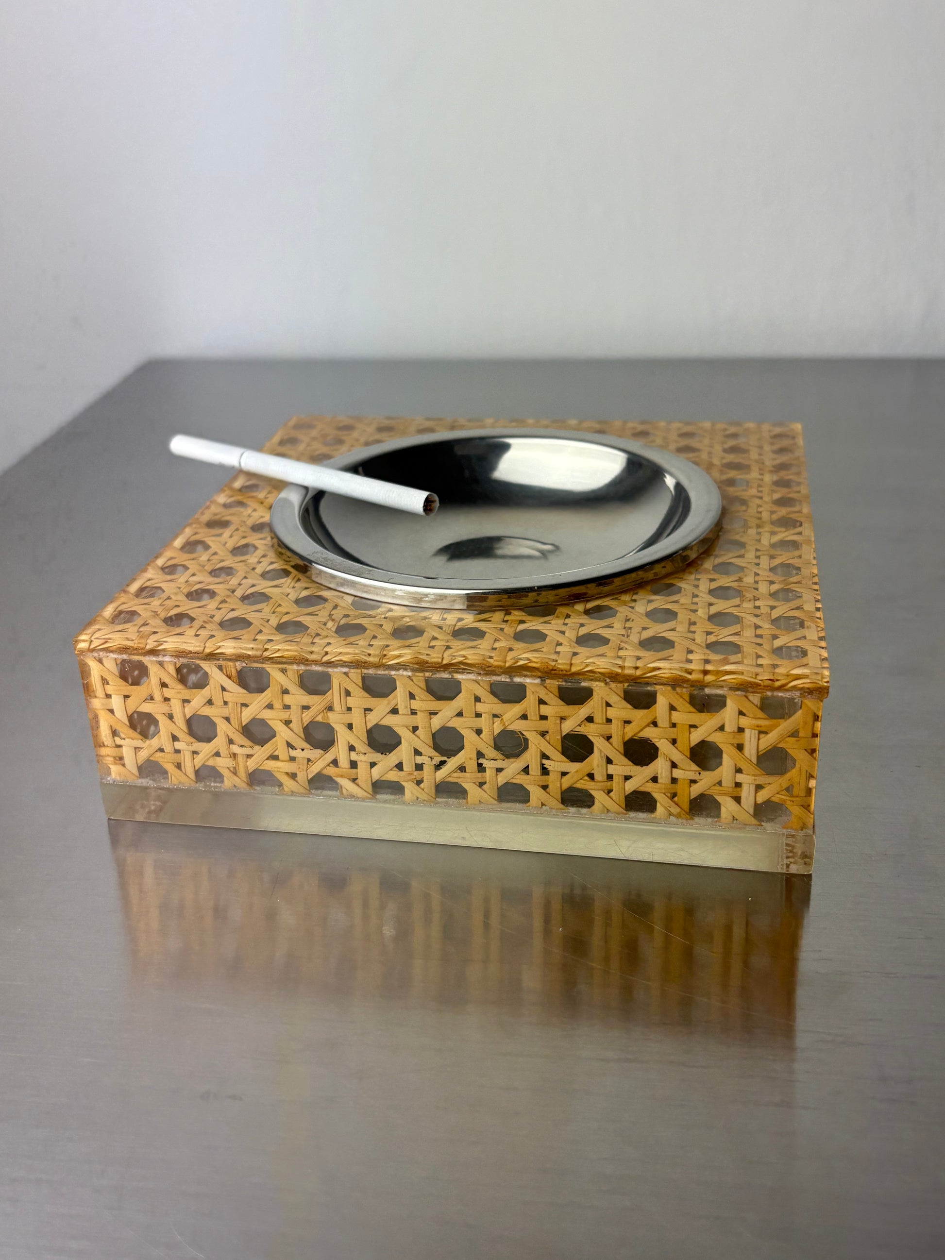 Exquisite 1970s Italian lucite and rattan ashtray attributed to Gabriella Crespi for Dior Home. This elegant piece combines timeless craftsmanship sophisticated design, adding a touch of luxury and refinement to any interior. Ref 2381. Dimensions: H4,5 x l15 x d15 cm
