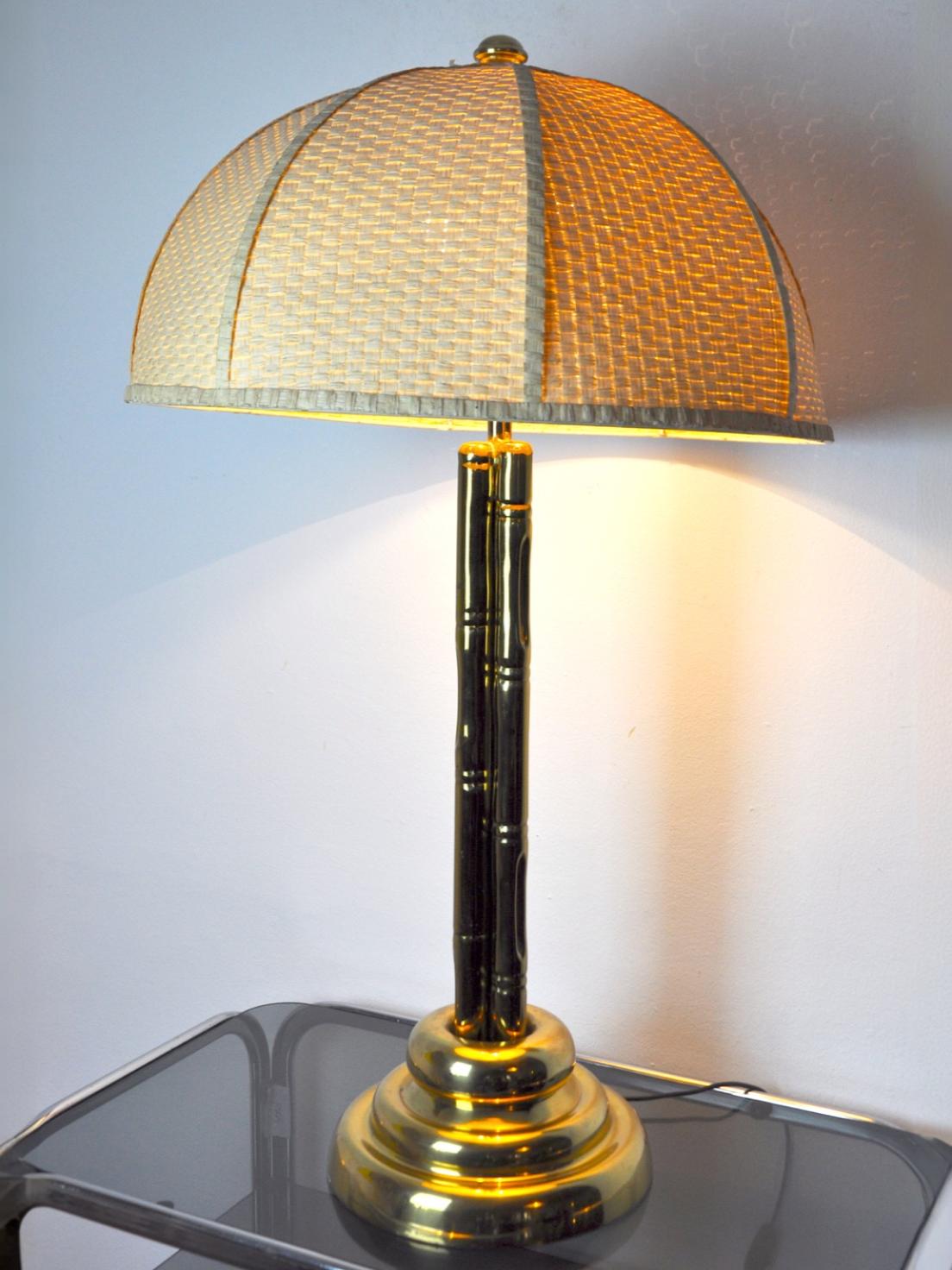 Superb and rare brass table lamp imitating bamboo. Rattan lampshade. Superb design product made in France in the 1970s in the style of Maison Bagues and Maison Jansen. This design object will illuminate your interior wonderfully. Electricity checked. Ref time: 536.