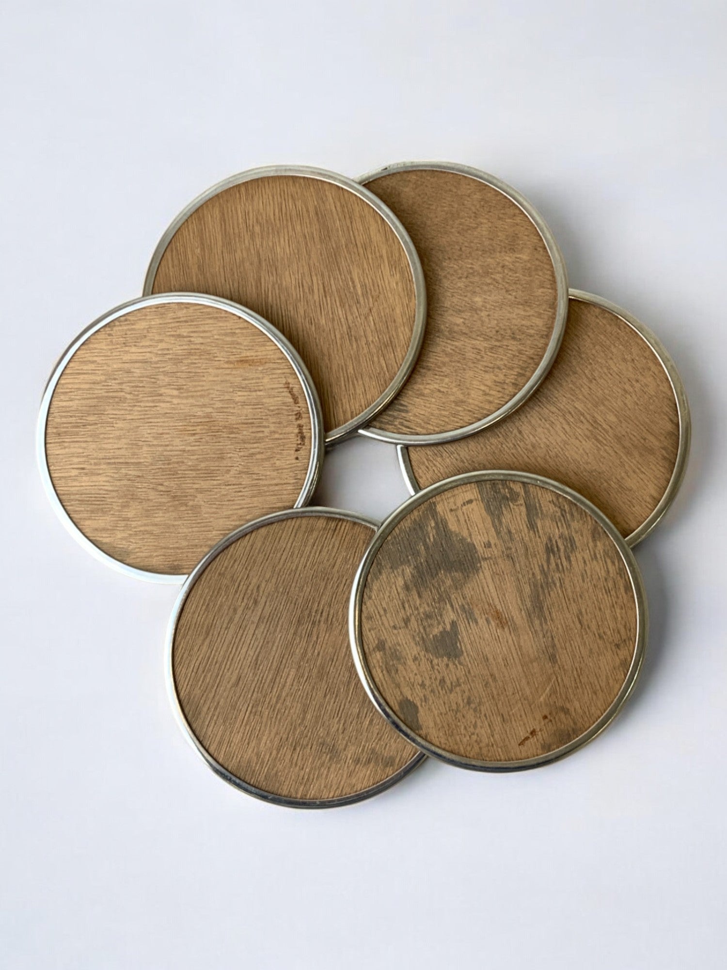 Stunning set of leather and chrome coasters, designed and crafted in Italy during the 1970s. This elegant collection of six circular pieces draws inspiration from the style of Gabriella Crespi, serving as an exceptional barware accessory ideal for presenting drinks with sophistication and flair. Ref:2332. Dimensions: H0,2 x l11 x D11 cm