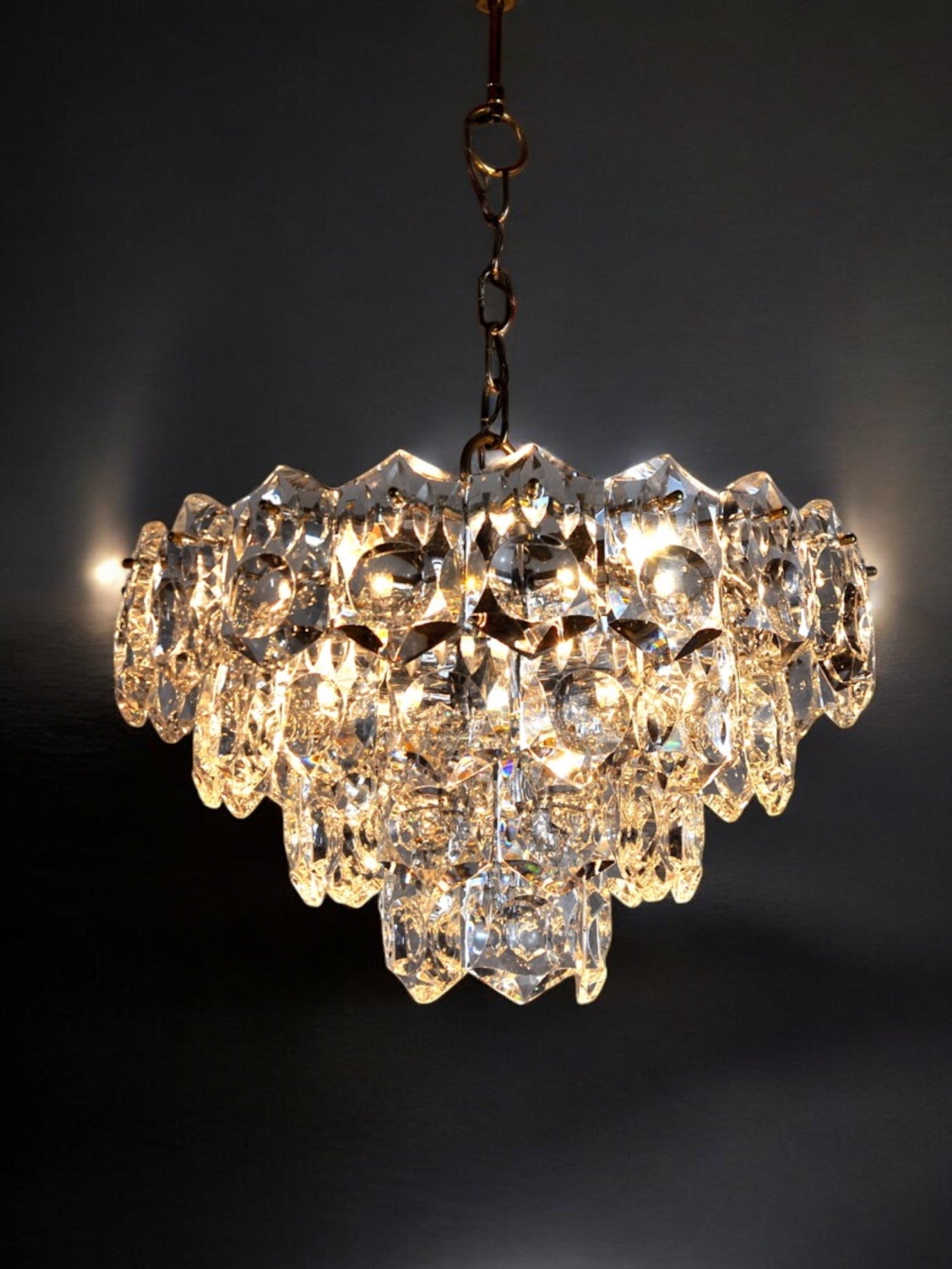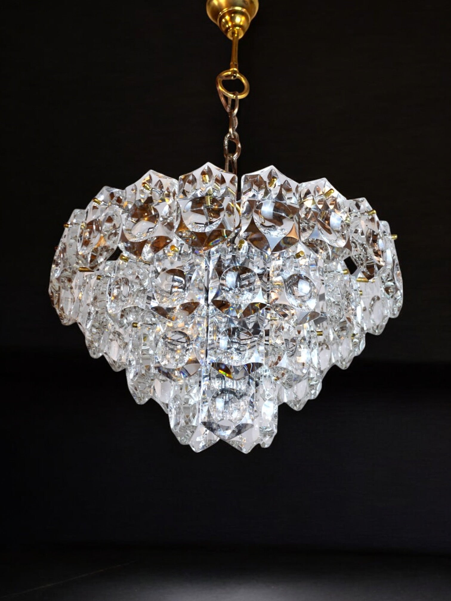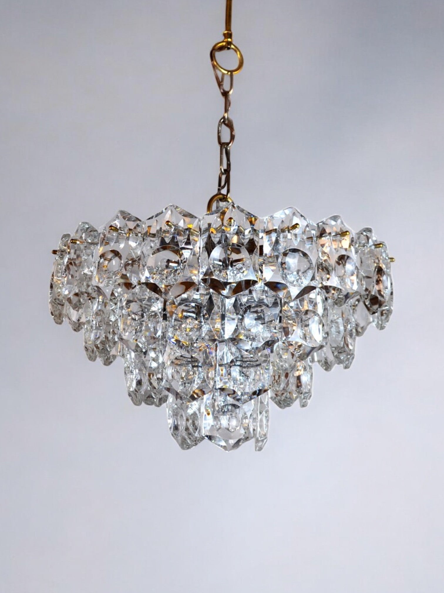 Magnificent and rare kinkeldey chandelier from the 70s designed and produced in Germany. Composed of 50 crystals cut with magnifying effect and a golden metal structure spread over 4 levels. This chandelier is spectacular. This design object will illuminate your interior wonderfully. Electricity checked. Ref: 693/104. We adapt electricity for American market at no costs. Please make sure to request it when ordering. Lightning should always be checked and installed by a professional in all cases. Malamar declines any responsibility.