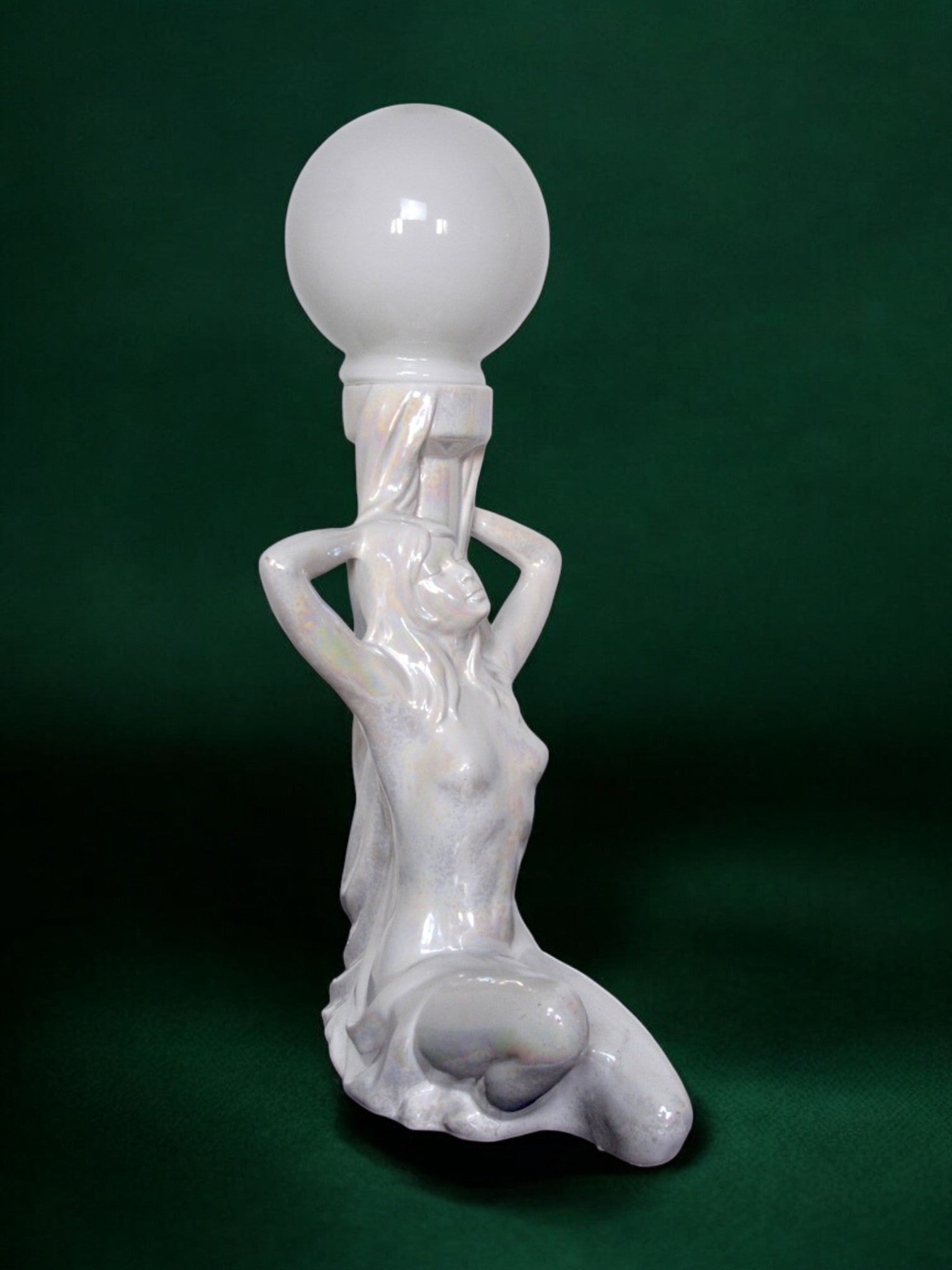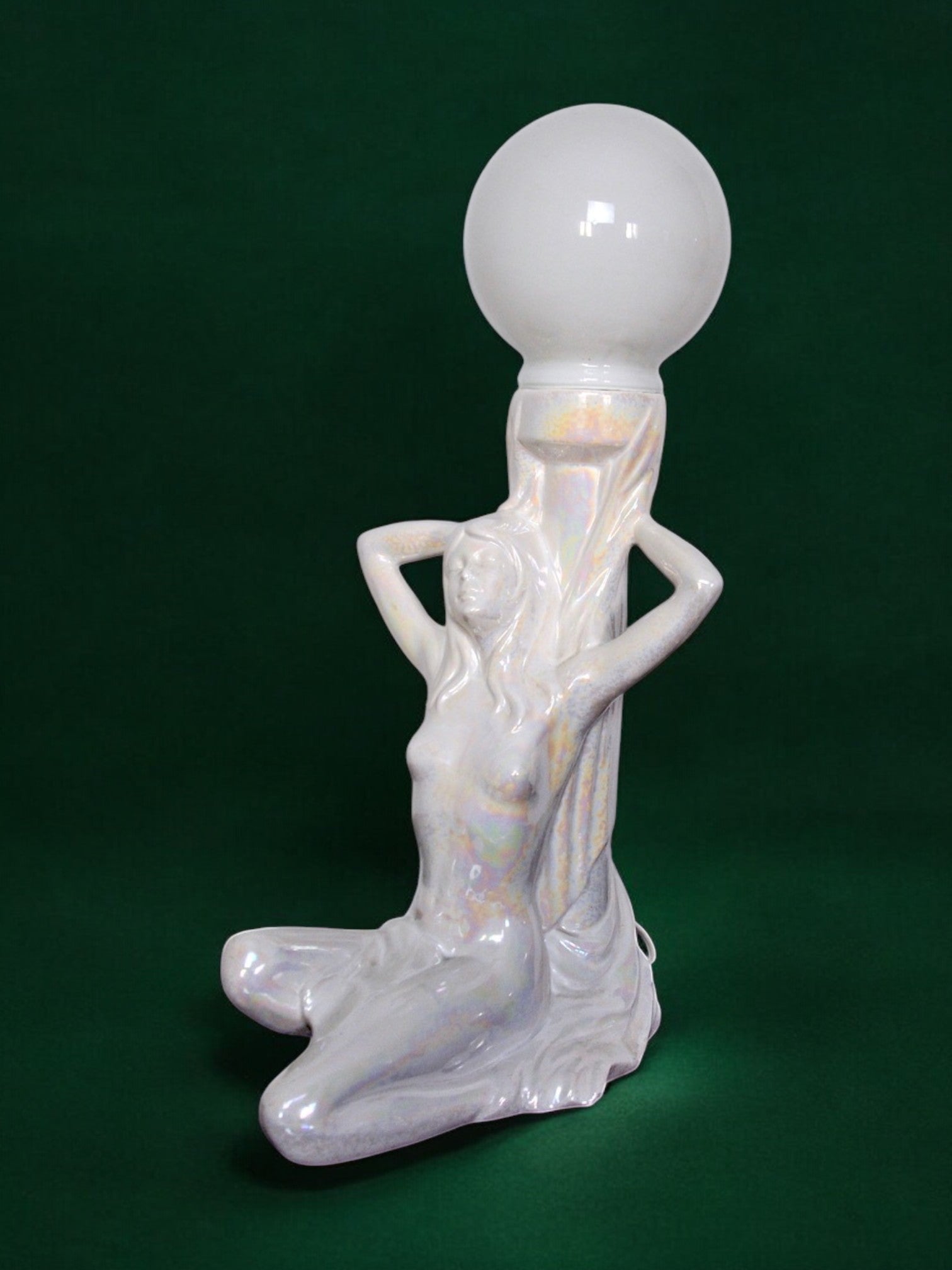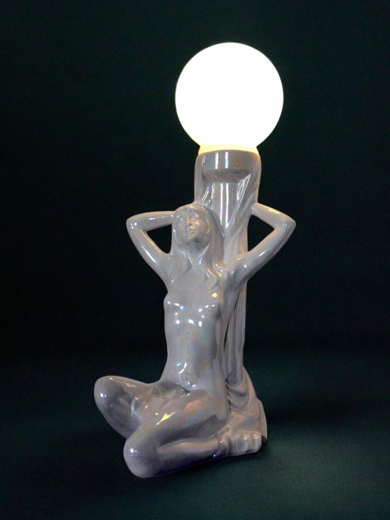Very pretty table lamp representing a naked woman dating from the 70s. The lamp is made up of a black ceramic sculpture and a white opaline globe. Lamp that will bring a real vintage and decorative touch to your interior. Electricity checked, ceramic in perfect condition. Very nice decorative object. Ref time: 405. We adapt electricity for American market at no costs. Please make sure to request it when ordering. Lightning should always be checked and installed by a professional in all cases. Malamar declines any responsibility.