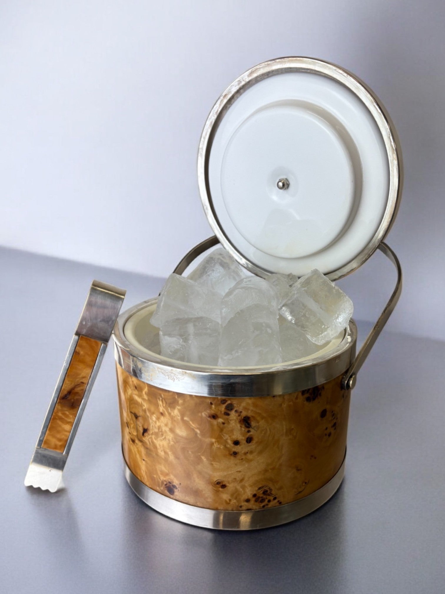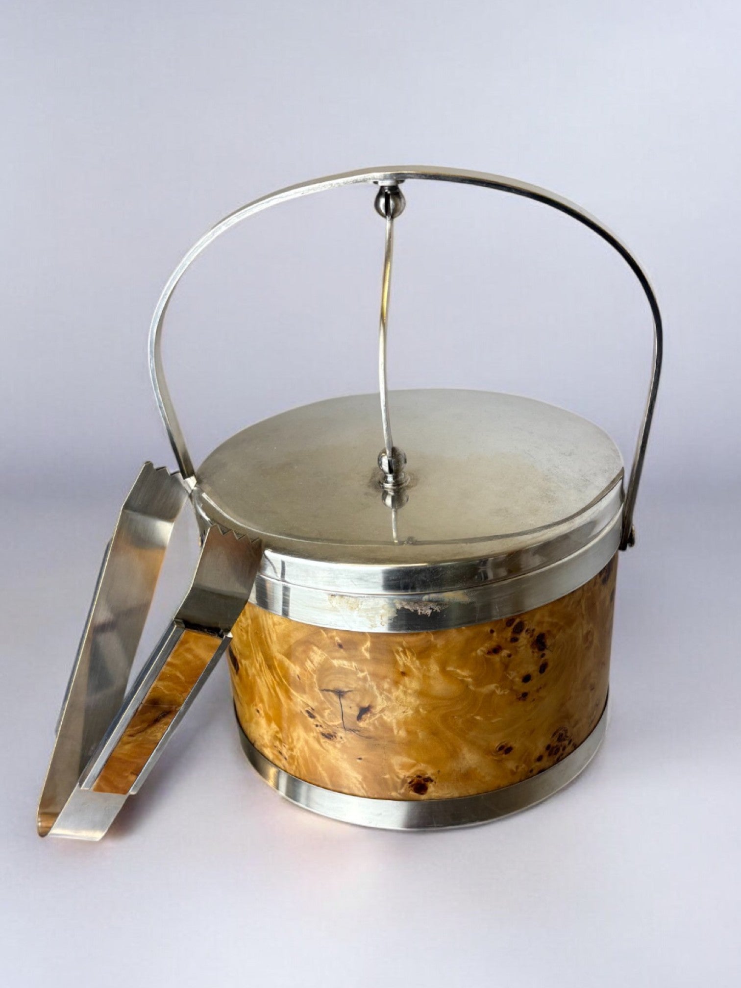 Lucite burl wood & Brass Ice Bucket with tongs, Italy, circa 1970