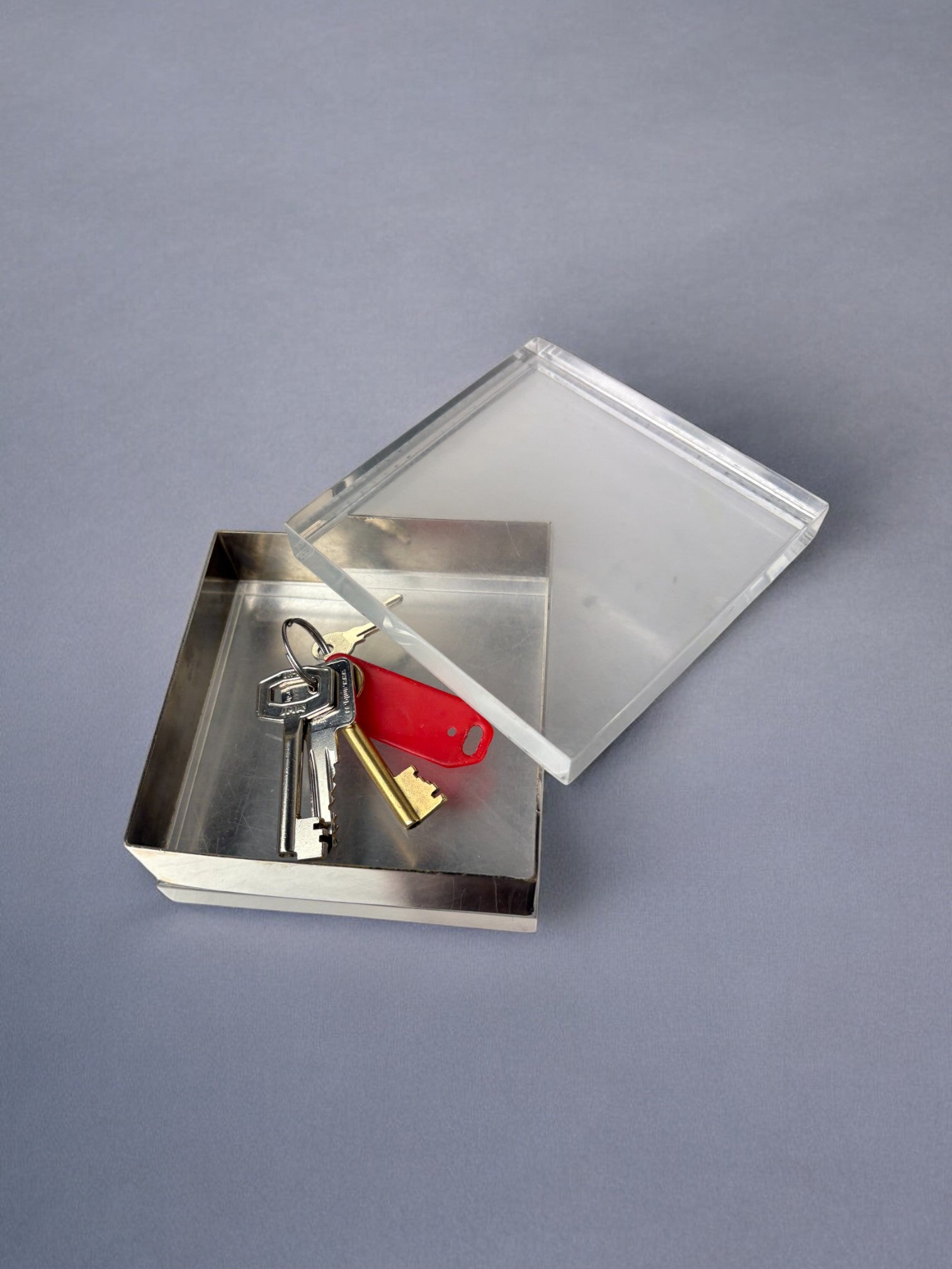 Beautiful jewelry box in lucite with chromed details designed and produced in Italy, 1970's. Beautiful box attributed to Gabriella Crespi. The way this piece reflects the light is simply beautiful and makes this piece ideal for storing jewelry. Ref: 2335. Dimensions: H6,5 x l11,5 x d11,5 cm