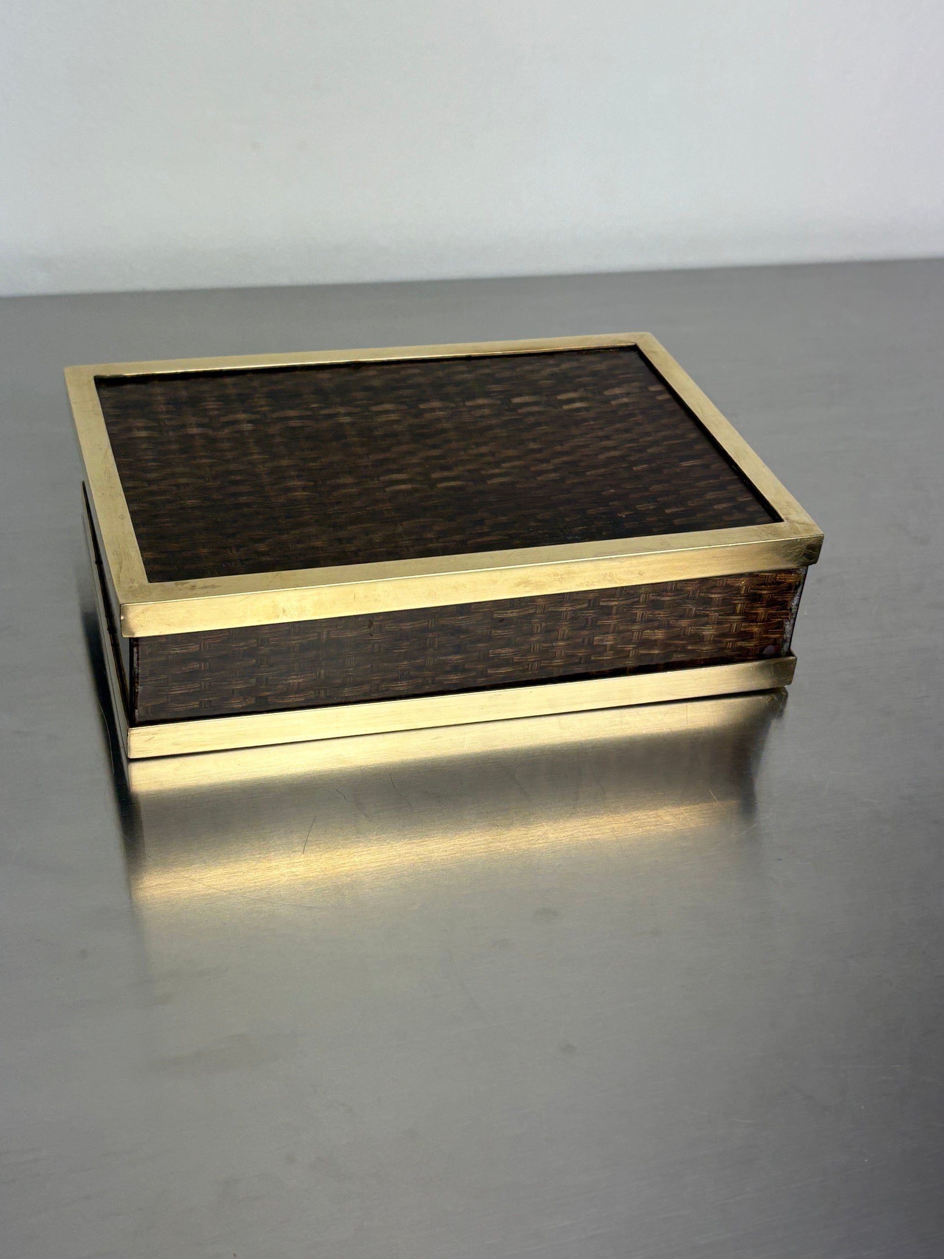 Exquisite 1970s Italian lucite, rattan and brass jewelry box, attributed to Gabriella Crespi for Dior Home. This elegant piece combines timeless craftsmanship sophisticated design, adding a touch of luxury and refinement to any interior. Ref:1961. Dimensions: H5 x l18,5 x d12,5 cm