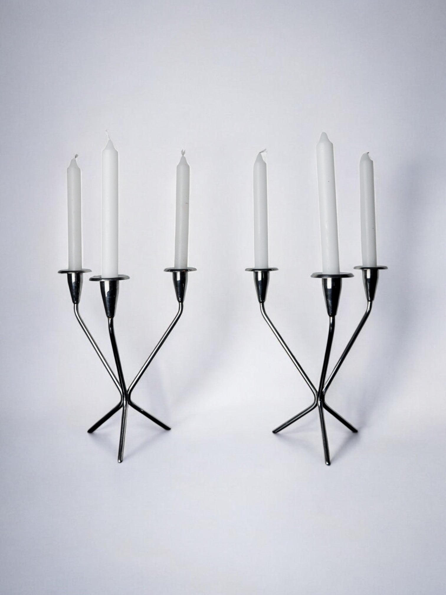 Pair of art deco stainless steel 3-flame candlesticks, Spain, 1970