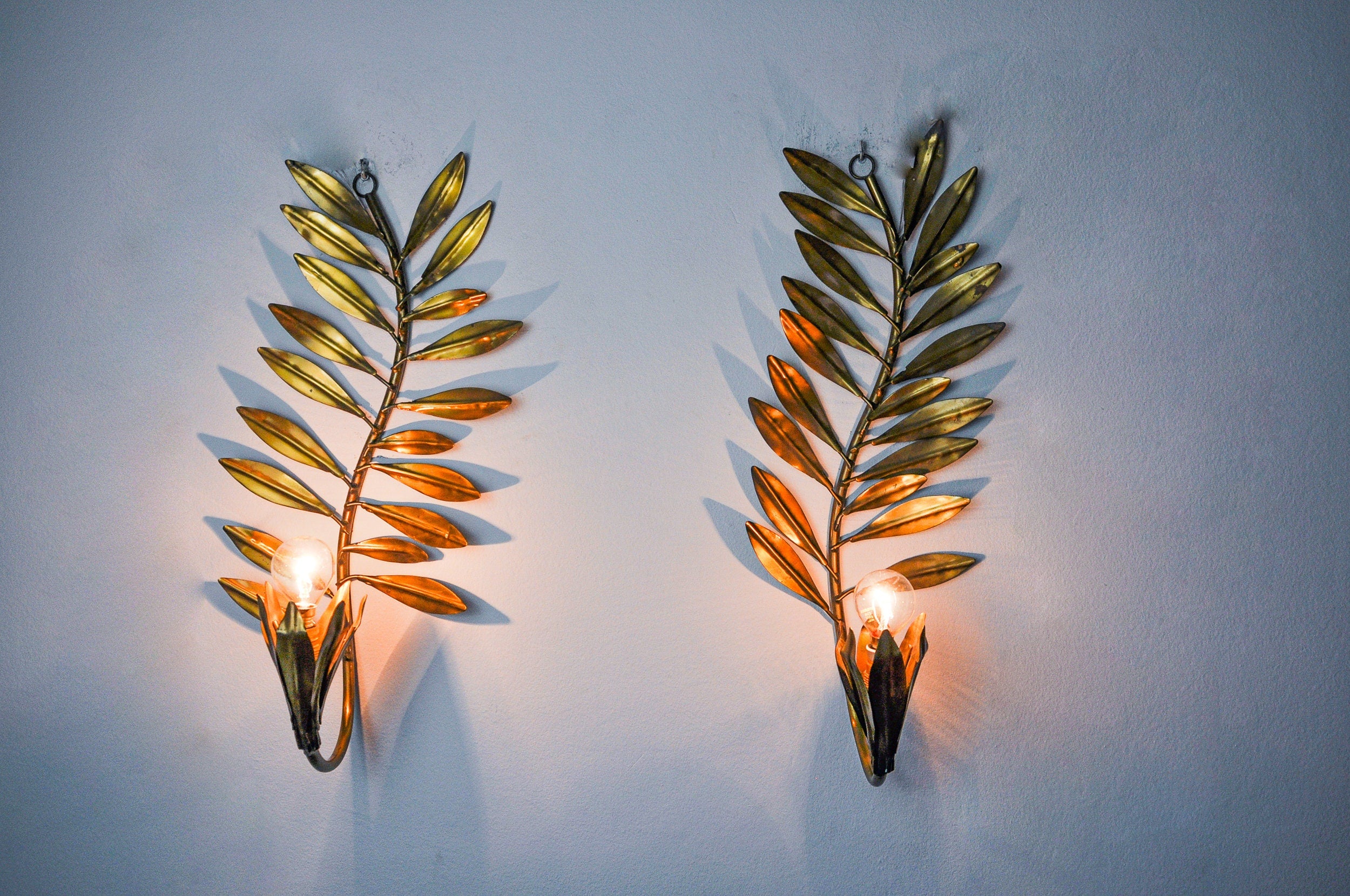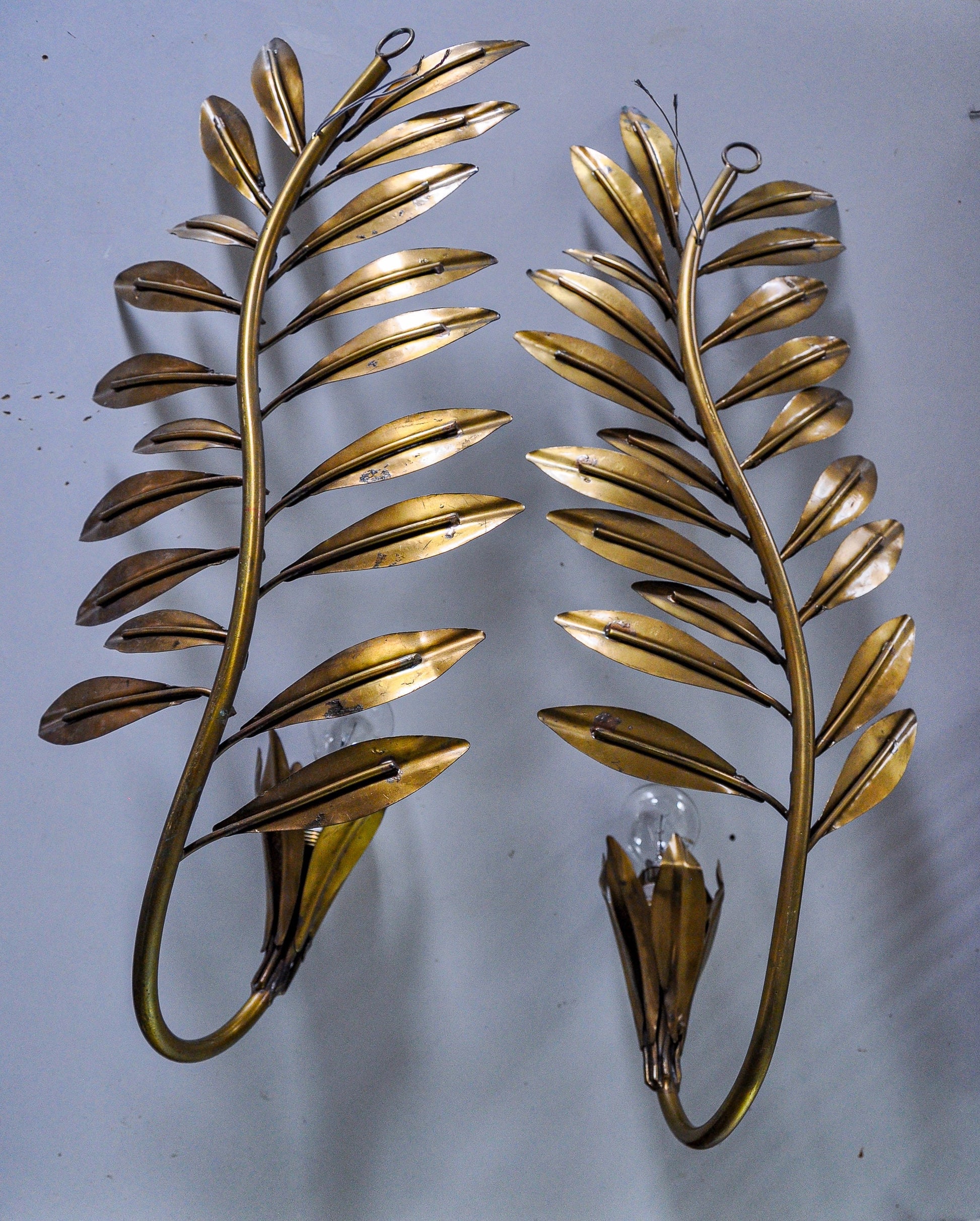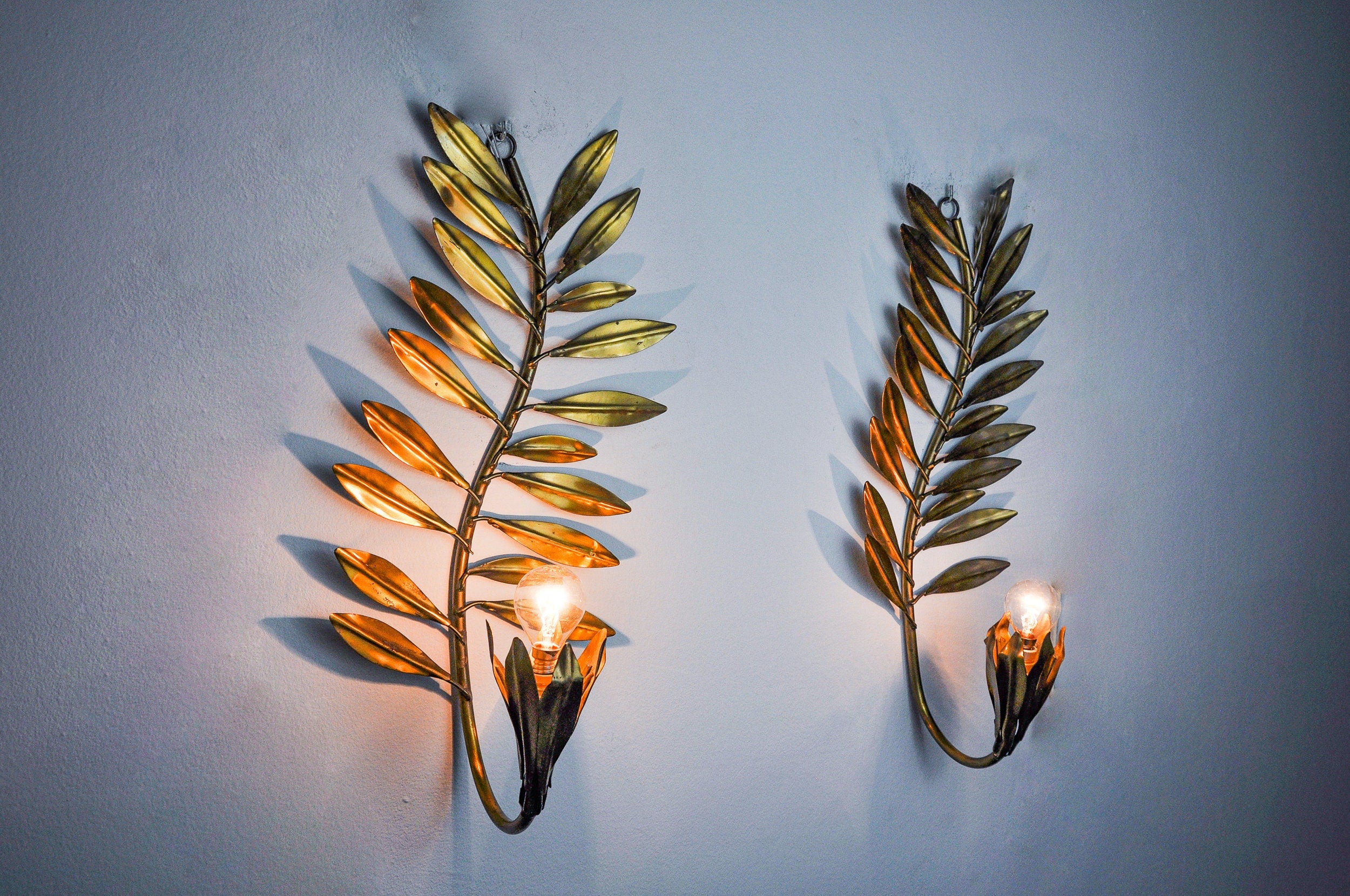 Very beautiful and large pair of floral wall lights designed and produced by Ferro Arte in Spain in the 1980s. Gold metal structure representing a floral theme. Superb patina. Unique object that will illuminate wonderfully and bring a real designer touch to your interior. Electricity checked, time stamp consistent with the age of the object. Easy installation. Ref: 1501/1502. We adapt electricity for American market at no costs. Please make sure to request it when ordering. Lightning should always be checked and installed by a professional in all cases. Malamar declines any responsibility.