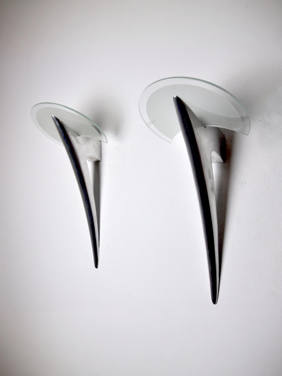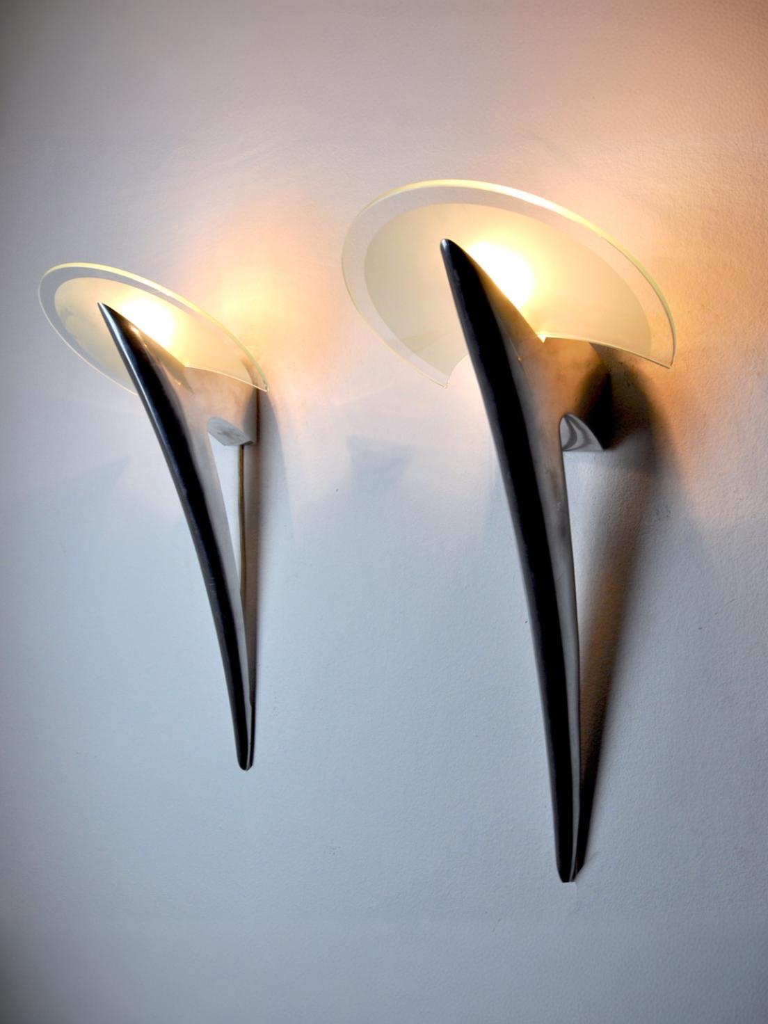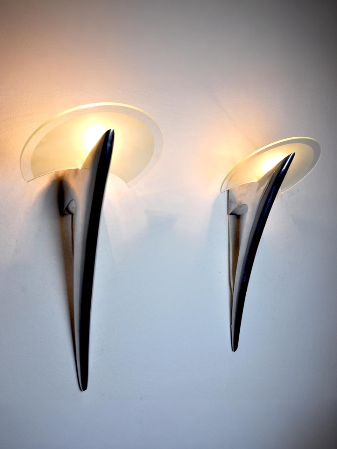Large and rare pair of Alien sconces by taller Uno in metal and glass. Designed and produced in Spain in the 1980s. These wall lights with their unique design will illuminate wonderfully. Mark of time consistent with the age of the object. Easy installation, cables not visible. Ref time: 589. H55xl23xl22.
