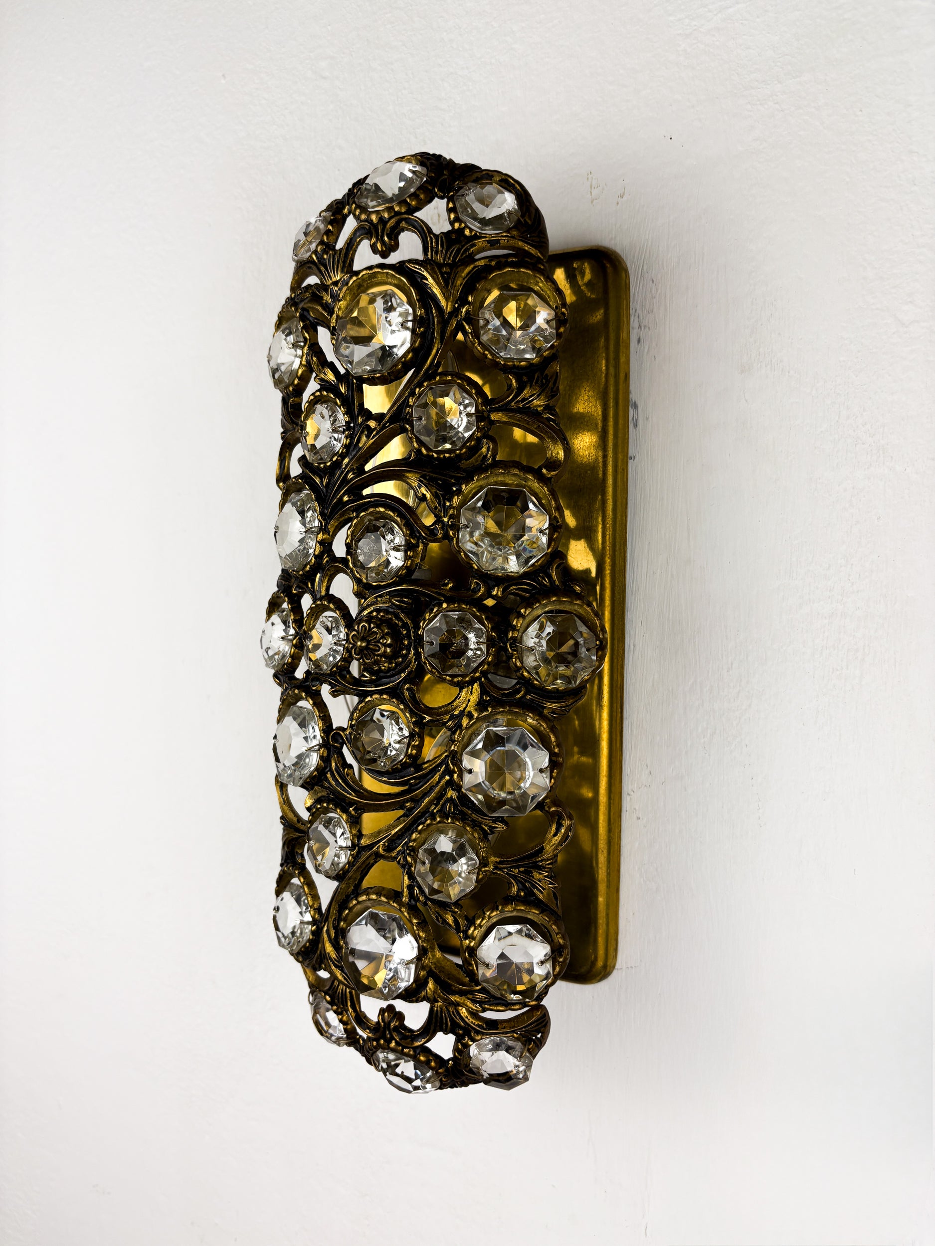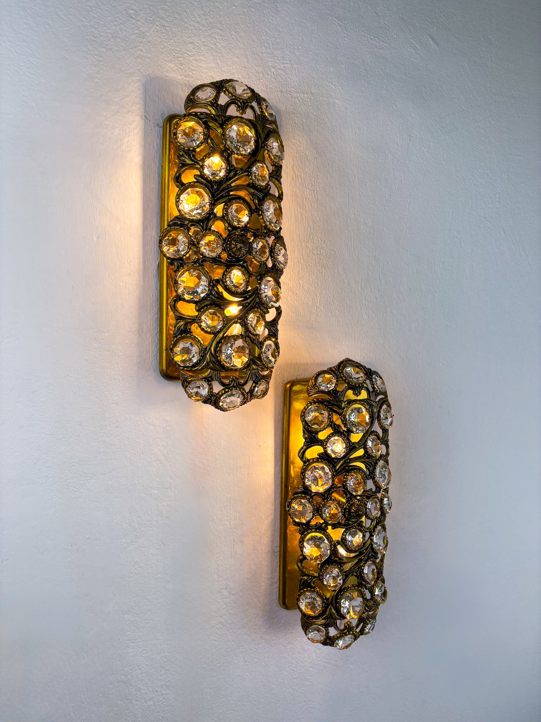 Pair of palwa sconces designed by Ernest Palm and produced in the 60s in barcelona. Brass structure composed of crystals cut in perfect condition. Rare design object that will illuminate your interior perfectly. Verified electricity, time marks consistent with the age of the object. We adapt electricity for American market at no costs. Please make sure to request it when ordering. Lightning should always be checked and installed by a professional in all cases. Malamar declines any responsibility.