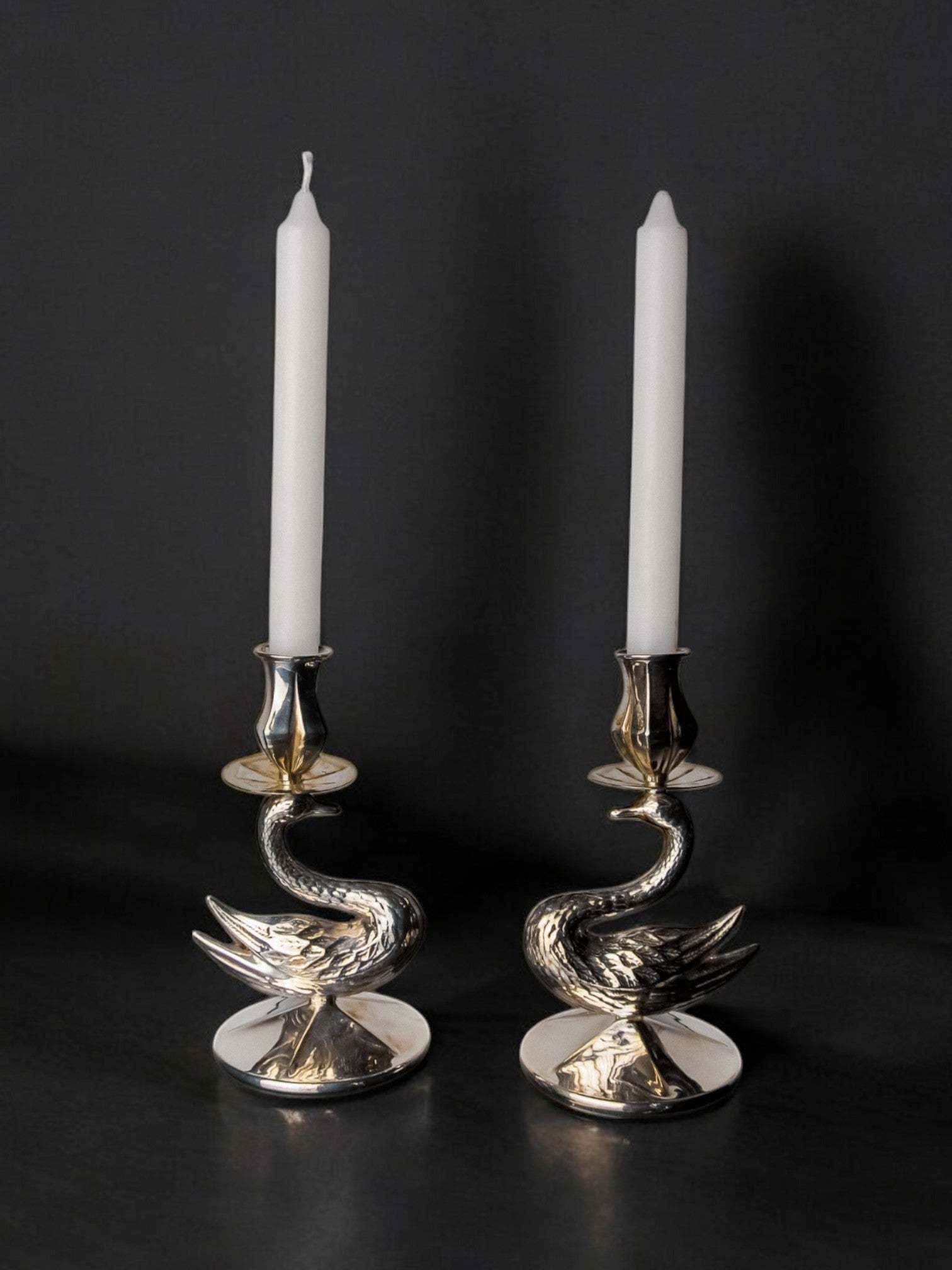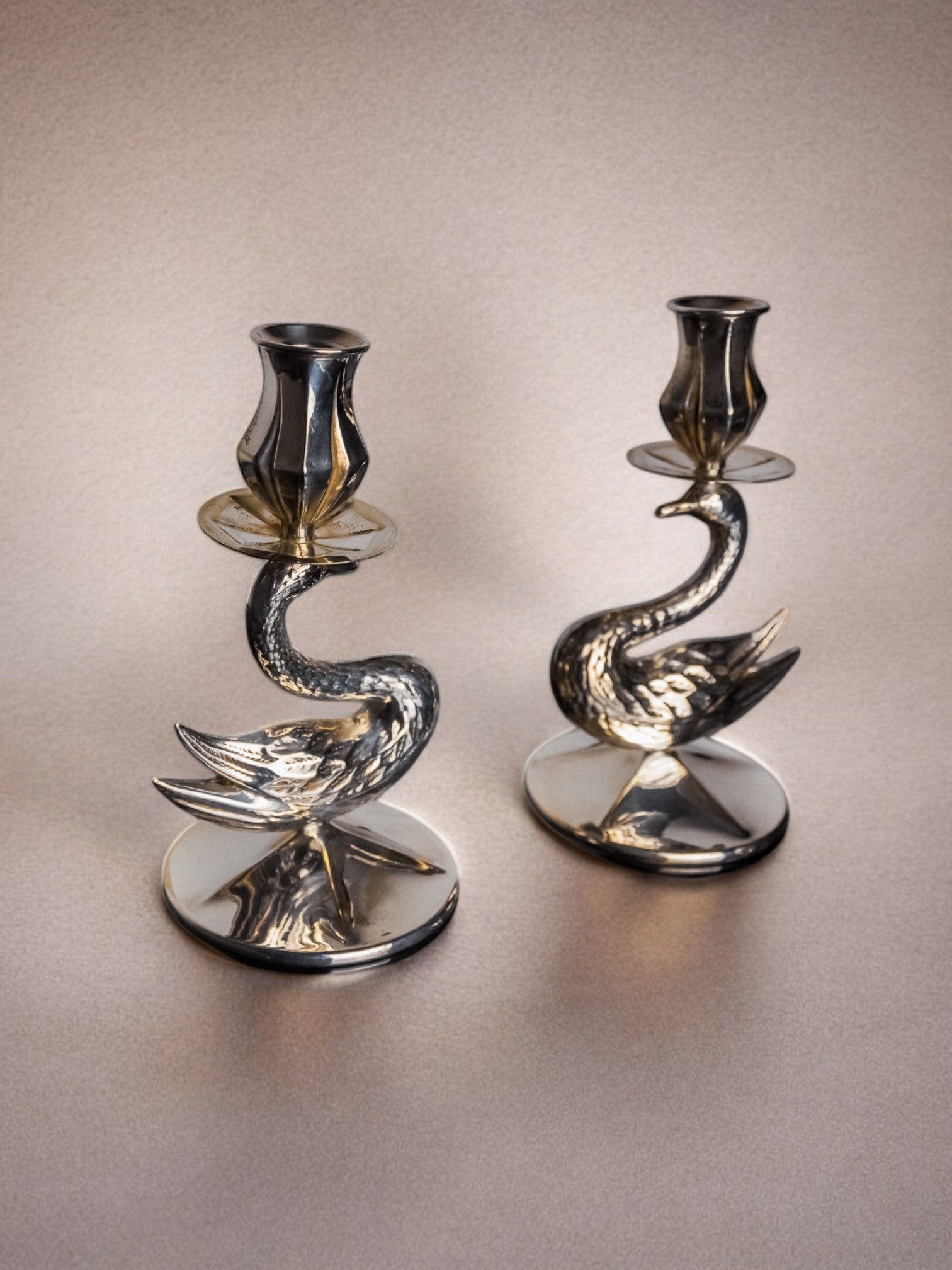 Pair of art deco swan candlesticks in alpaca, Spain, 1970
