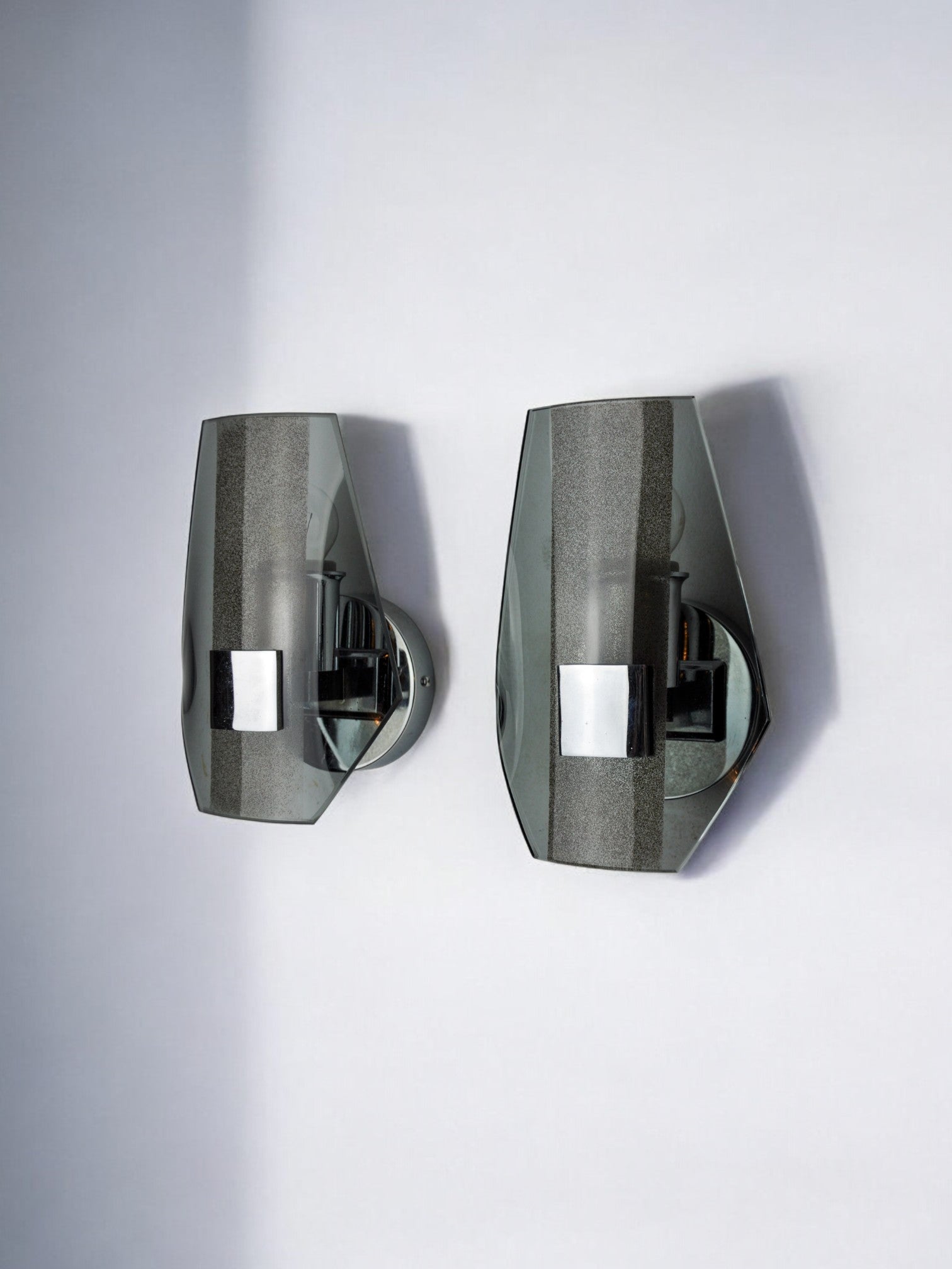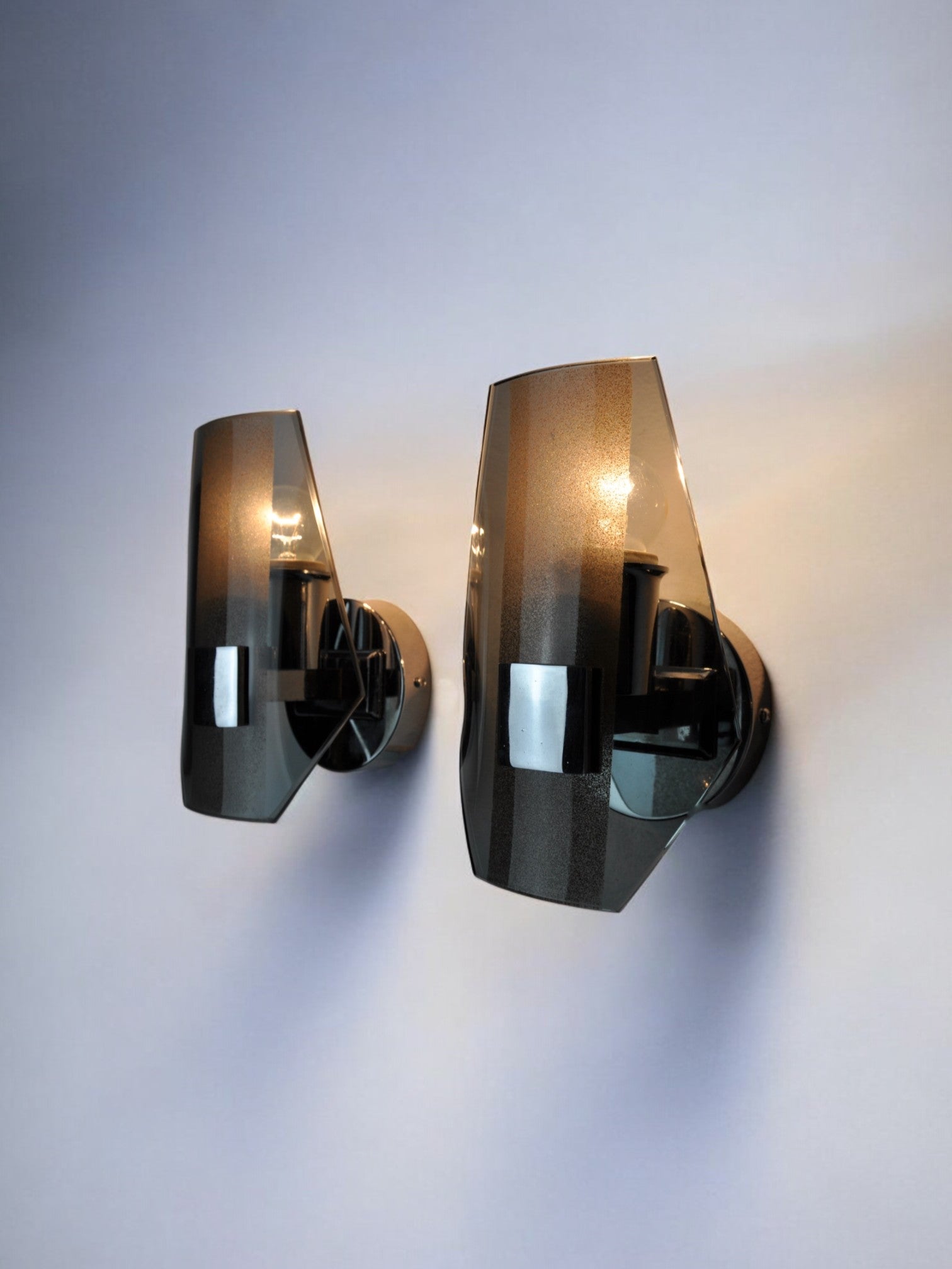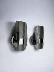 Very nice pair of veca wall lamps produced in italy in the 70s. Wall lamps composed of black cut glass plates and a chrome structure. Unique object that will illuminate wonderfully and bring a real design touch to your interior. Verified electricity, time mark consistent with the age of the object. Easy installation, cables not visible. We adapt electricity for American market at no costs. Please make sure to request it when ordering. Lightning should always be checked and installed by a professional in all cases. Malamar declines any responsibility.