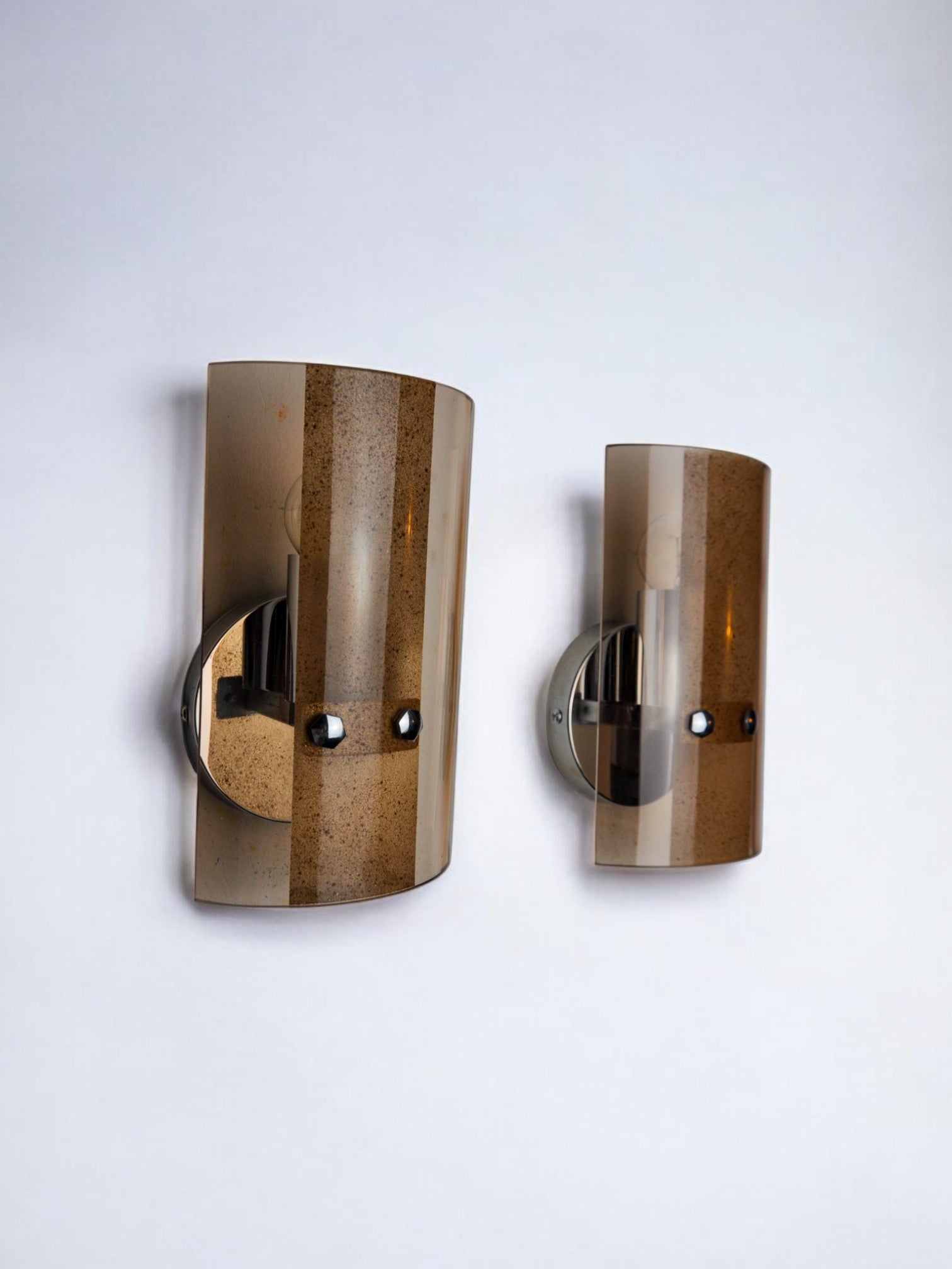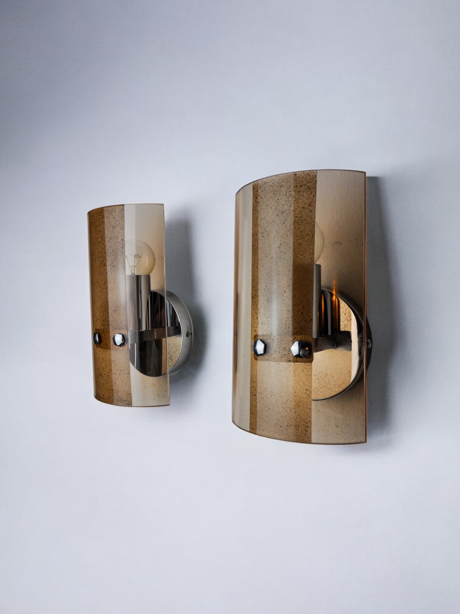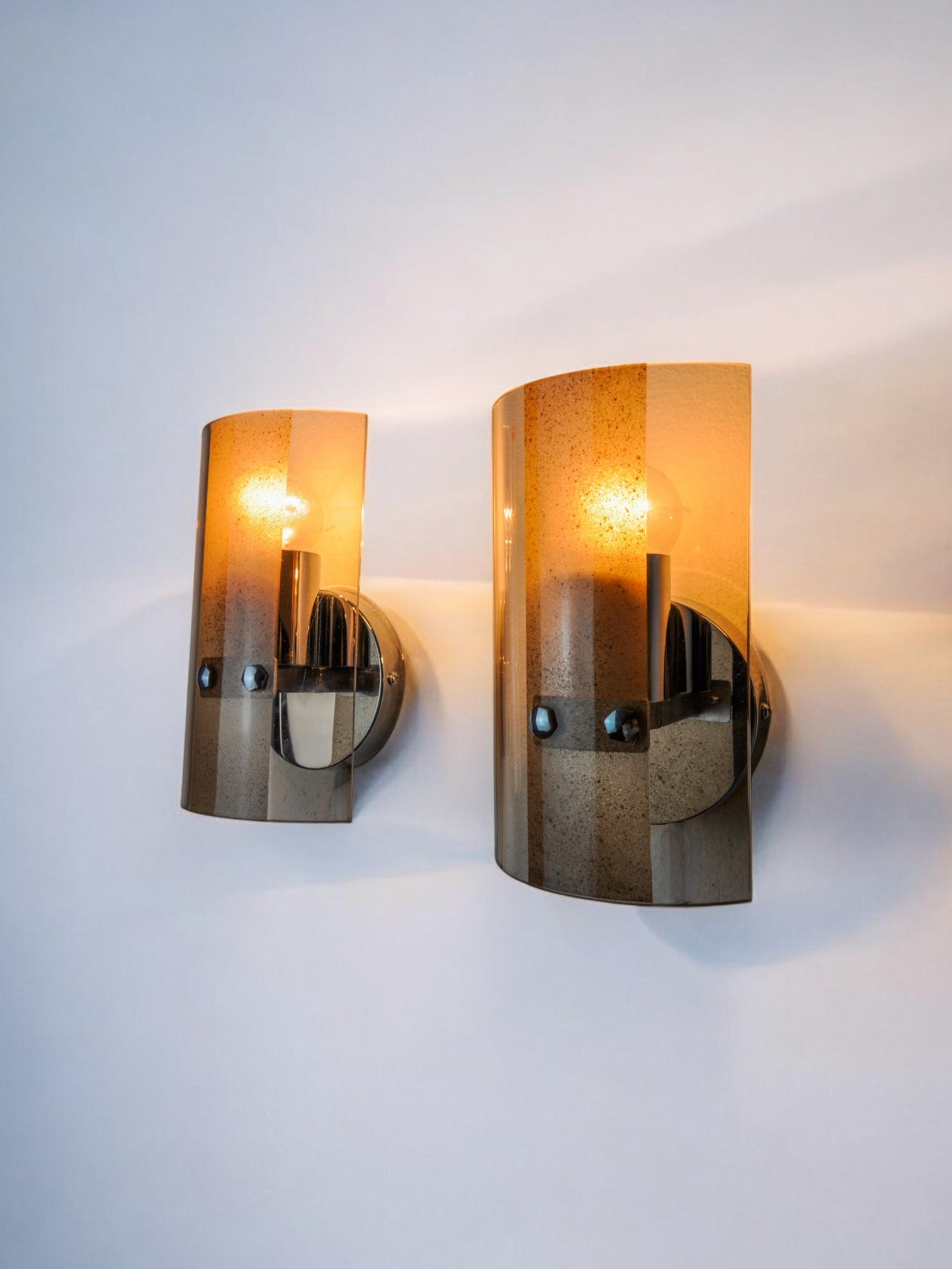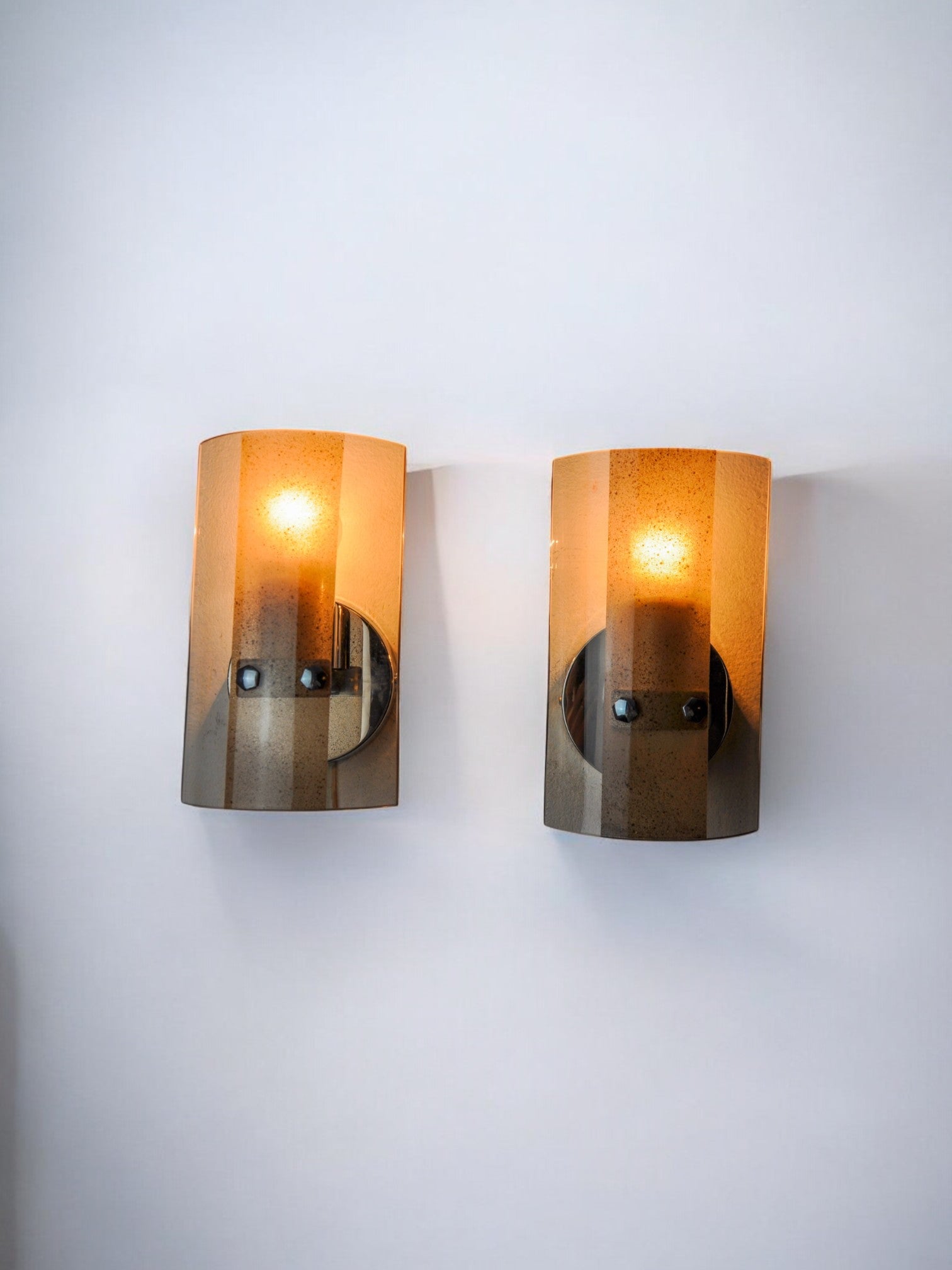 Very nice pair of veca wall lamps produced in italy in the 70s. Wall lamps composed of pink cut glass plates and a chrome structure. Unique object that will illuminate wonderfully and bring a real design touch to your interior. Verified electricity, time mark consistent with the age of the object. Easy installation, cables not visible. We adapt electricity for American market at no costs. Please make sure to request it when ordering. Lightning should always be checked and installed by a professional in all cases. Malamar declines any responsibility.