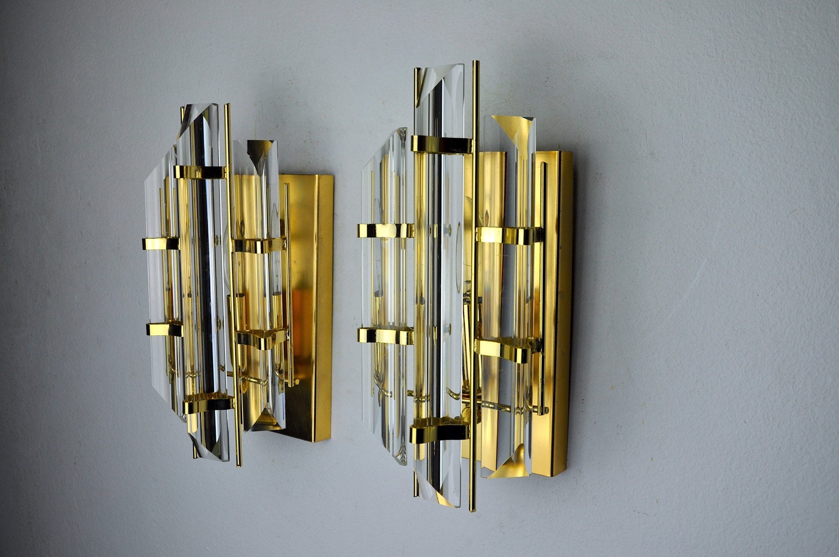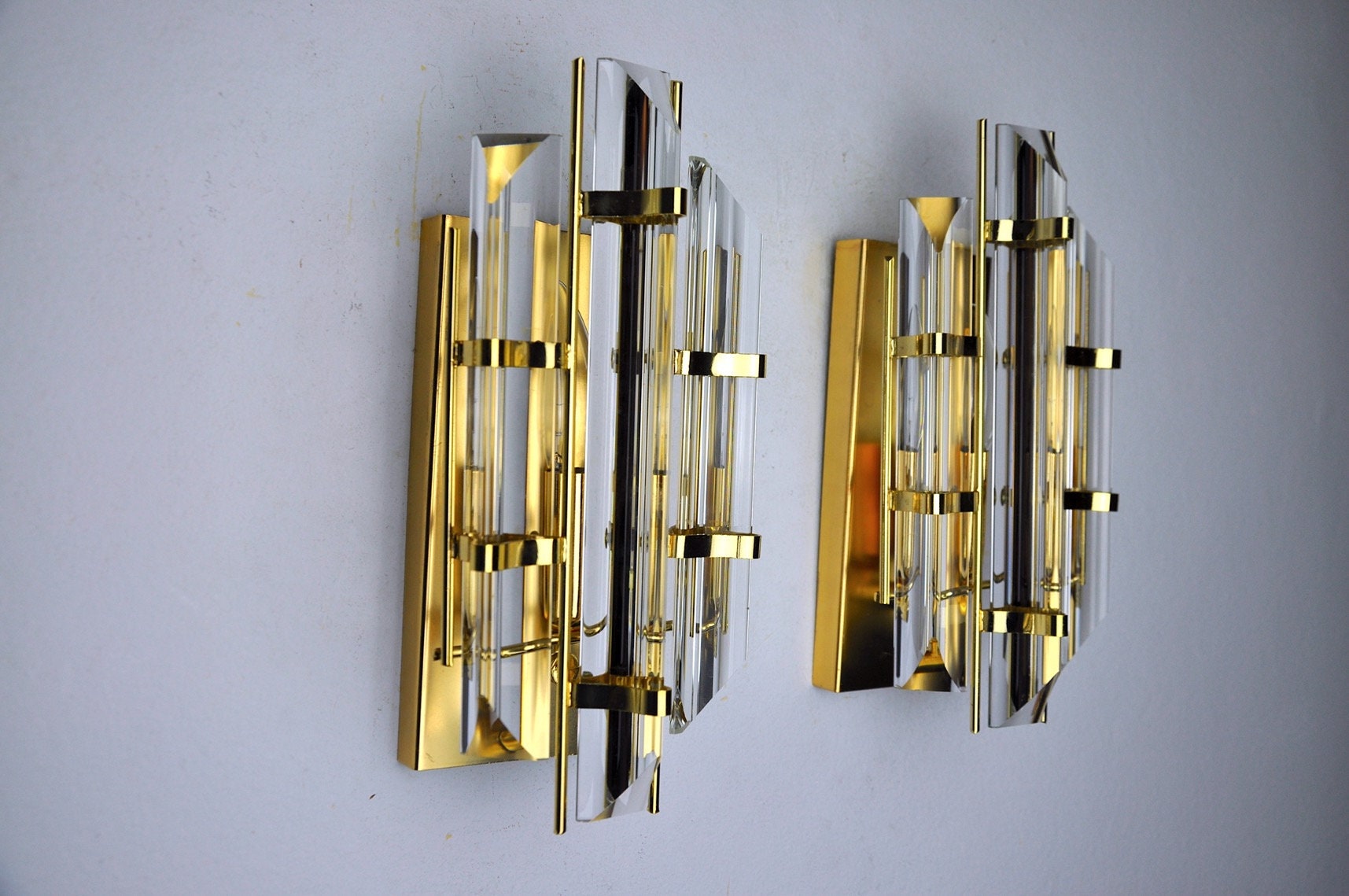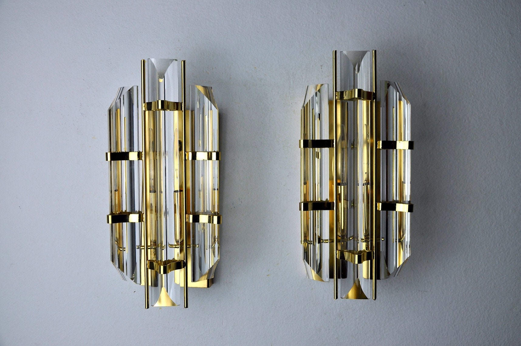 Very nice pair of venini wall lights produced in italy in the 70s. Cut glass and gilt metal structure. Unique object that will illuminate wonderfully and bring a real design touch to your interior. Electricity checked, mark of time in accordance with the age of the object. Easy installation, cables not visible. Ref: 845. We adapt electricity for American market at no costs. Please make sure to request it when ordering. Lightning should always be checked and installed by a professional in all cases. Malamar declines any responsibility.