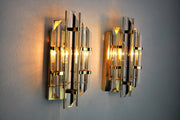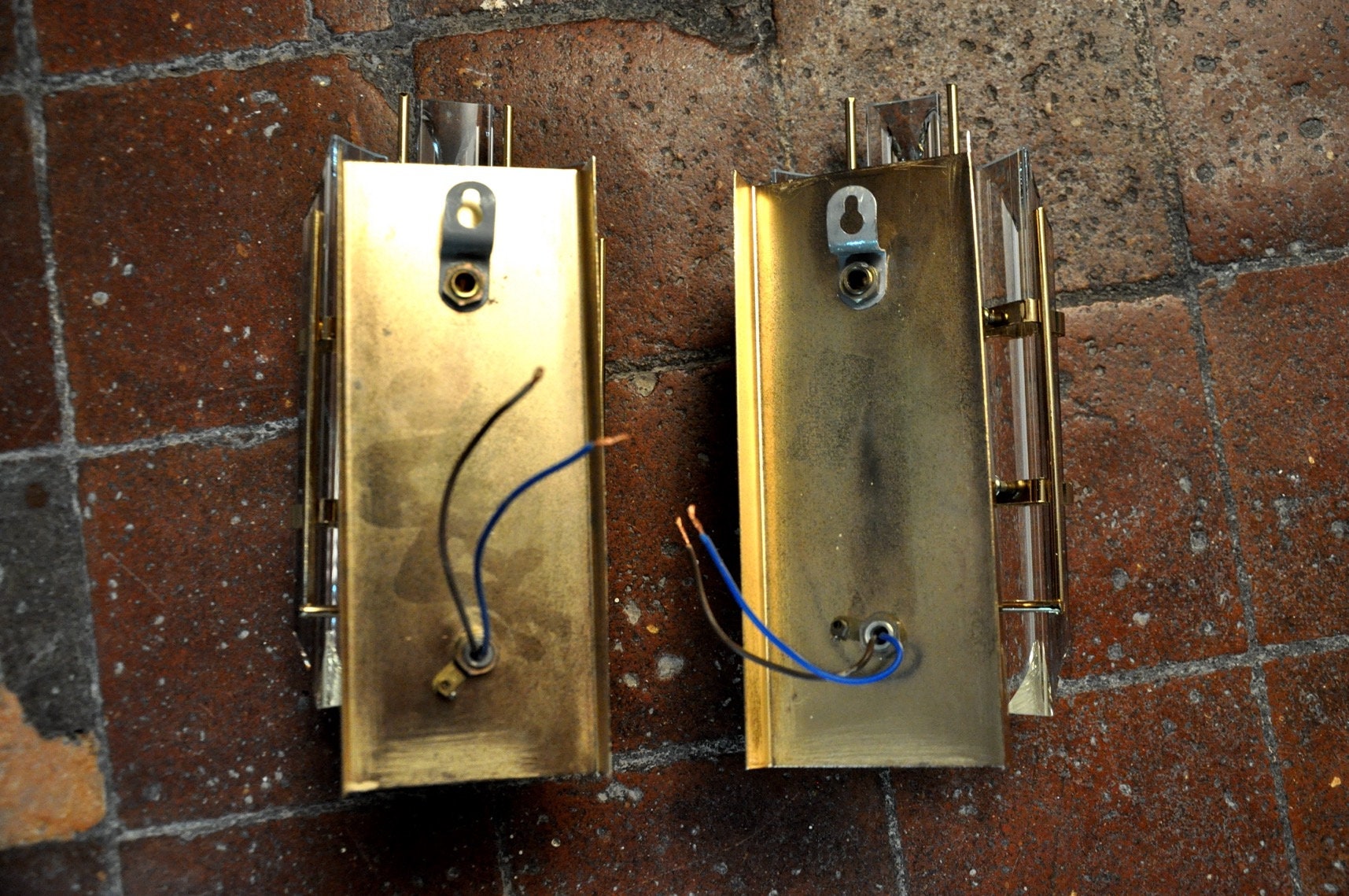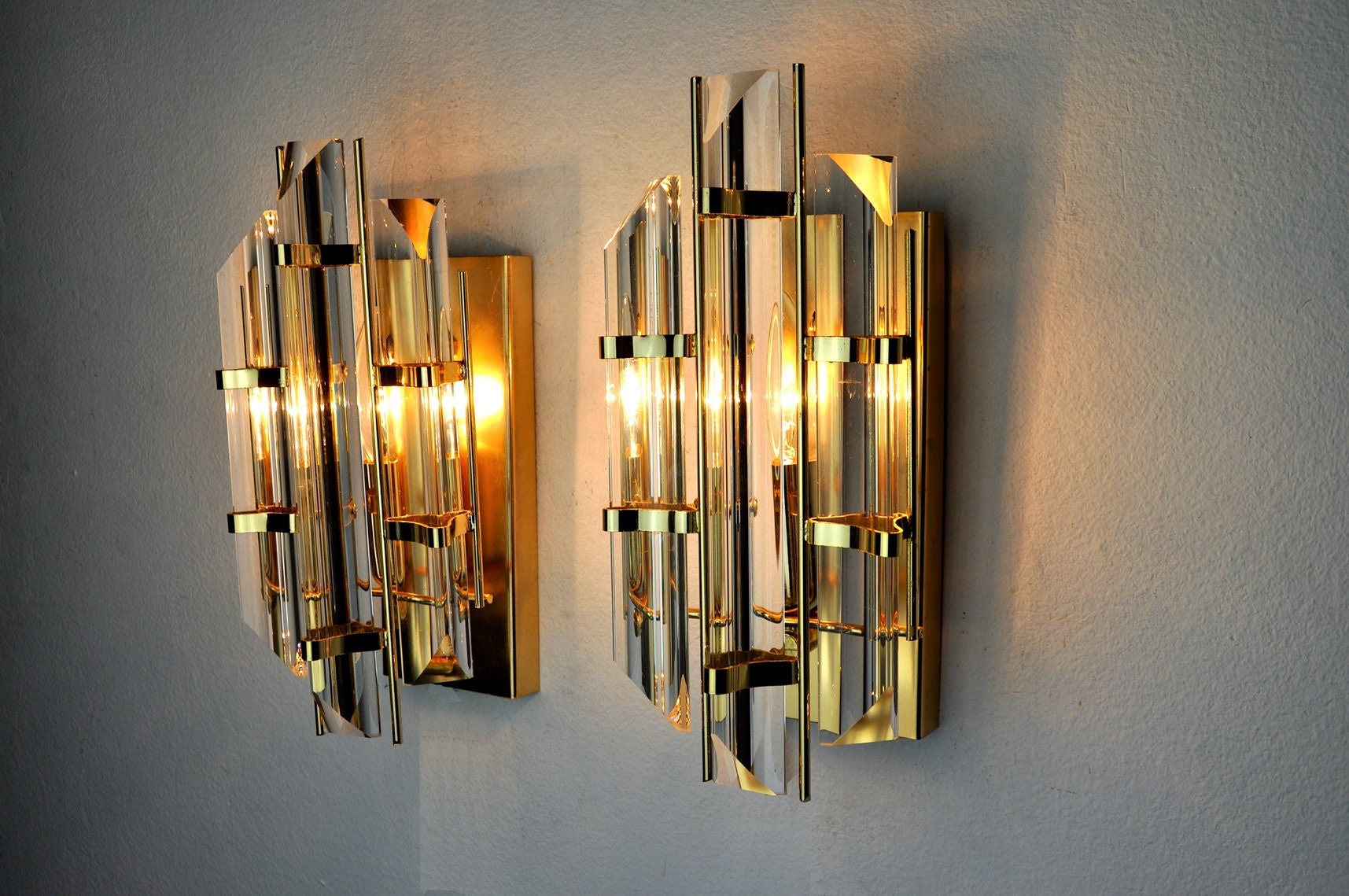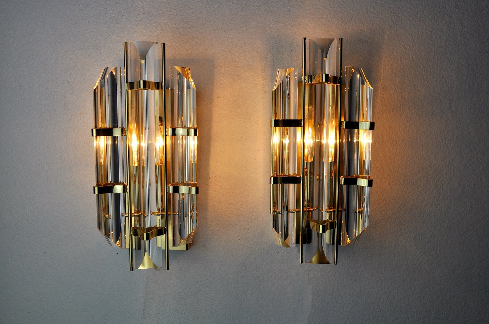 Very nice pair of venini wall lights produced in italy in the 70s. Cut glass and gilt metal structure. Unique object that will illuminate wonderfully and bring a real design touch to your interior. Electricity checked, mark of time in accordance with the age of the object. Easy installation, cables not visible. Ref: 845. We adapt electricity for American market at no costs. Please make sure to request it when ordering. Lightning should always be checked and installed by a professional in all cases. Malamar declines any responsibility.