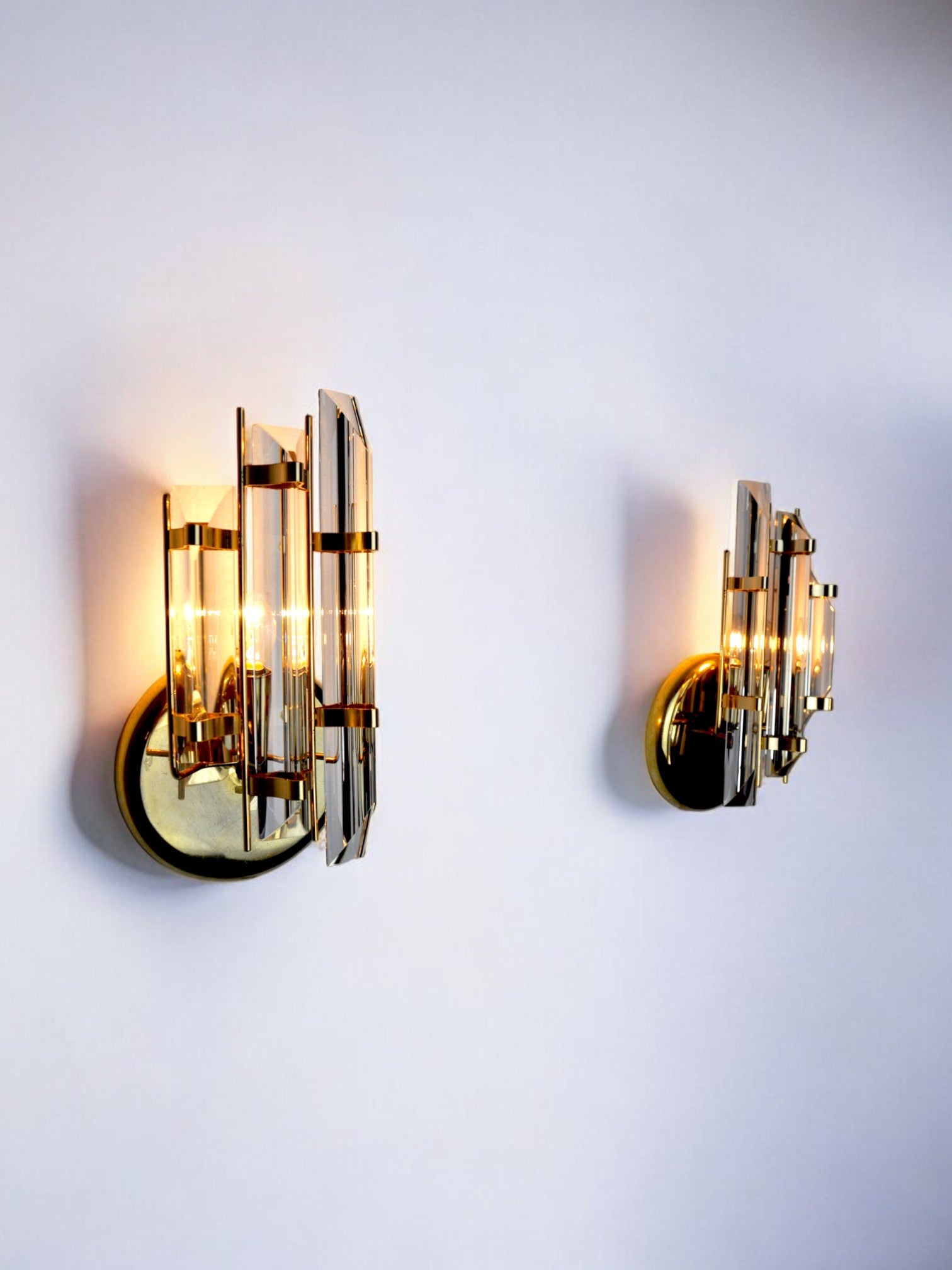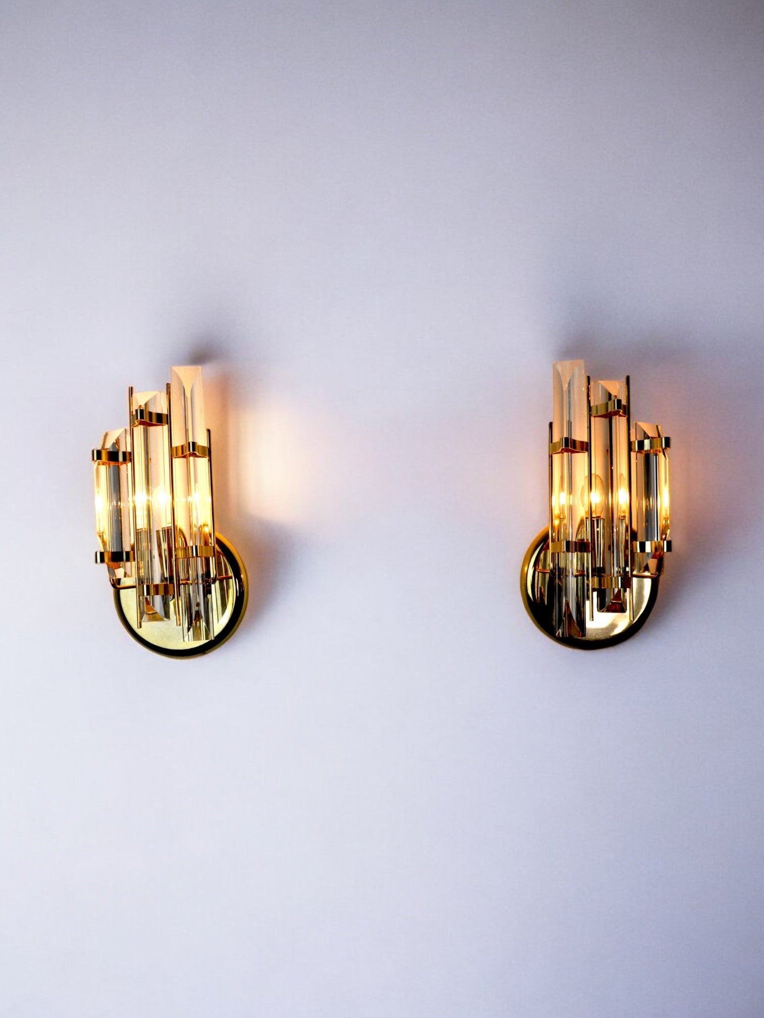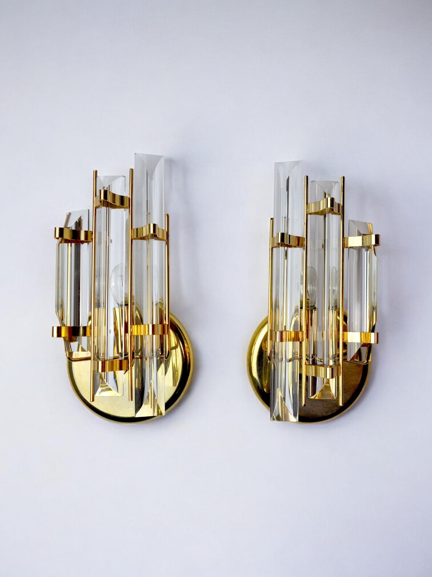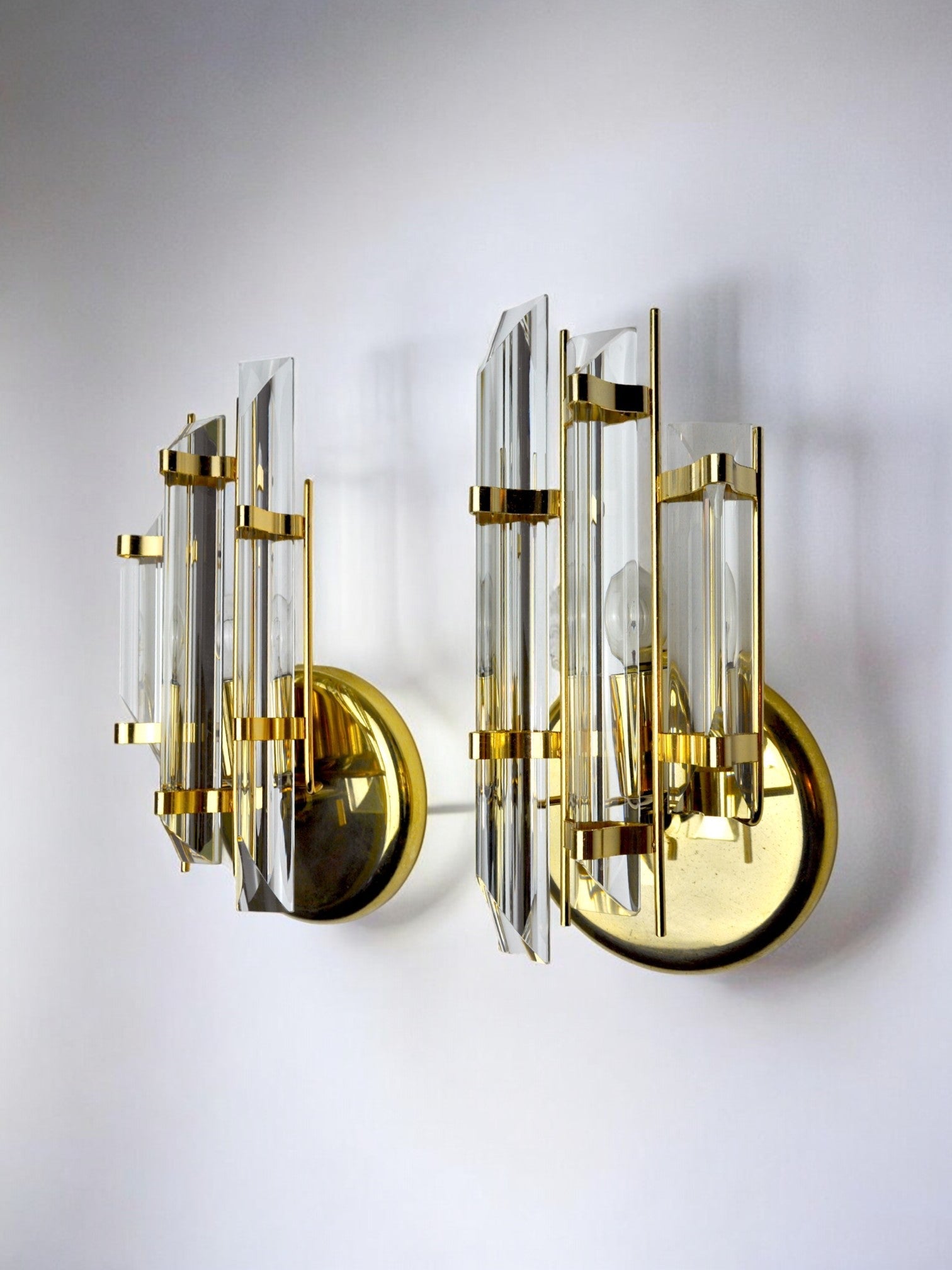 Very nice pair of venini wall lights produced in italy in the 80s. Cut glass and gilt metal structure. Unique object that will illuminate wonderfully and bring a real design touch to your interior. Electricity checked, mark of time in accordance with the age of the object. Easy installation, cables not visible. Ref: 829. We adapt electricity for American market at no costs. Please make sure to request it when ordering. Lightning should always be checked and installed by a professional in all cases. Malamar declines any responsibility.