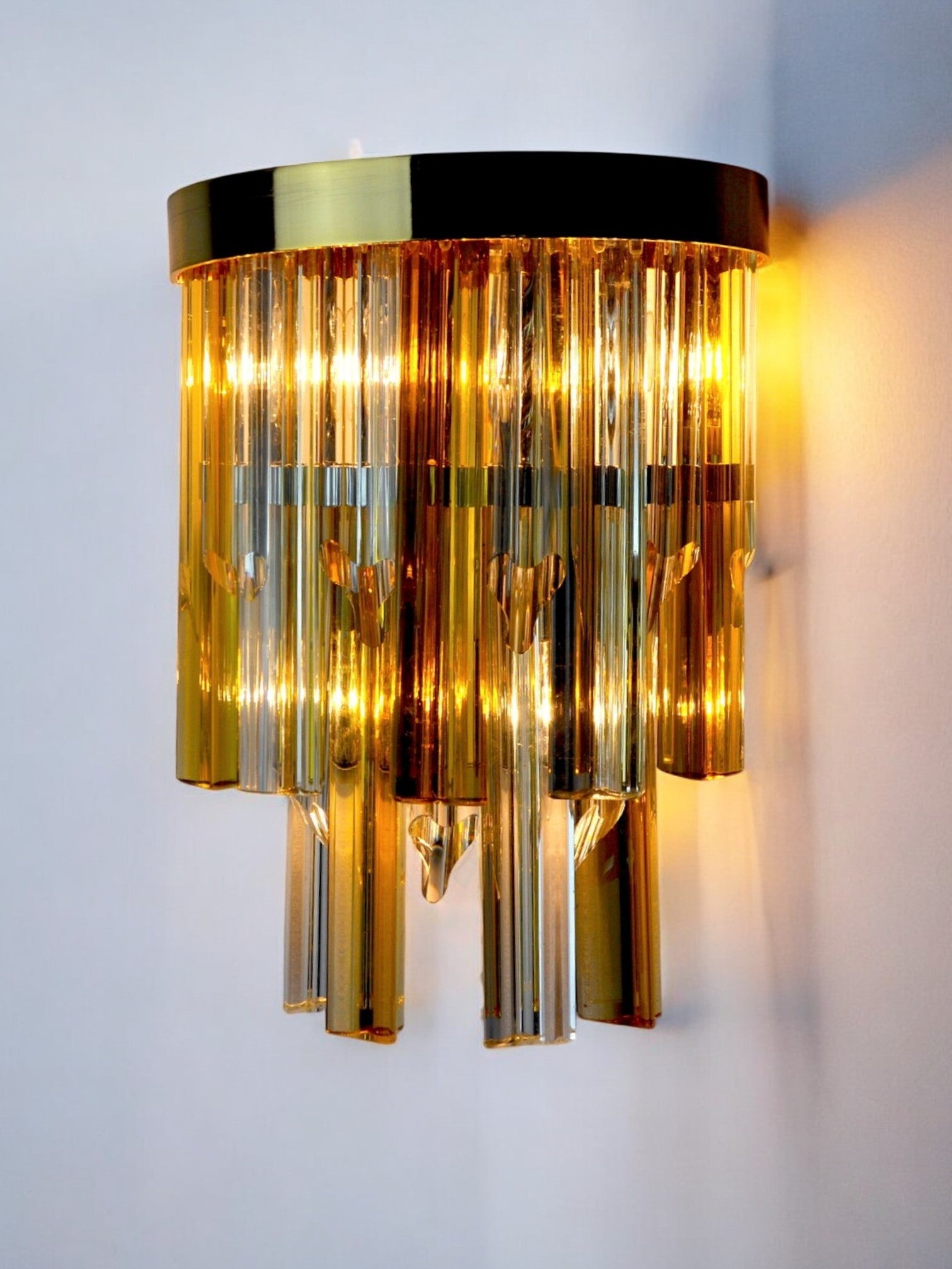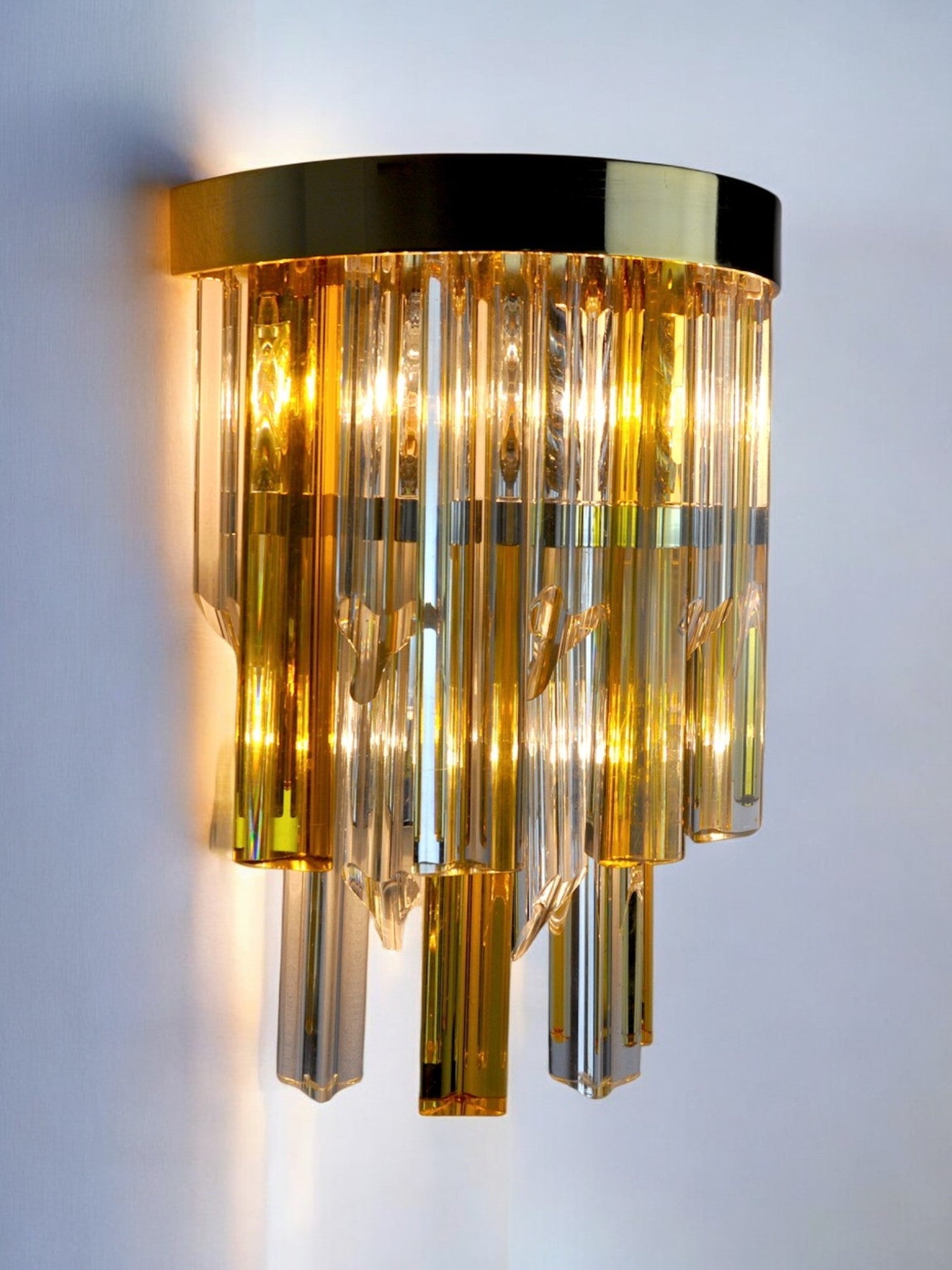 Rare and large sconce attributed to Paolo Venini two-tone dating from the 70s. Murano glass and golden metal structure. Unique object that will illuminate and bring a real design touch to your interior. Electricity verified, mark of time relative to the age of the object. Easy installation. We adapt electricity for American market at no costs. Please make sure to request it when ordering. Lightning should always be checked and installed by a professional in all cases. Malamar declines any responsibility.