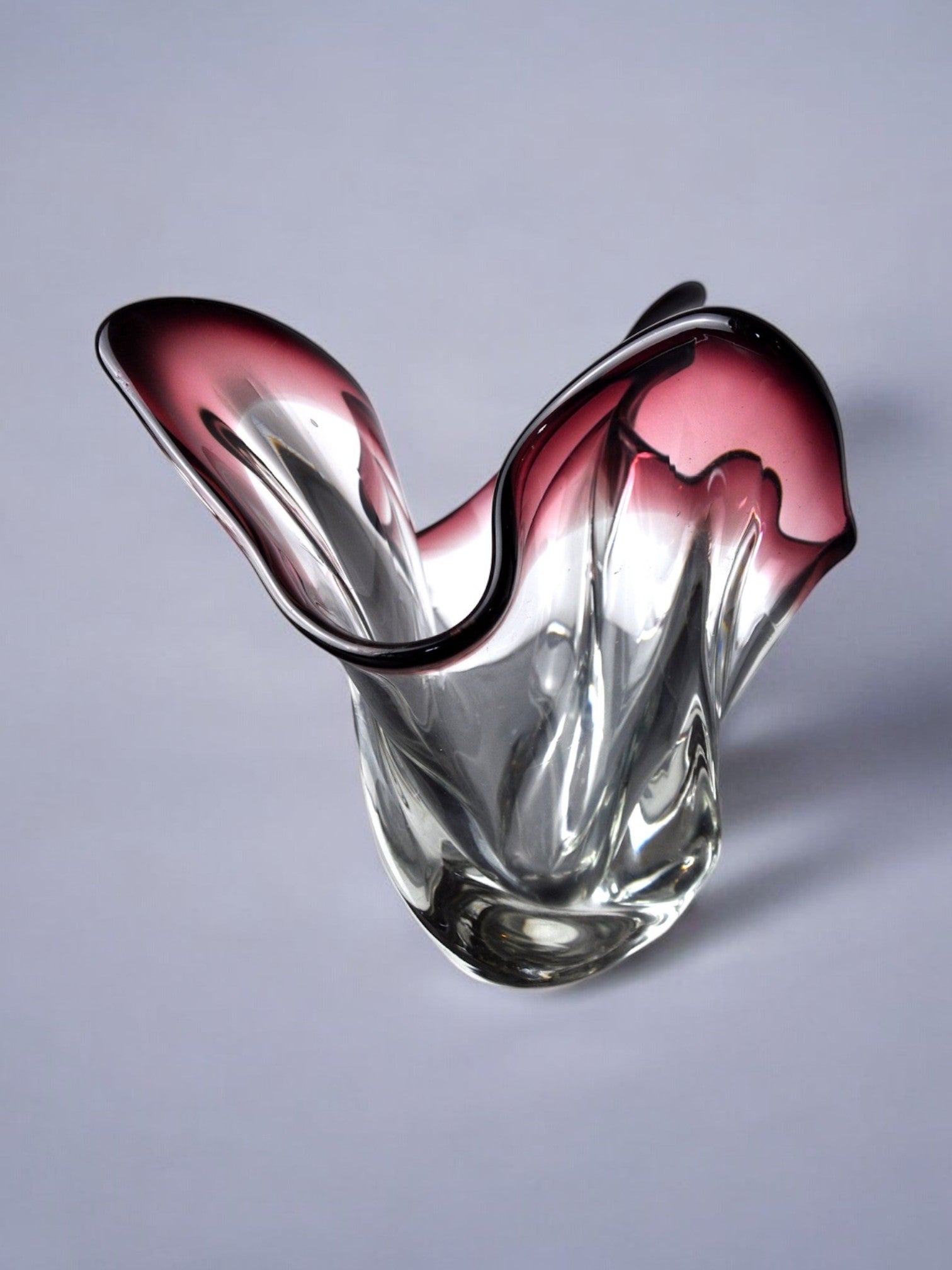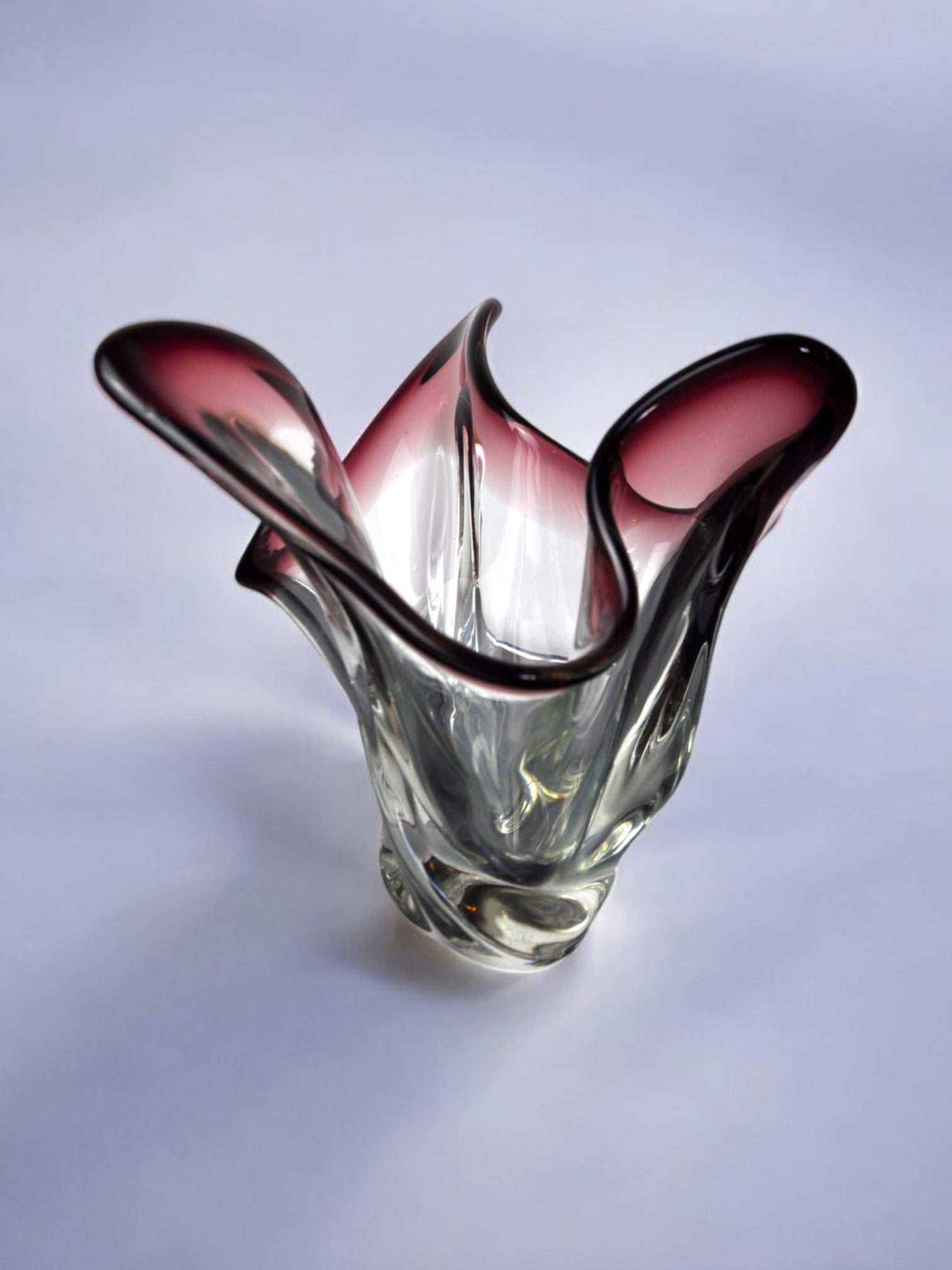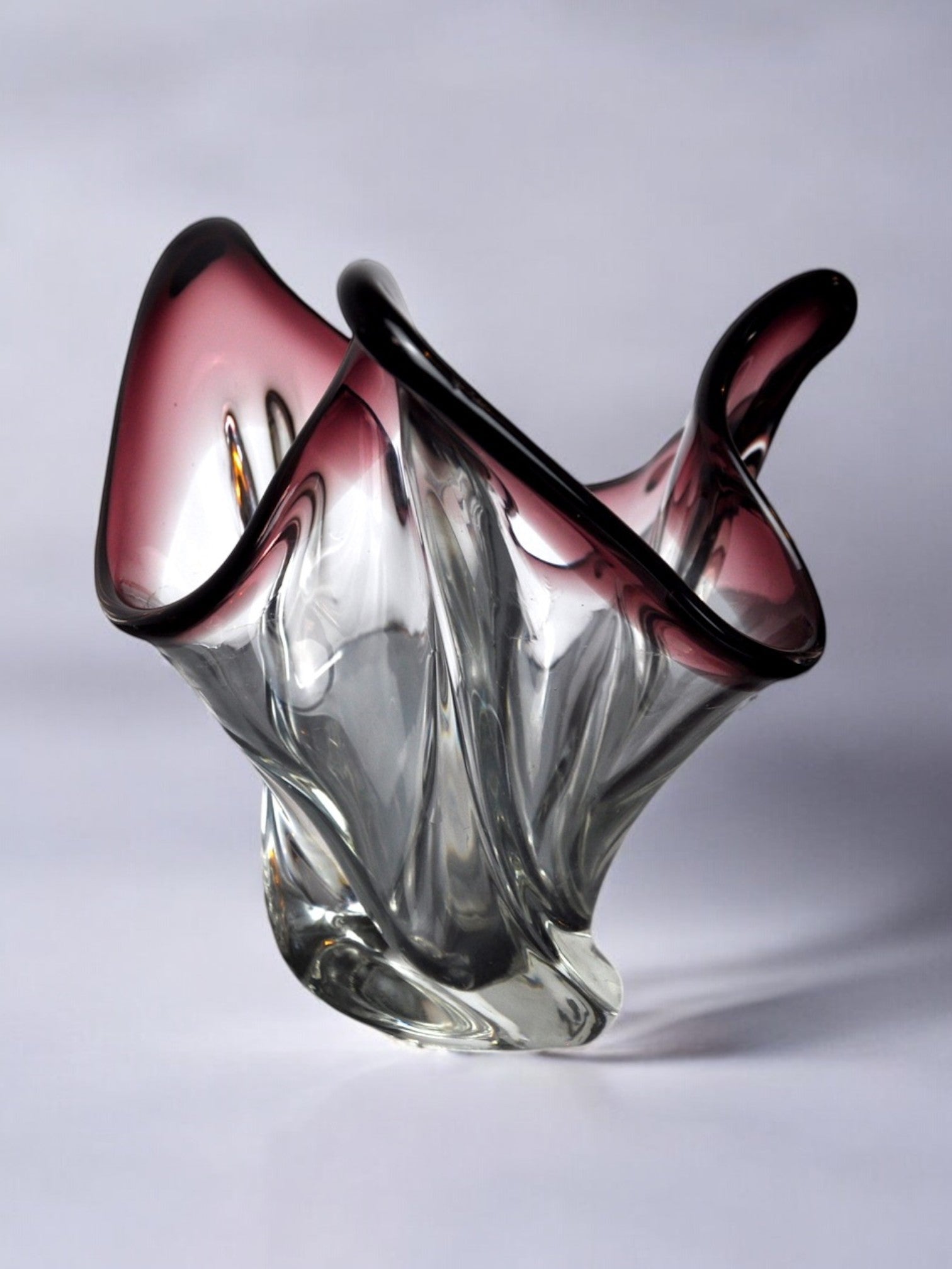 Hand blown sommerso purple and clear italian art glass vase. Attributed to seguso, murano italy, 1960s. This small, colorful vase has a beautiful design with drawn details and a ribbed edge using the sommerso technique. Use it as a key deposit, decorative vase or centerpiece. Display it with other murano glass pieces to create a colorful ensemble. Ref: 685.