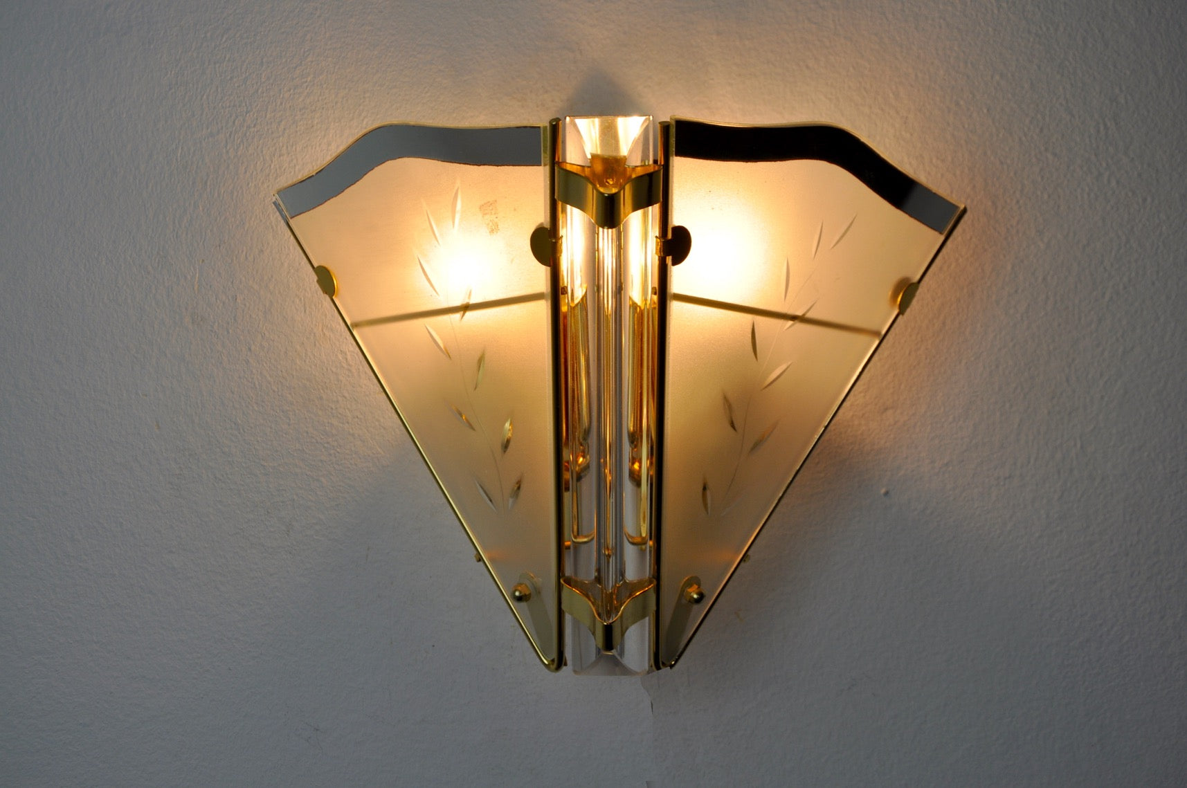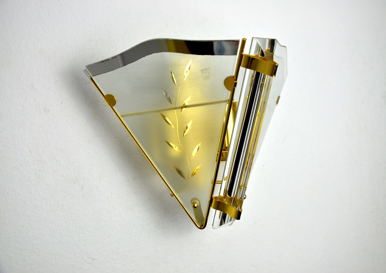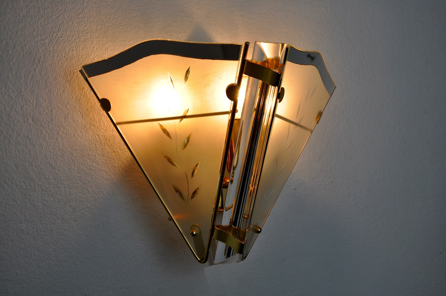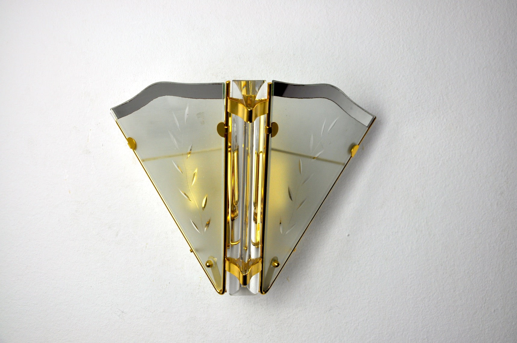 Very beautiful regency wall lamp produced in italy in the 80s. Engraved glass and gilded metal structure. A unique object that will illuminate wonderfully and bring a real design touch to your interior. Electricity checked, mark of time relating to the age of the object. Wiring not apparent. Ref: 164. We adapt electricity for American market at no costs. Please make sure to request it when ordering. Lightning should always be checked and installed by a professional in all cases. Malamar declines any responsibility.