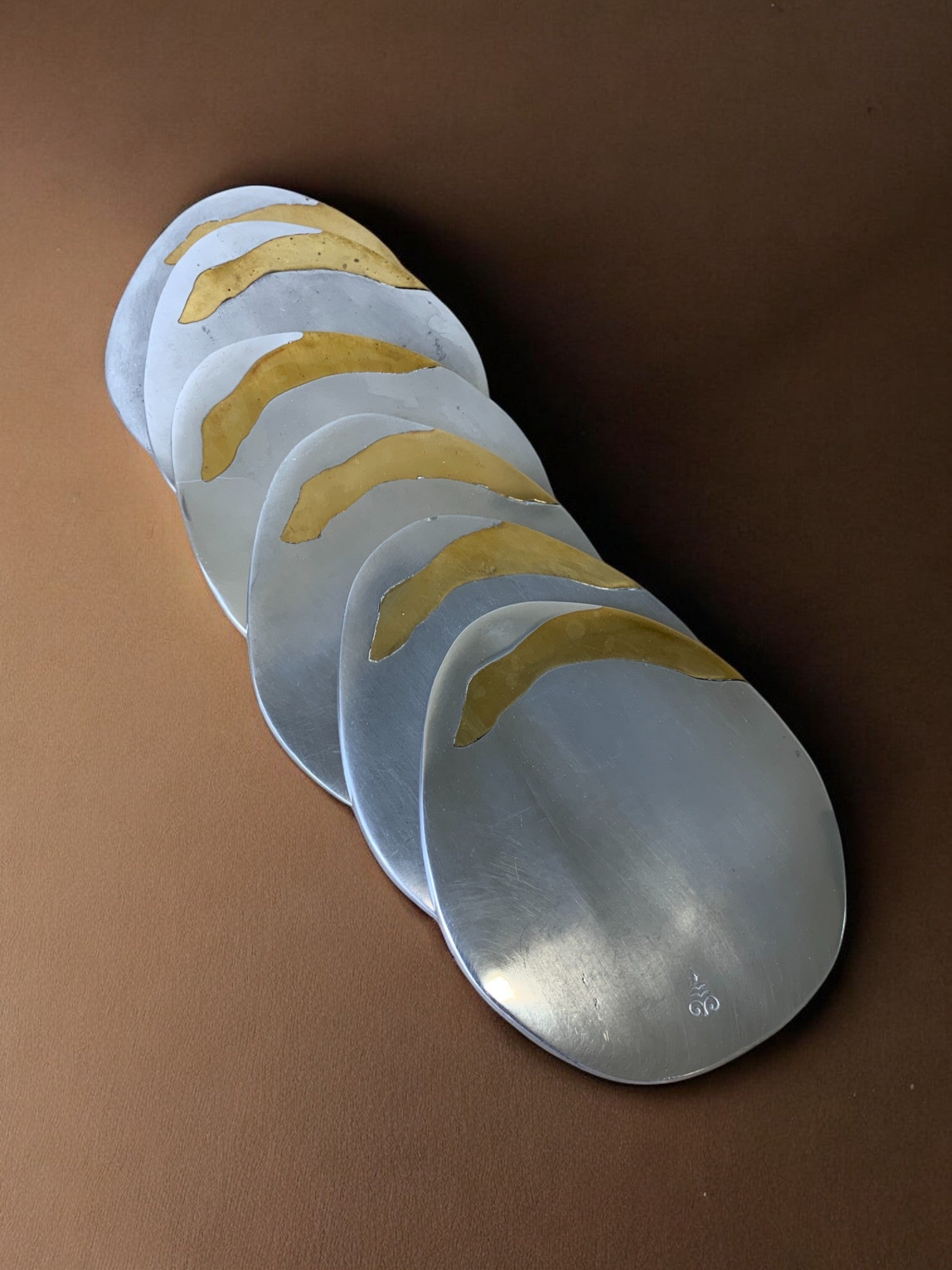 Great set of 6 brutalist coasters by Garcia Marquez, designed and handcrafted in spain in the 1970s. Bronze and aluminum objects. Rare design object that will elevate your interior. Stamped item. Ref: 2228.