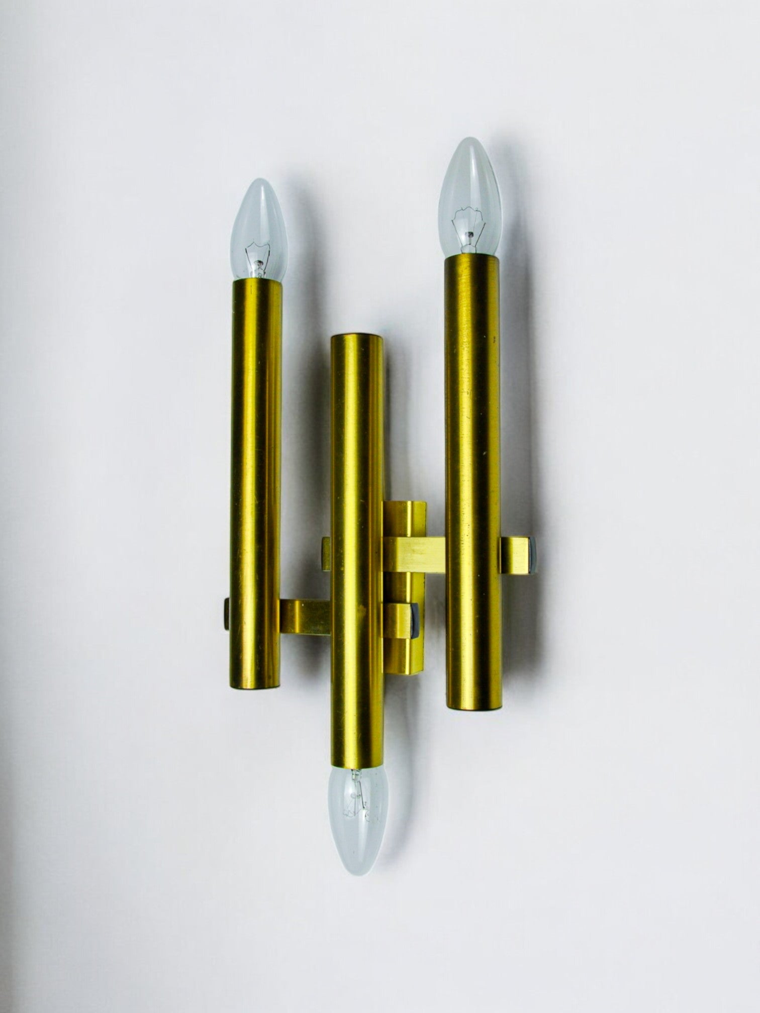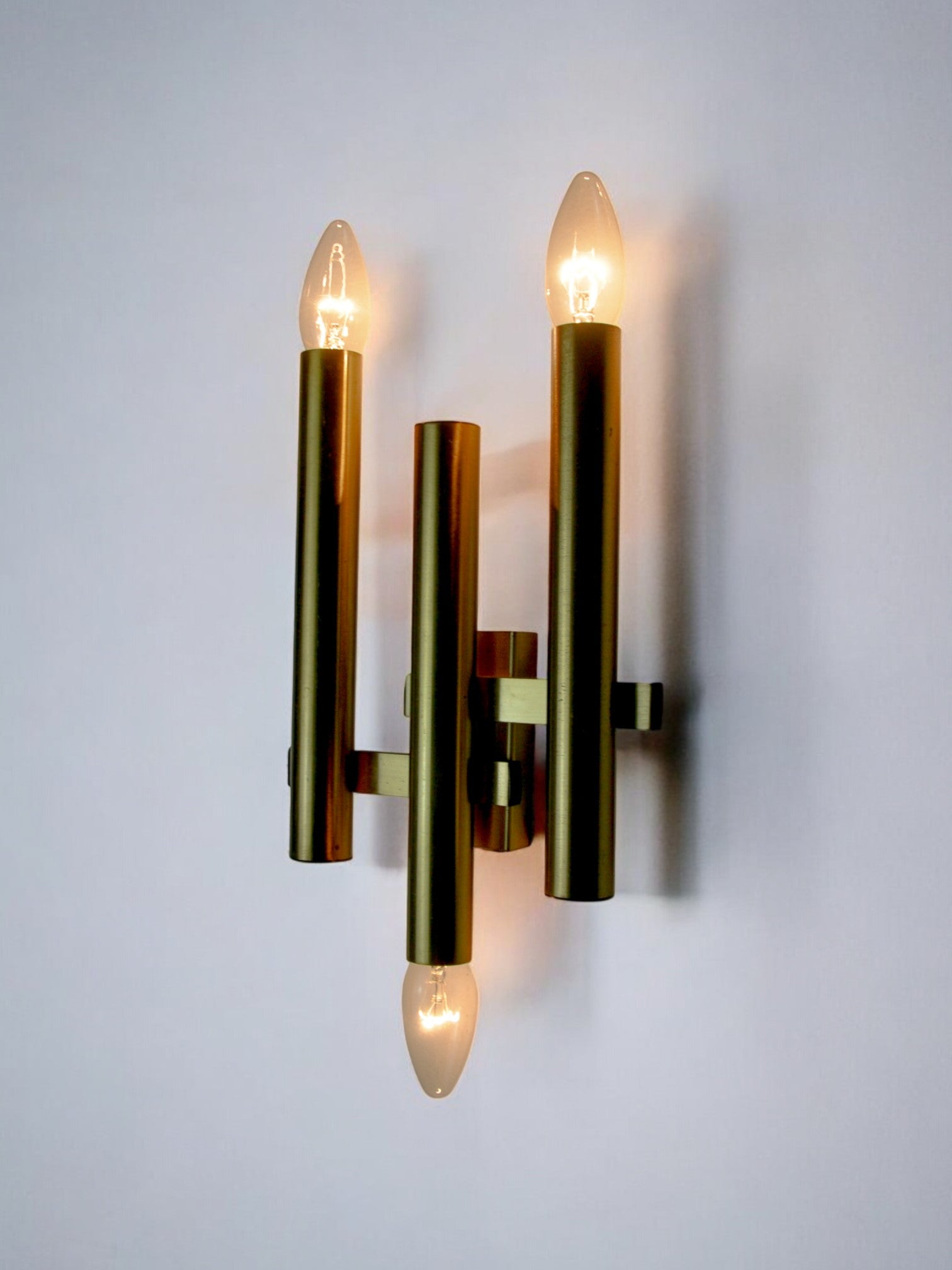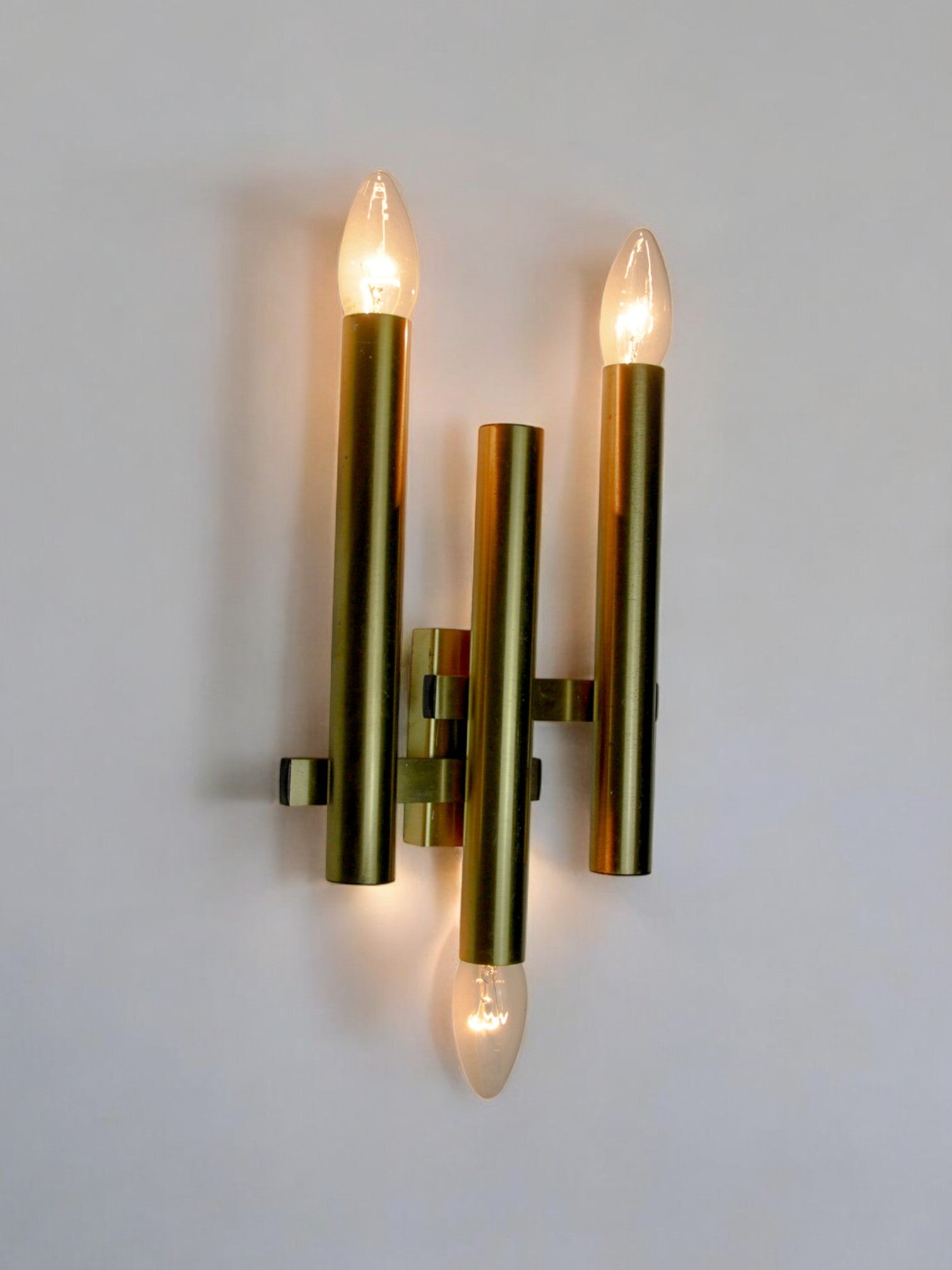 Very beautiful tubular wall light from the Sciolari house dating from the 1970s. Brass structure composed of three arms and 3 light points. Rare design object that will illuminate your interior wonderfully. Electricity verified, time marks consistent with the age of the object. Easy installation, invisible cable. Ref: 1505. We adapt electricity for American market at no costs. Please make sure to request it when ordering. Lightning should always be checked and installed by a professional in all cases. Malamar declines any responsibility.