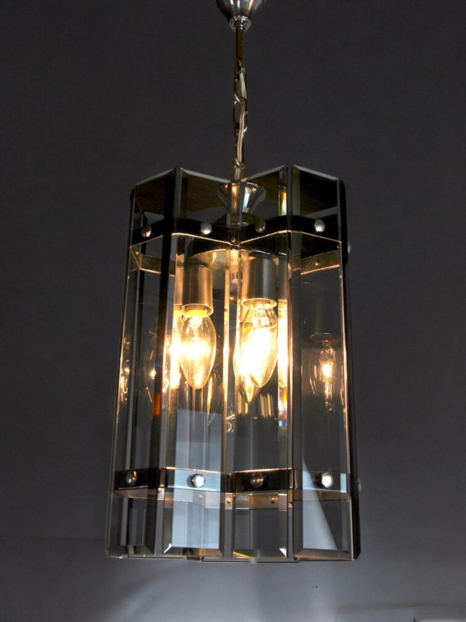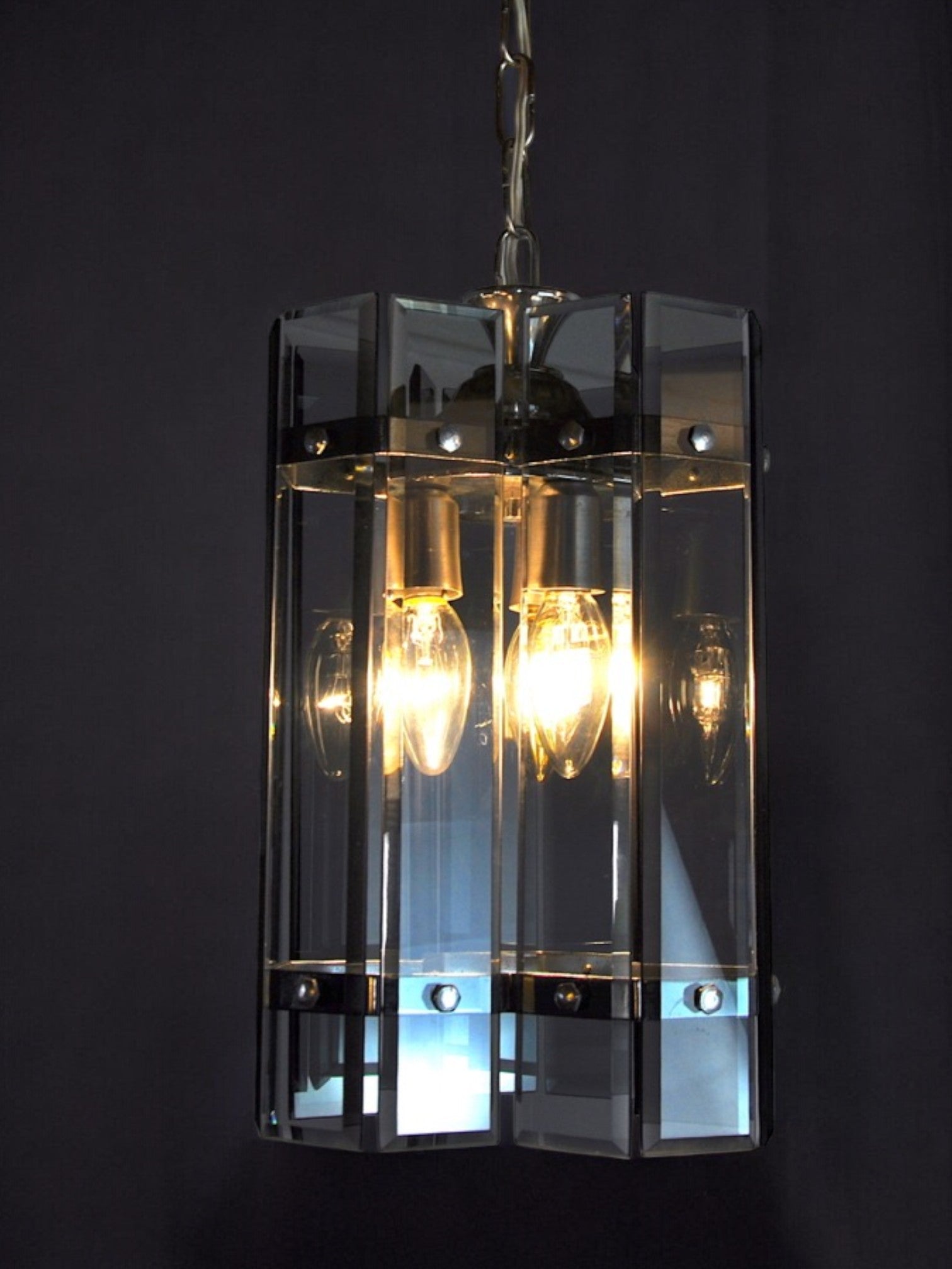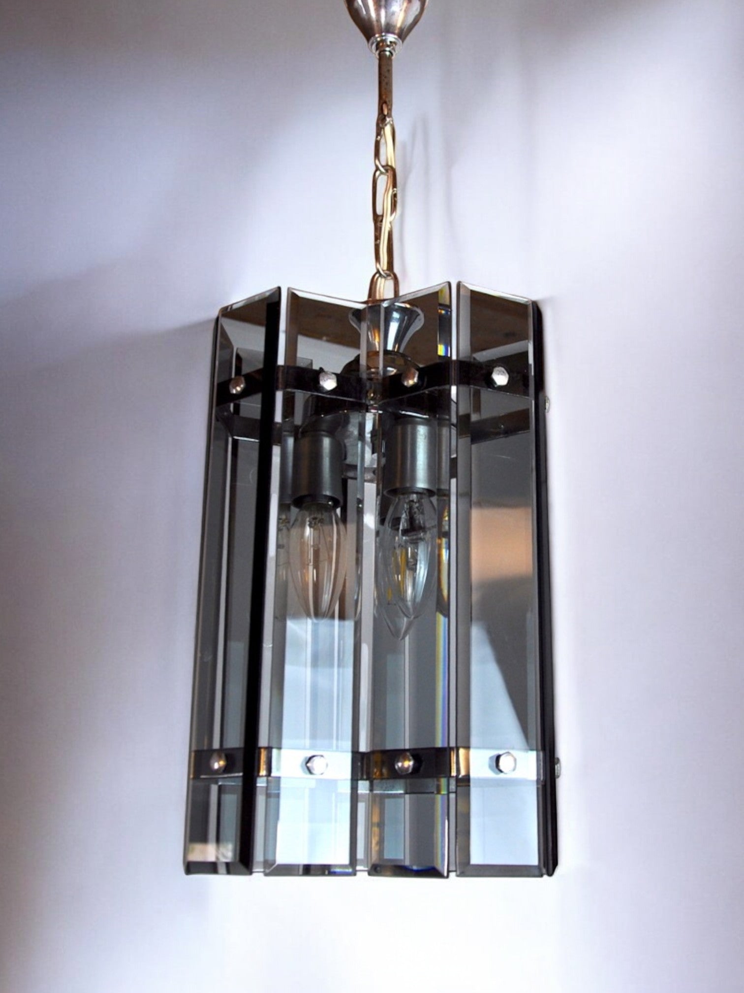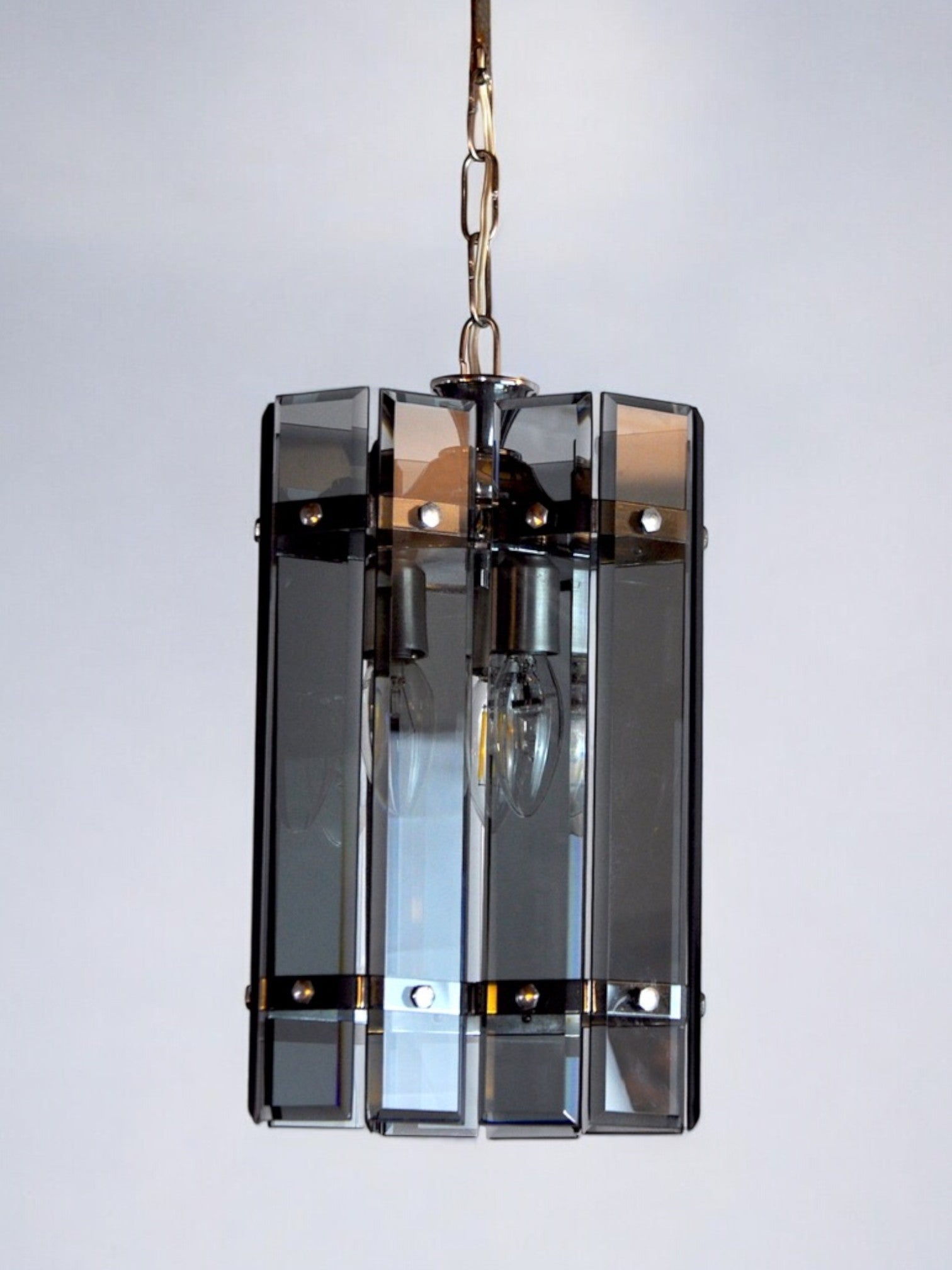 Veca chandelier designed and produced in the 70s in murano, italy. Chrome structure and black murano glass crystals in good condition. Rare design object that will illuminate your interior wonderfully. Electricity checked, marks of time relating to the age of the object. The height of the chandelier can be adapted according to your needs. Ref: 692. We adapt electricity for American market at no costs. Please make sure to request it when ordering. Lightning should always be checked and installed by a professional in all cases. Malamar declines any responsibility.