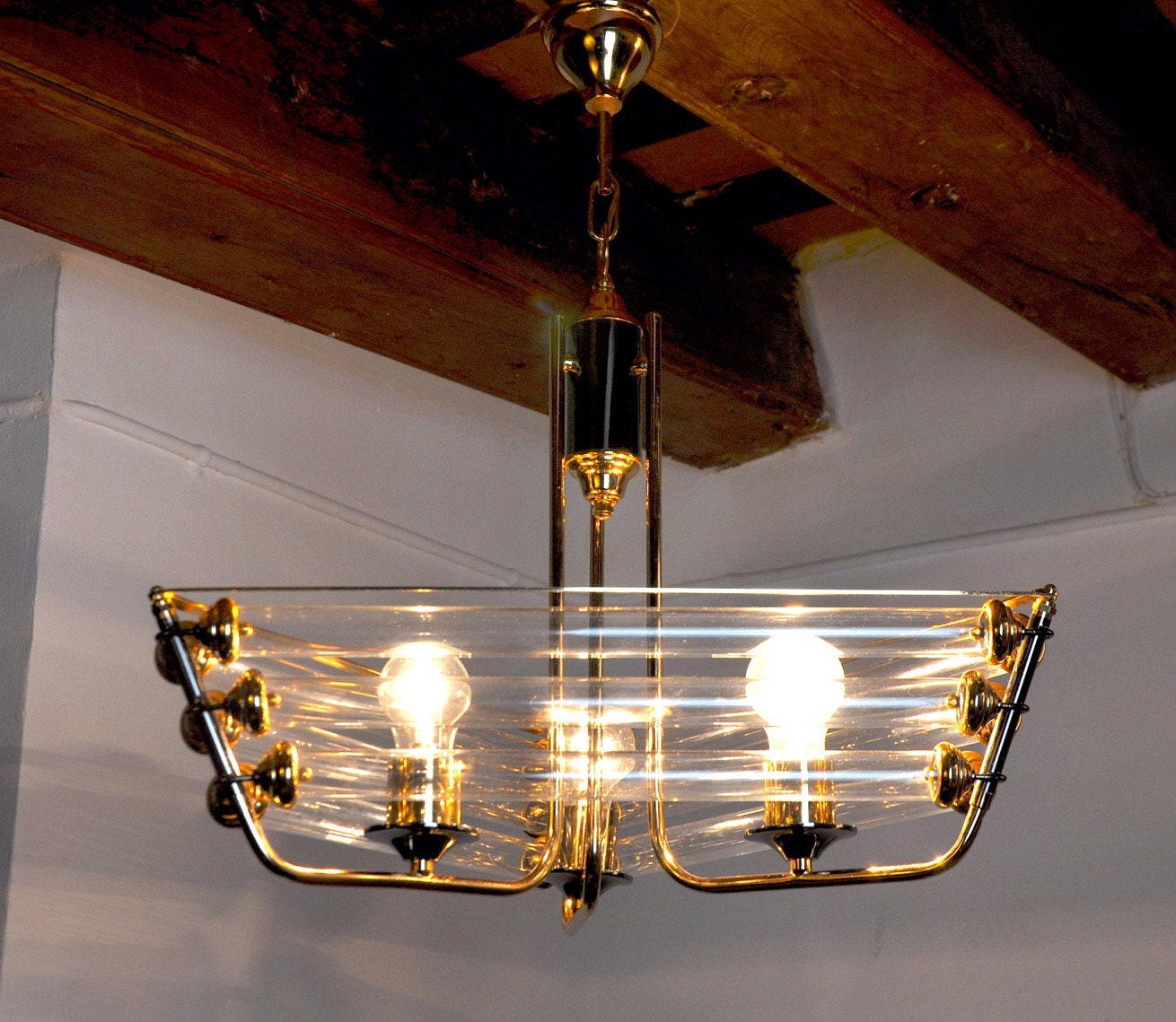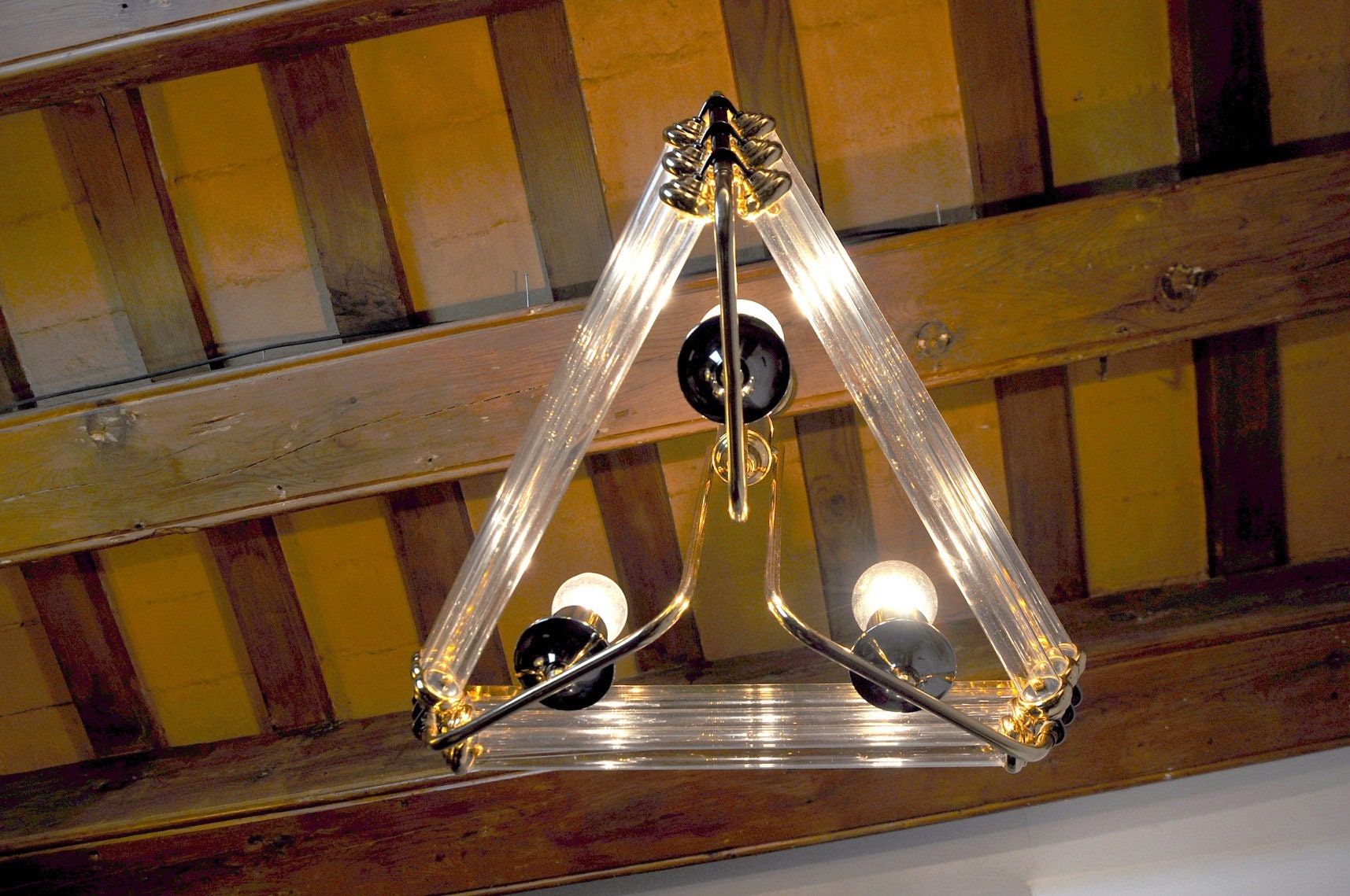 Very rare venini chandelier dating from the 70s composed of murano glass crystals distributed in a triangular shape on a golden metal structure. Unique design object that will illuminate and bring a real design touch to your interior. Electricity checked, crystals in perfect condition, time mark relating to the age of the object. Ref: 598. We adapt electricity for American market at no costs. Please make sure to request it when ordering. Lightning should always be checked and installed by a professional in all cases. Malamar declines any responsibility.