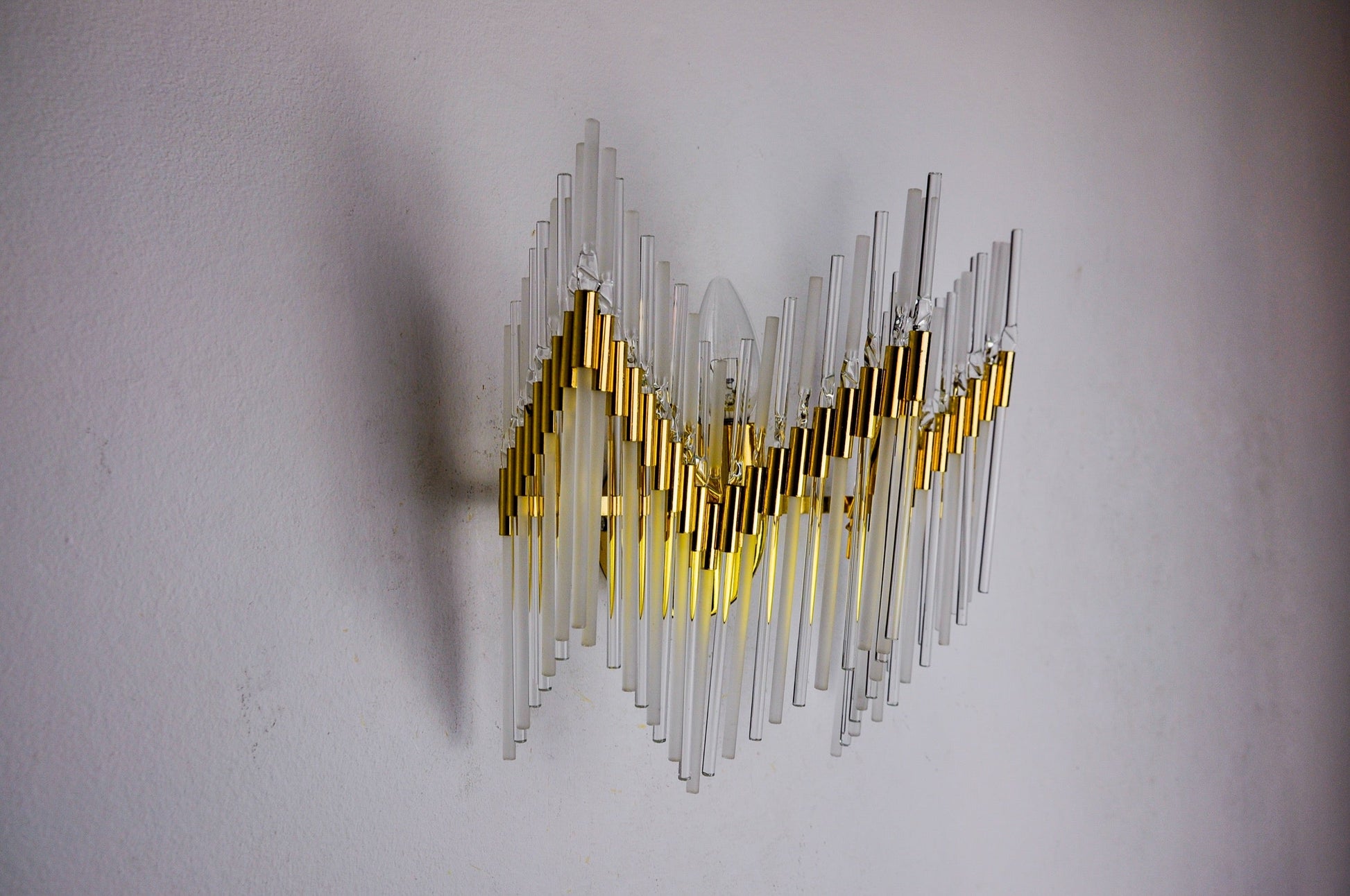 Very beautiful venini wall lamp produced in italy in the 70s. Tubular crystals spread over a gilded metal structure. Unique object that will illuminate wonderfully and bring a real design touch to your interior. Electricity checked, mark of time in accordance with the age of the object. Easy installation, cables not visible. Ref: 969. We adapt electricity for American market at no costs. Please make sure to request it when ordering. Lightning should always be checked and installed by a professional in all cases. Malamar declines any responsibility.