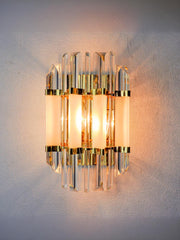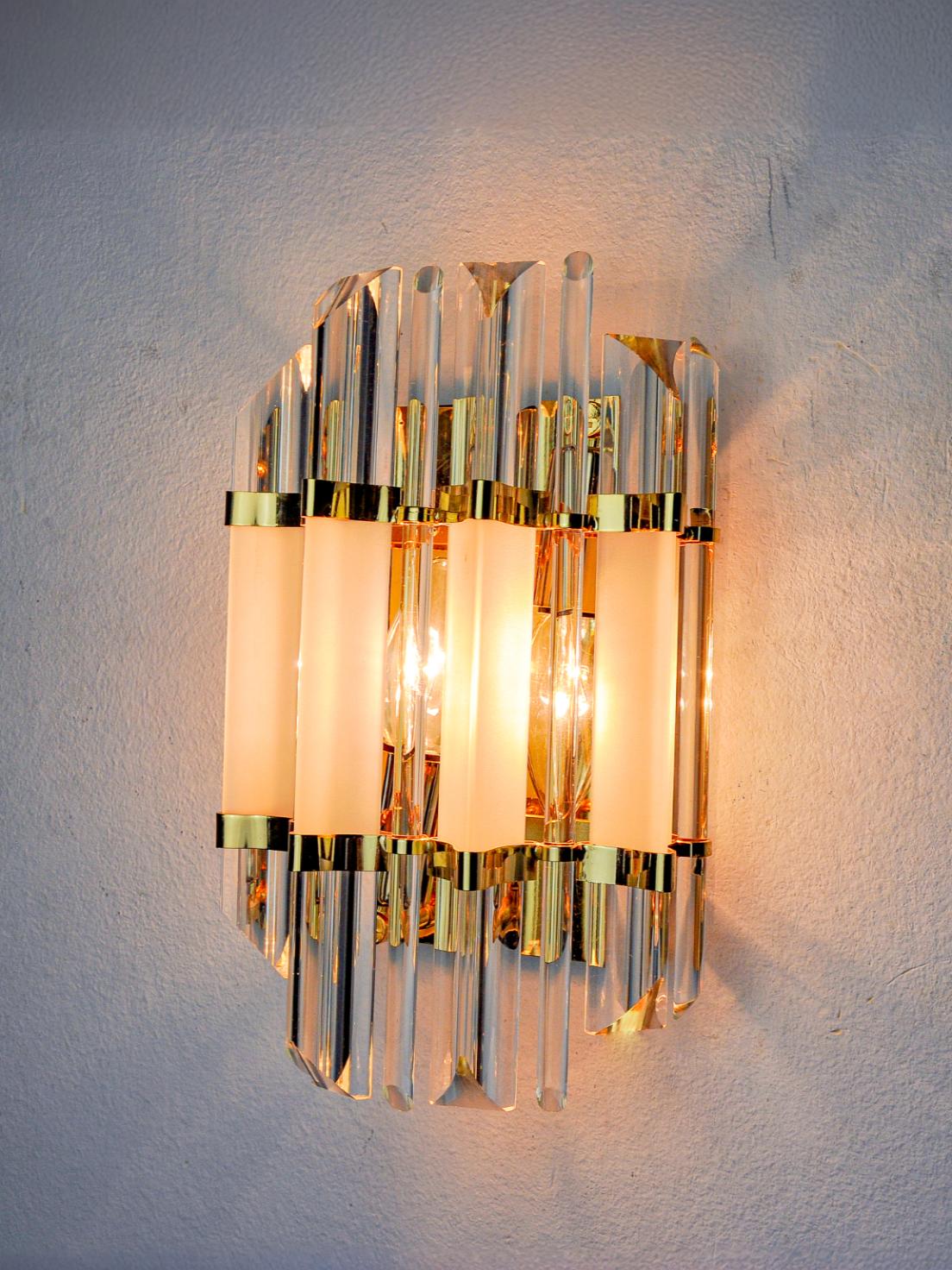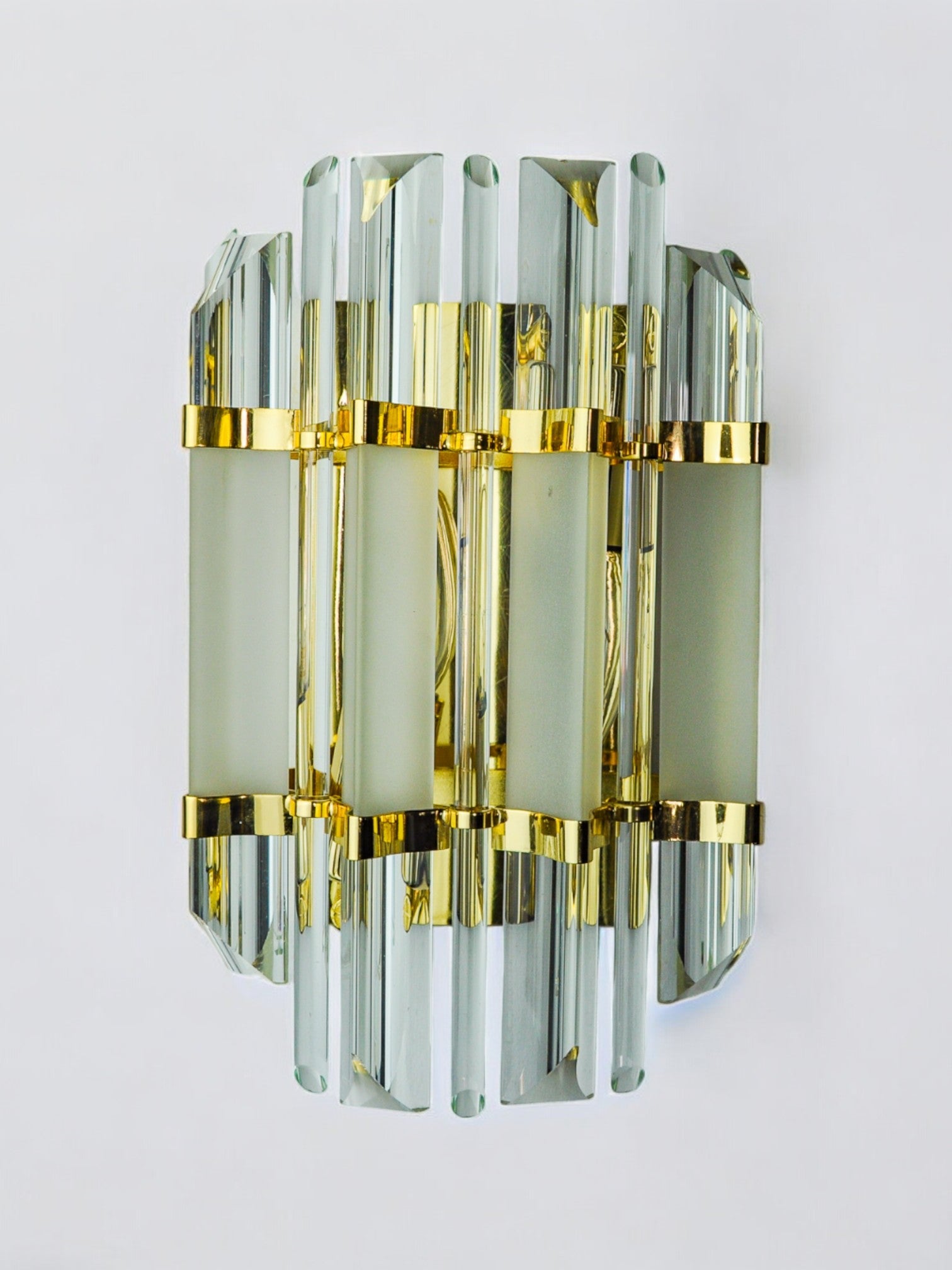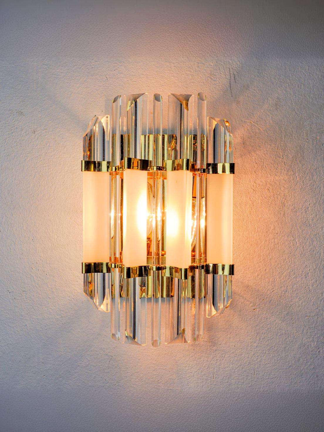 Very beautiful Venini wall lamp produced in Italy in the 70s. Triedi crystals supported by a gold metal structure. Unique object that will illuminate wonderfully and bring a real designer touch to your interior. Electricity checked, time stamp consistent with the age of the object. Easy installation, hidden cables. Ref: 1281. We adapt electricity for American market at no costs. Please make sure to request it when ordering. Lightning should always be checked and installed by a professional in all cases. Malamar declines any responsibility.
